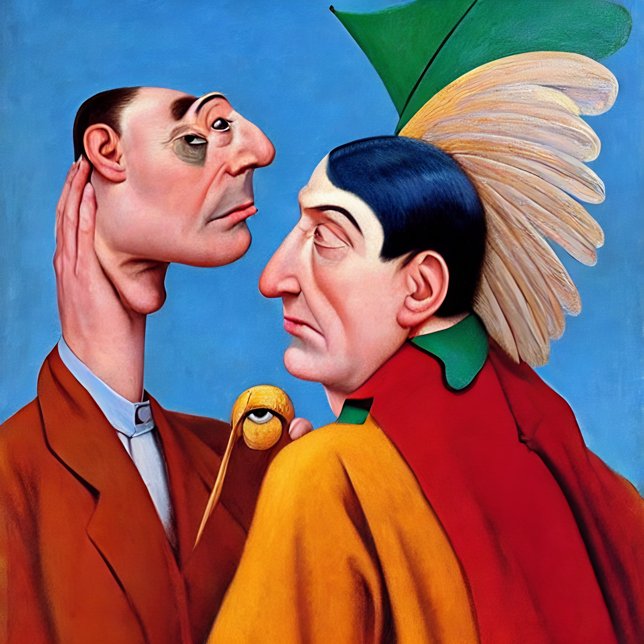 2025 August #005. Two elongated figures face each other across an impossible distance that feels both intimate and vast, their porcelain features catching light against a sky of pure cerulean. The figure on the left, draped in earthen brown, regards their companion with quiet intensity, while the other—crowned with elaborate plumage of cream and emerald—meets this gaze from within cascading crimson robes. Between them hovers a small golden orb, suspended like a word waiting to be spoken, a meaning in transit.