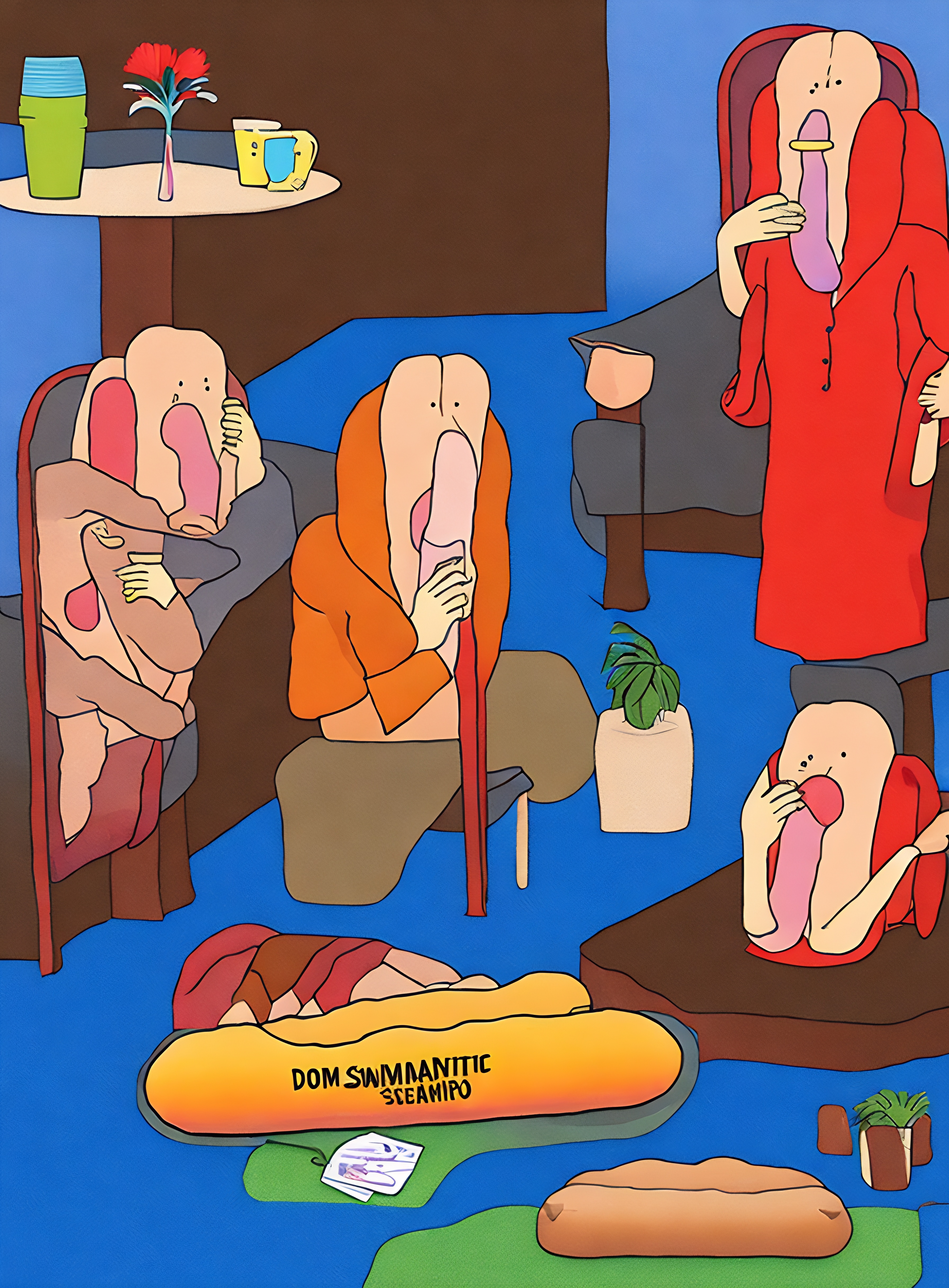 The elongated features create a visual rhythm that unites these inhabitants despite their varied postures and colorful clothing. Each curved appendage appears to carry different weight, different stories, as if meaning itself has taken physical form and grown uniquely for each bearer. At the composition's base, a cheerful yellow form resembling a submarine sandwich introduces an element of delightful incongruity, reminding us that even in the most serious conversations, unexpected elements surface.