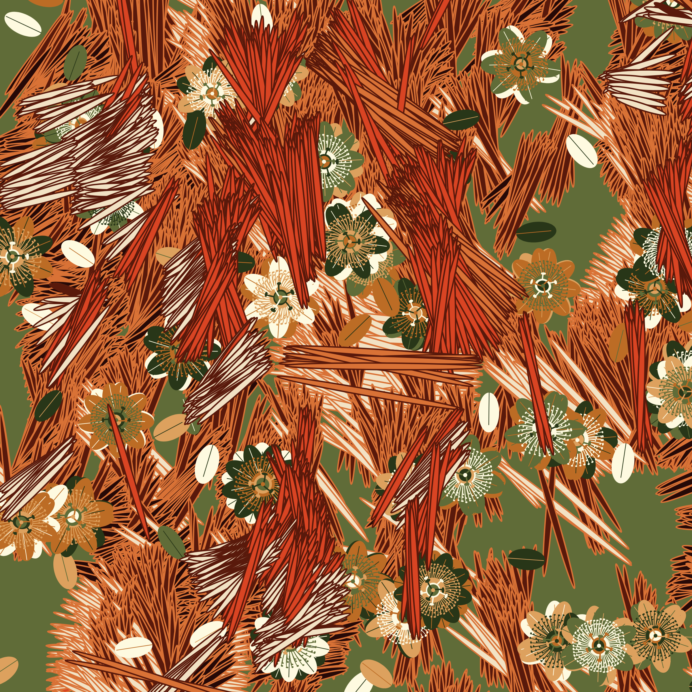 “Fragments of an infinite field” is a compositional system in which an idealized plant species is generated and arranged in a potentially infinite field of foliage. The main environmental parameter of the composition is the determination of a season of the year. The season determines the landscape’s colors and defines specific phenomena for each of them, such as rain in summer, snow in winter, petals falling in autumn, and pollen in spring. The flower has several possible variables, which can be macro aspects, affecting the entire population of the species, or micro, affecting each individual of the species differently. For example, the number of petals can be equal in all individuals or not. The number of filaments and other structures of the flower can undergo minor deviations, generating small mutations. The confusion between the figure (plant) and the background (earth, sky, other natural elements) is fascinating from a compositional point of view. The background colors are, most of the time, colors present in the figures, often breaking the boundary between them and, therefore, generating chromatic masses. In this project I also intend to research the following question: How to create parameters that resemble a living organism's growth? In this sense, the project approaches digital morphogenesis and the development of procedural organisms.
