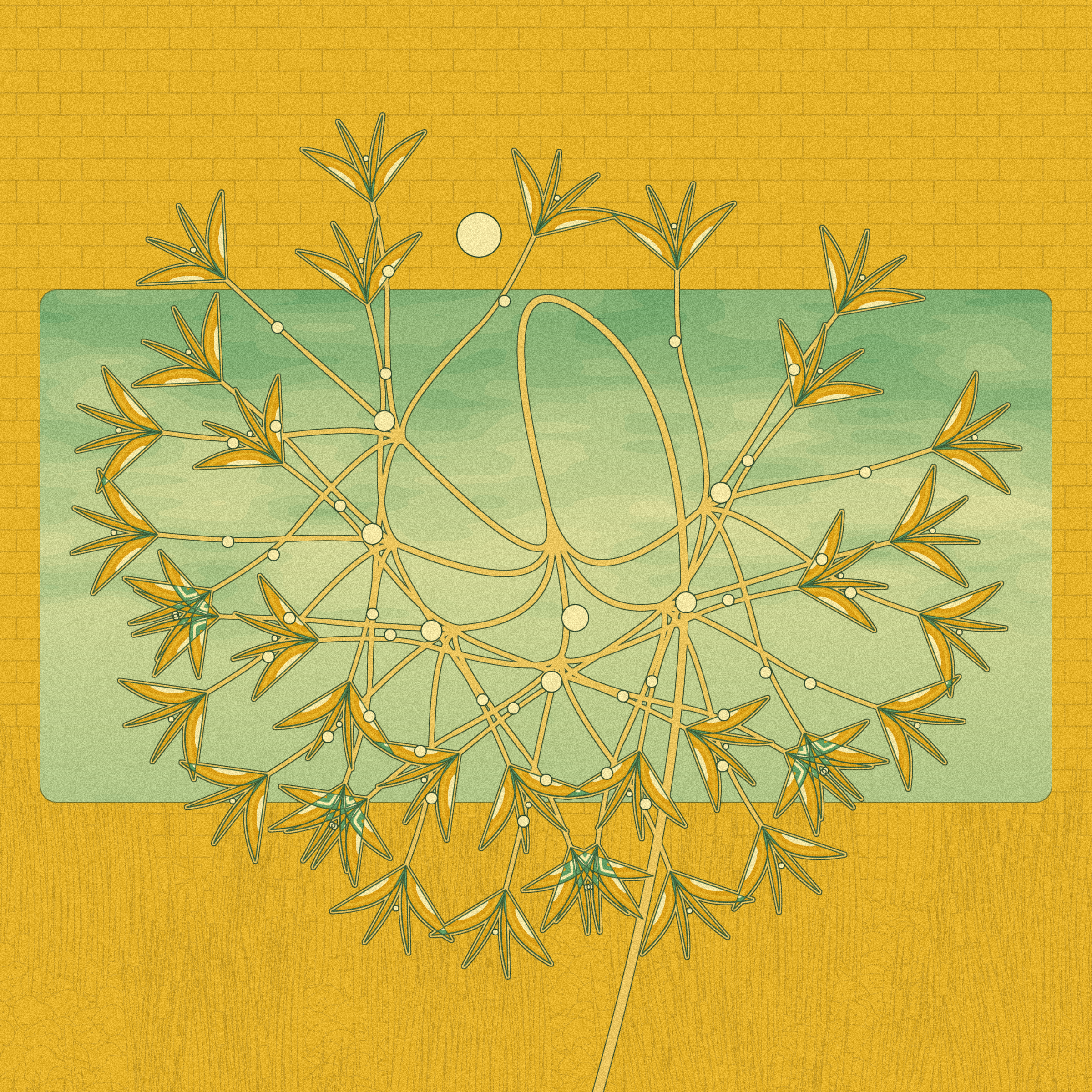Each Seedling grows delicately on a windowsill gazing outside. A Seedling's natural environment–whether a grassy prairie, a rocky mountain, or by a river–is but a memory now, leaving a faded imprint on the canvas' outer border. Some Seedlings resemble trees and flowers, others may appear to be geometric abstractions and fractals–yet all feature interplay between filled patterned regions (leaves and petals) and lines of solid color (stems and branches). Other abstractions also make an appearance: circles representing fruits, stars, or the sun and moon; and a gradient sky with foggy clouds beyond the frames of the window.