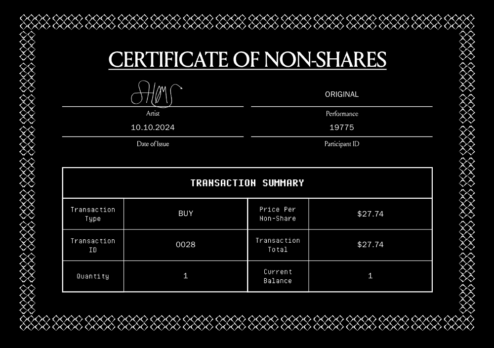This digital certificate of non-share ownership serves as proof of participation in Security, an ongoing speculative financial performance, as well as a freely tradable token within the performance. While nominally connected to the work’s original aggressive bonding curve, it is now bound to the SECURITY bonding curve in arbitrage potential only; Its value is governed by the market’s shifting appetite for speculation and satire, which has at times been quantified by an aggressive exponential bonding curve facilitated by the artist and gallery.