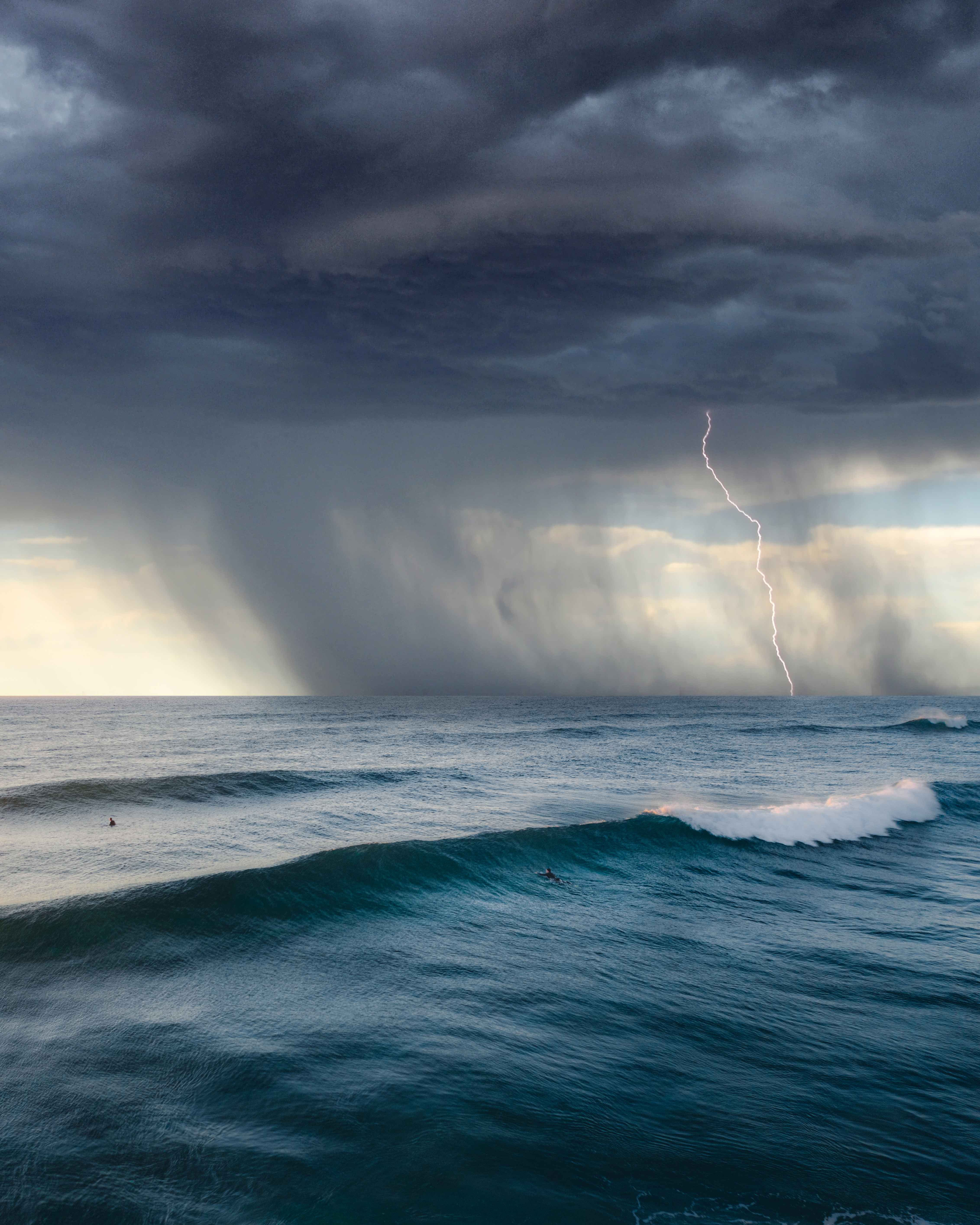 Grail shot. Capturing lightning over the ocean is rare enough for me, let alone composed on a sunny afternoon with surfers in frame while a big storm front rolls in from the south.