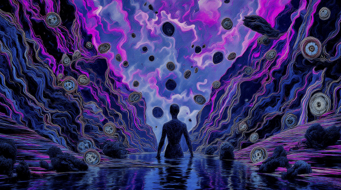 What do you become when your world collapses? TRANSDIMENSIONAL TRIPPERS is 500 answers: characters caught between states, solid forms becoming liquid consciousness, reality bending around those brave enough to transform. Every piece is a mirror. Step through the portal. The collection comments on crypto speculation, social media toxicity, and the search for meaning, rendered in MLOW's drippy digital alchemy aesthetic.