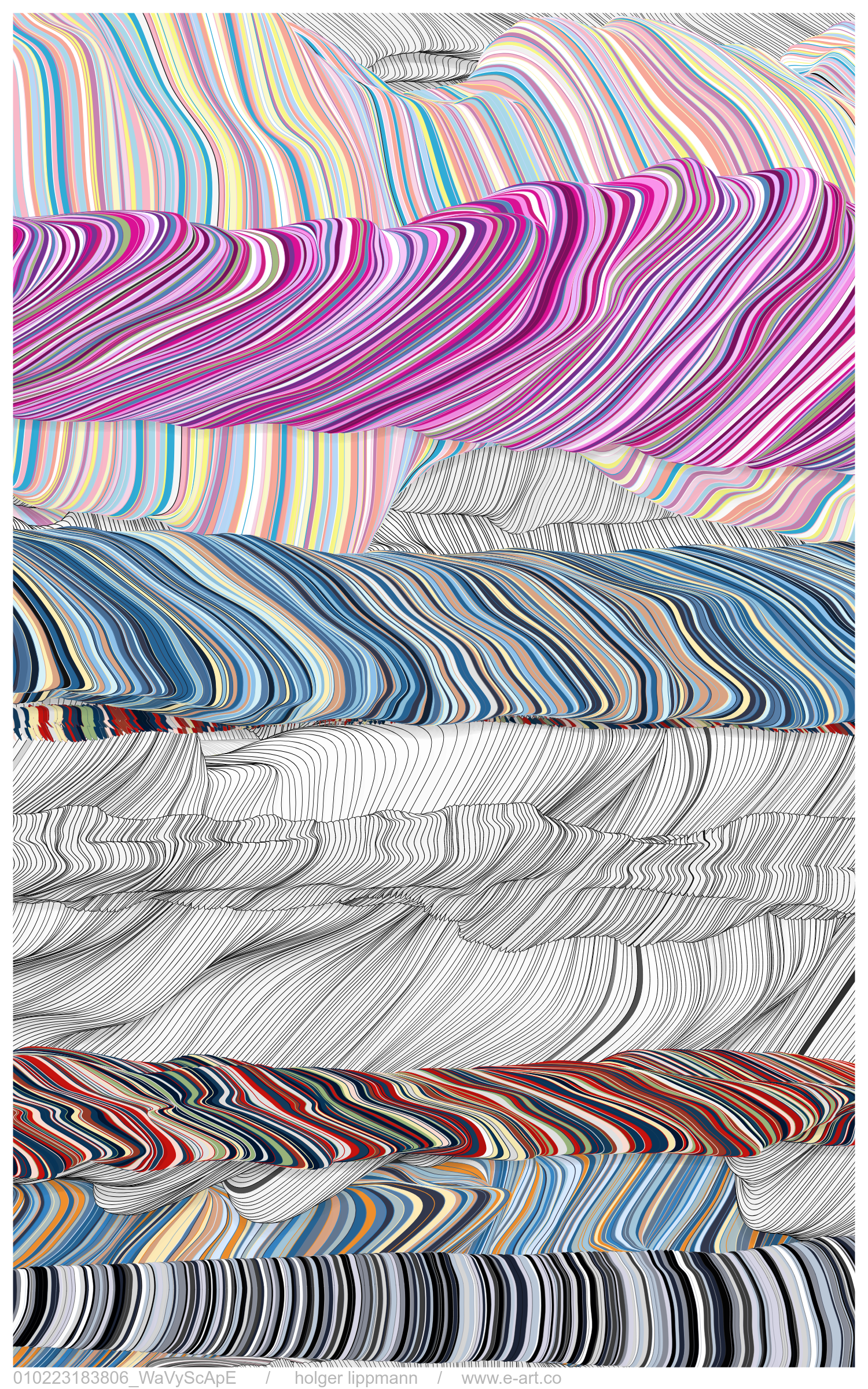 nevertheless, it's not my ambition to create landscape illustrations. rather, through the joy of playing with code, many different abstract structures led me to this sort of linear turbulence, which can sometimes leave a pleasant impression of “familiarity”. however, an openness that stimulates the imagination has always been important to me.