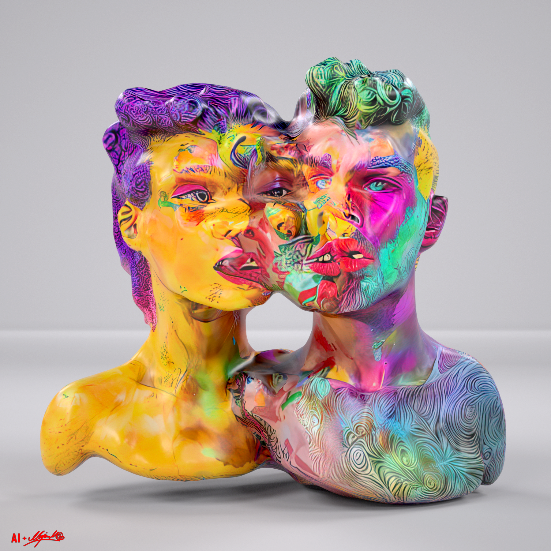 Genesis Generative AI 3d Figurative Sculpture collection, imagines Human pairings. While the Bit is an absolute 0 and 1 binary, machine learning and AI is trained on the creative output of humans on the internet, in a way that is not bound by the binary, reflecting humanity as a mirror would. Using the premise of couples, AI generated dozens of digital sculptures that are enmeshed, strangely distorted, non-binary and sometimes in multiples of more than two as throuples, for we are hacking the machine binary. There’s gender ambiguity, variations of sexual orientations, interracial and inter age combinations and an abstraction and expansion of human dyads that reflect 21st century society and culture in our moment. This GLB sculpture was enhanced by Marjan and designed to work on browsers, AR, VR and Metaverses. It can also be 3d printed in color as physical sculpture, contact the artist for custom off chain orders and lower size GLBs for low poly metaverses.