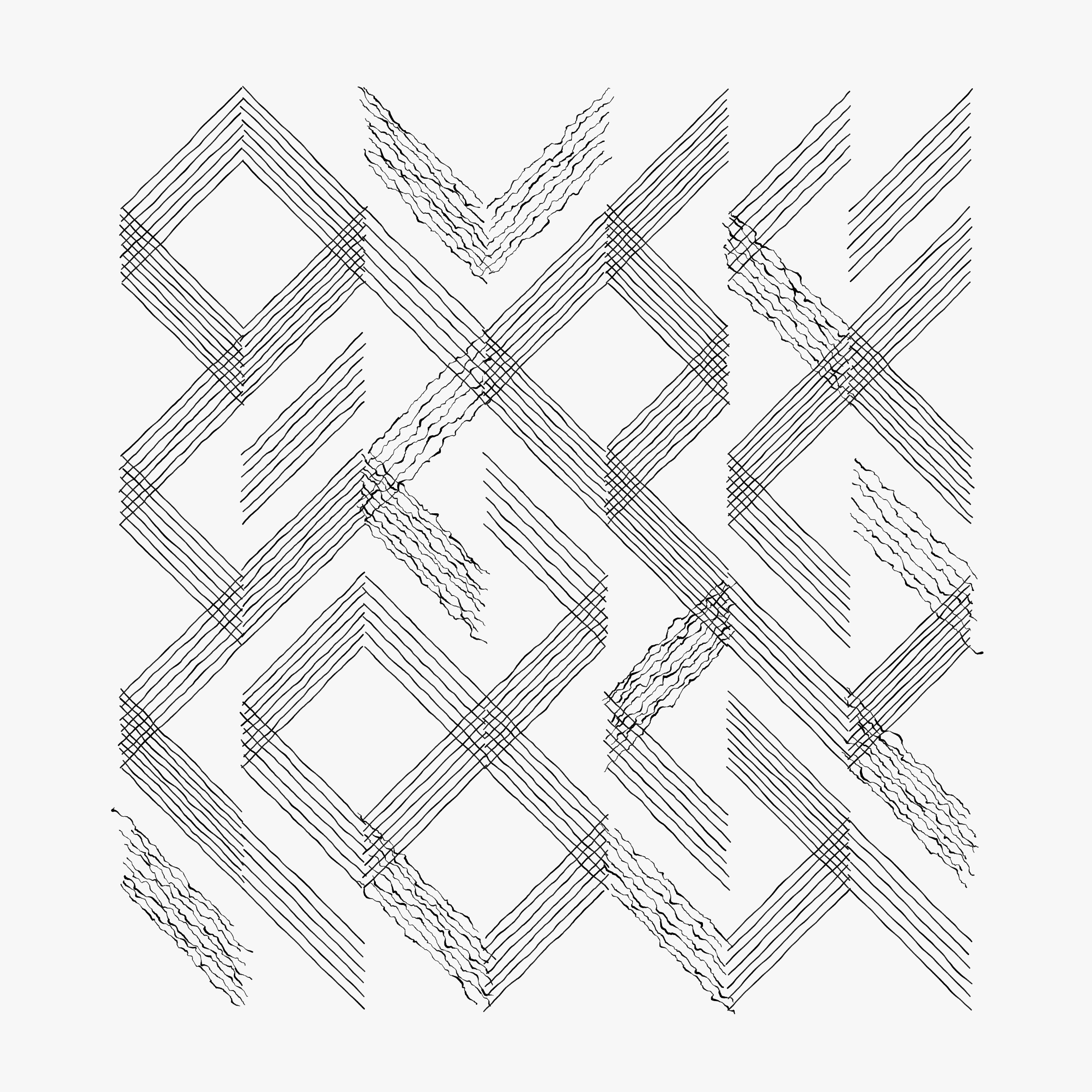 Project Description: A series of “freehand” mixed media drawings — made by an algorithm. In each drawing, three basic elements (horizontal lines, diagonal lines, and arcs) are extruded and rendered in three possible stroke types (pen, flat brush, and round brush). Simple variations produce a wide range of compositions — transforming the image from a flat graphic into a composition that evokes a series of spaces, a collection of objects, or anything in between.
