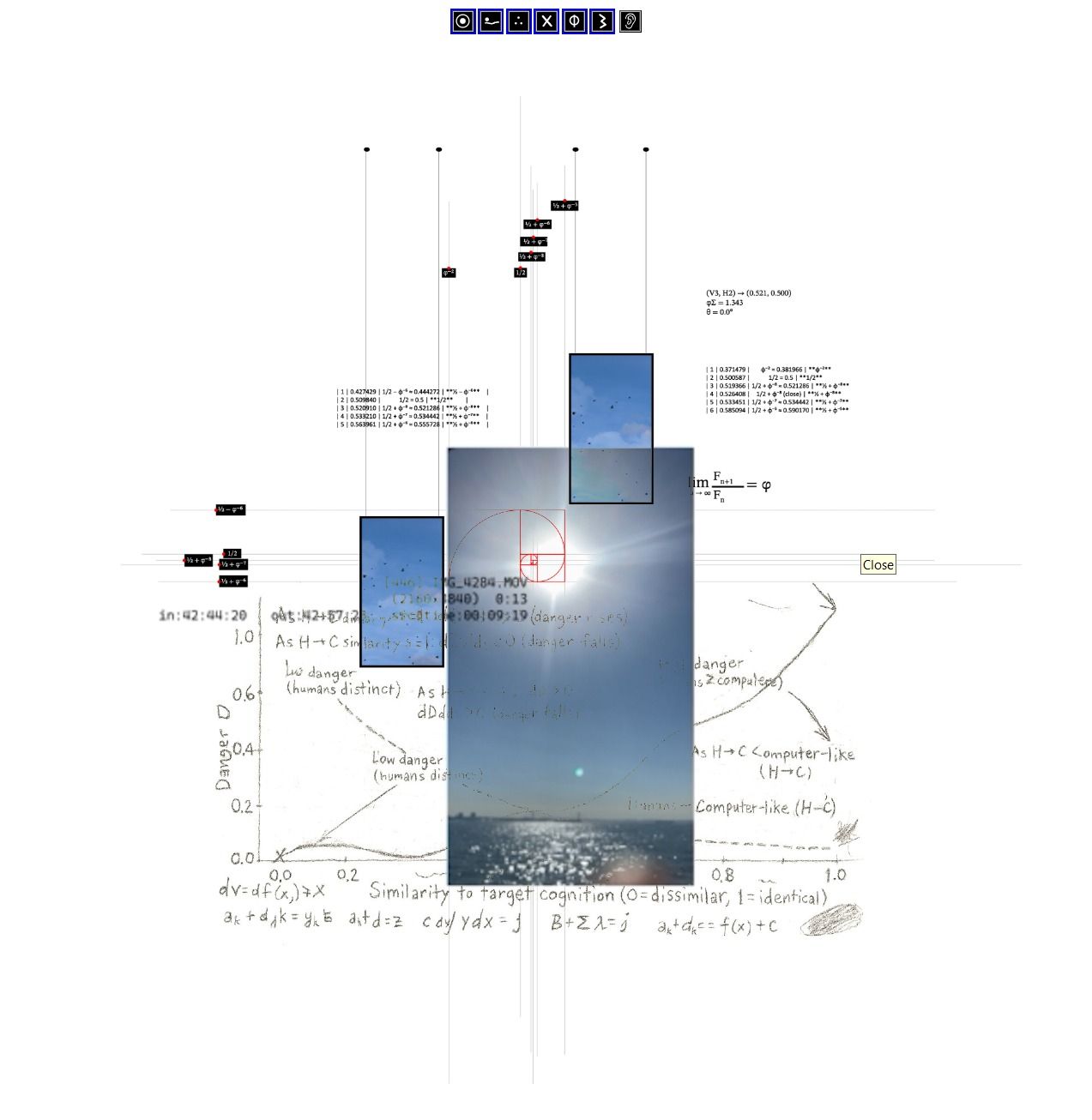21.000 brings the layered workflow of my digital production into physical space. A decade of sun footage, always centered in the frame, is projected onto a wall marked with a golden ratio grid and mathematical notes. These precise lines mix with loose hand-drawn marks that feel casual and graffiti-like. The geometry and the drawing overlap and create a quiet tension between calculation and improvisation.