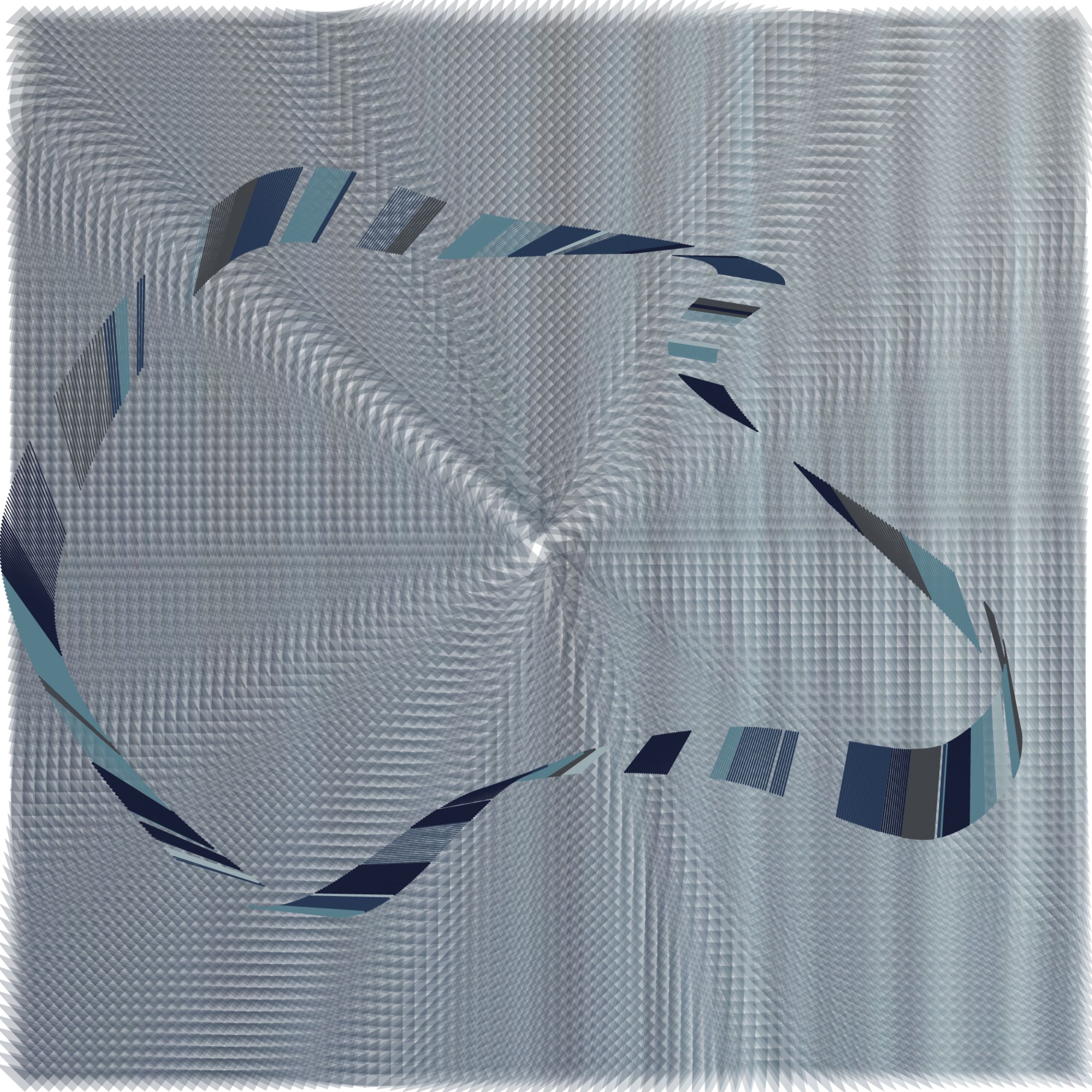 The background is a tangent field computed from angles in the foreground shapes. It represents an energy field permeating the universe. This unusual arrangement -- a background created by the foreground was done to hint at questions of causality.