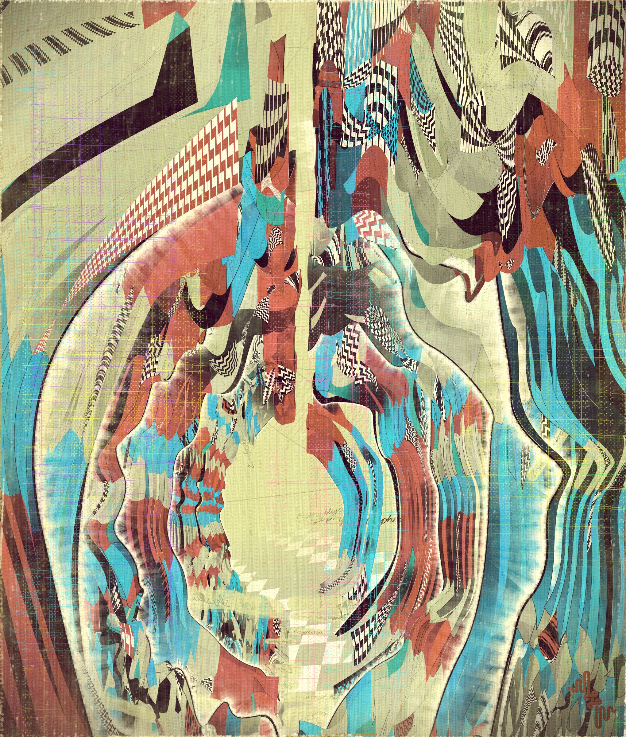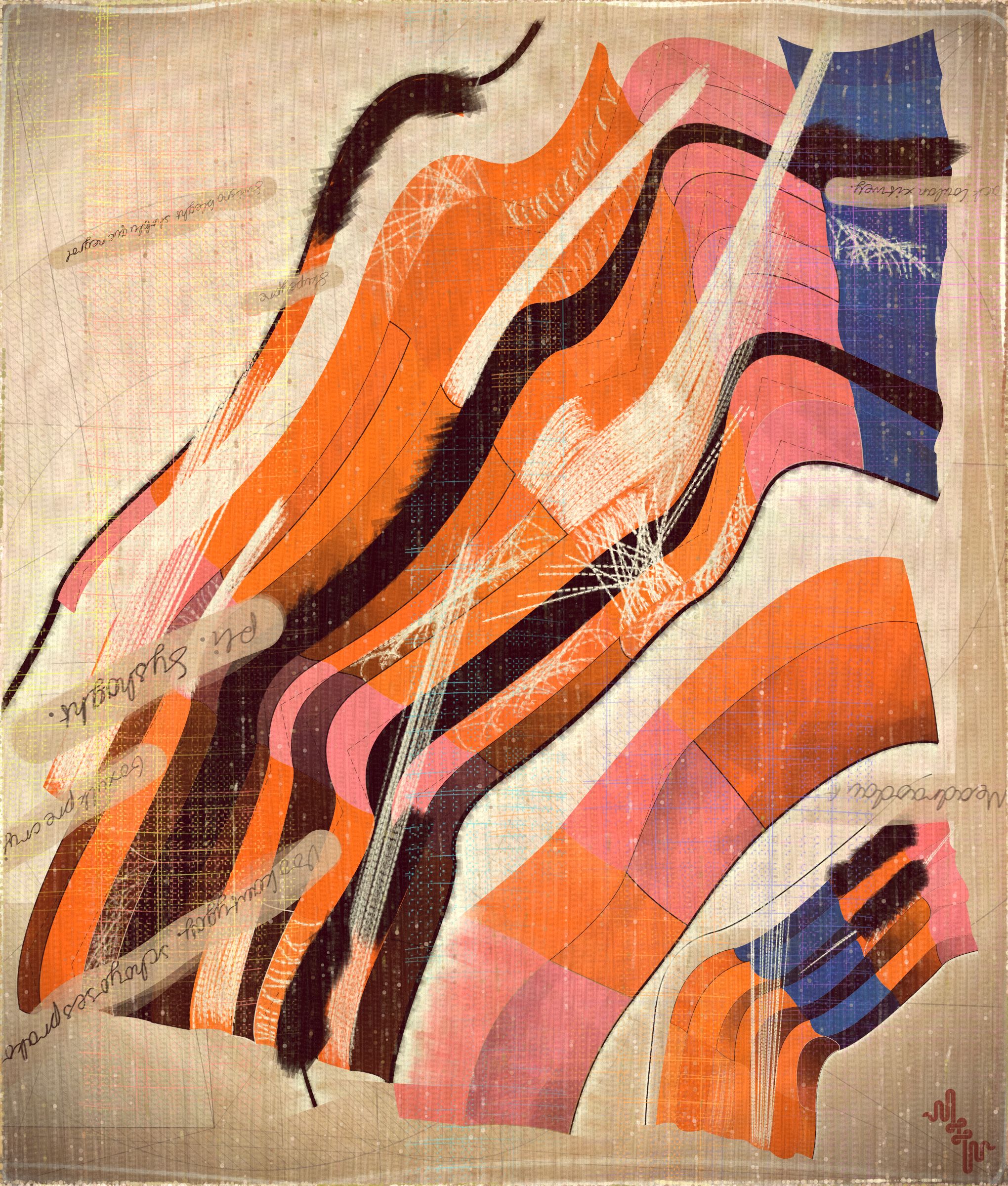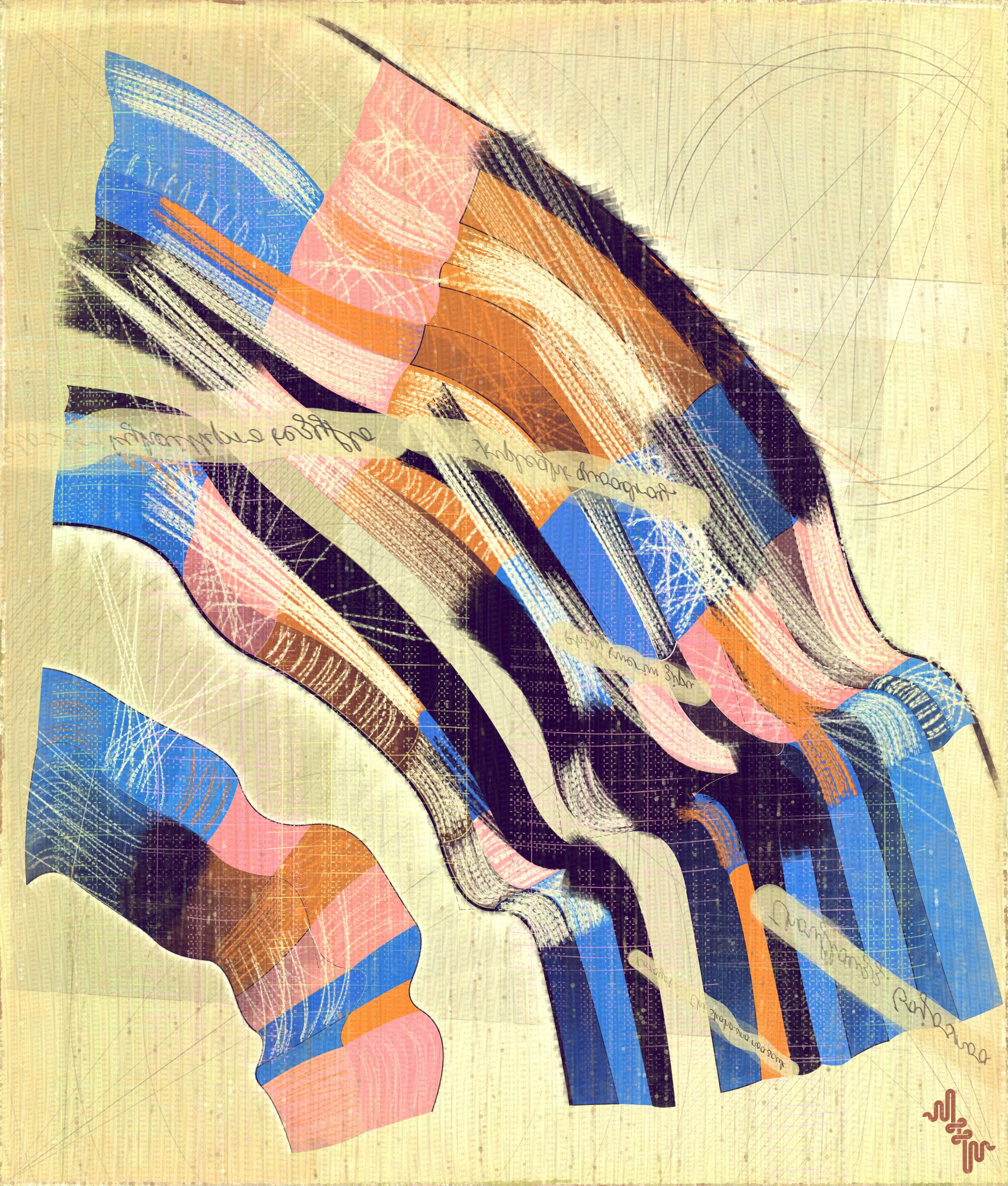 The cursive writing in these works are entirely algorithmic. There is no meaning, other than the meta meaning of something that looks like Pseudo notation. In the course of building the project I tried numerous ways to introduce the texture of writing into the work without finding a way that satisfied me. Text adds a textural depth to the work that’s hard to create in any other way. The writing also looks like the scribing of a mad person which seemed to tie in nicely with the emerging feeling of madness in some of the outputs. I call these bands of cursive texture - Notes from the Asylum.