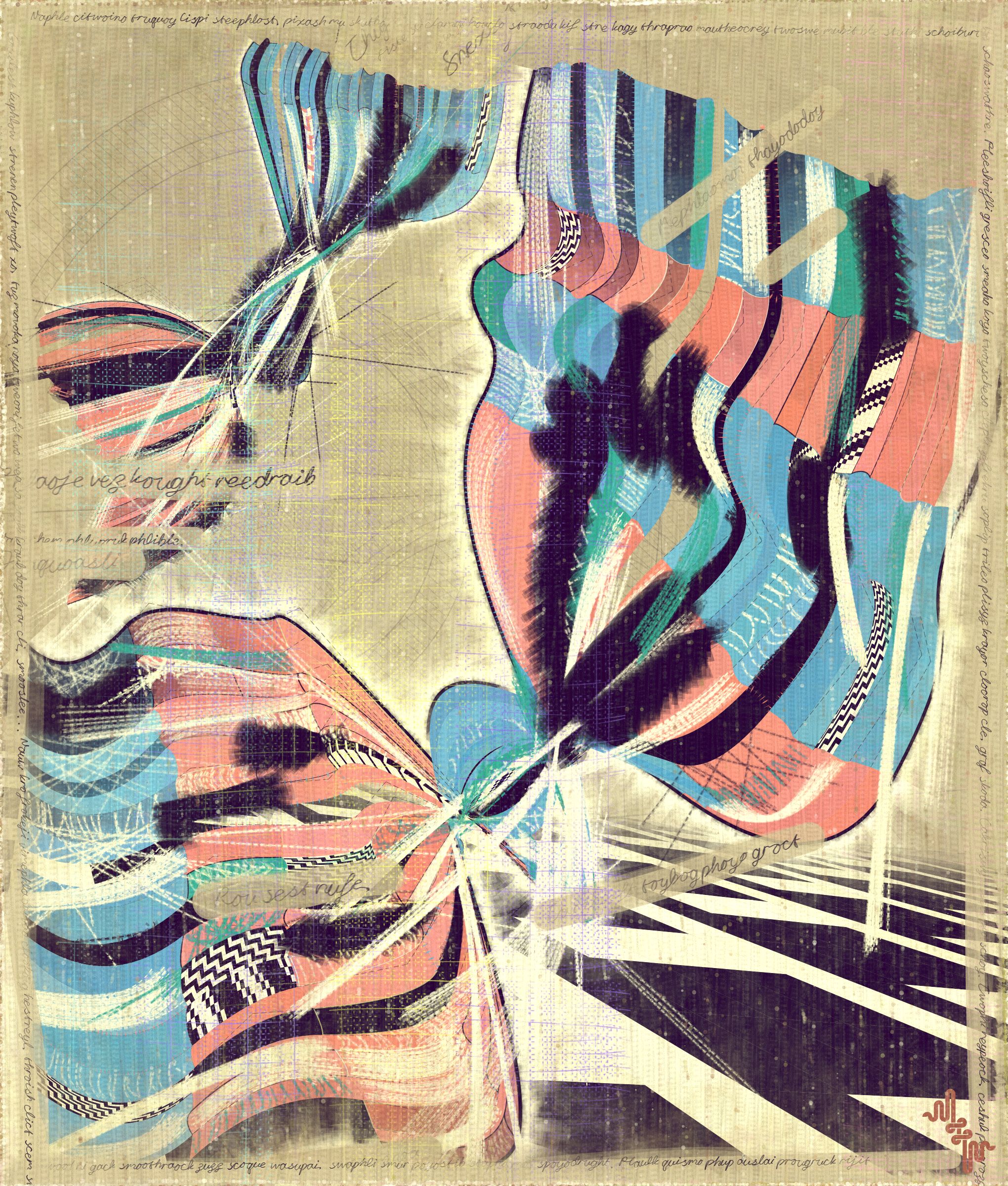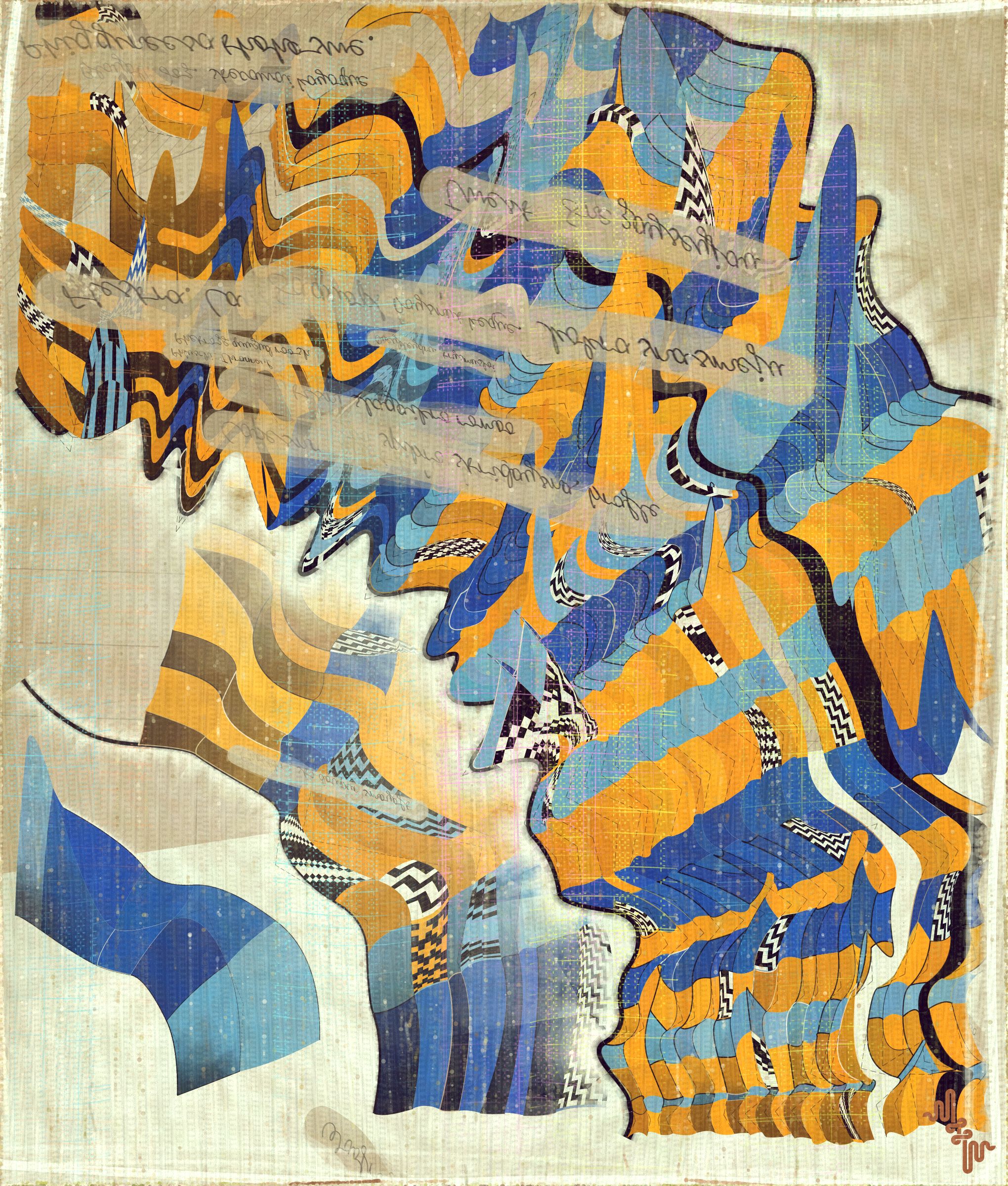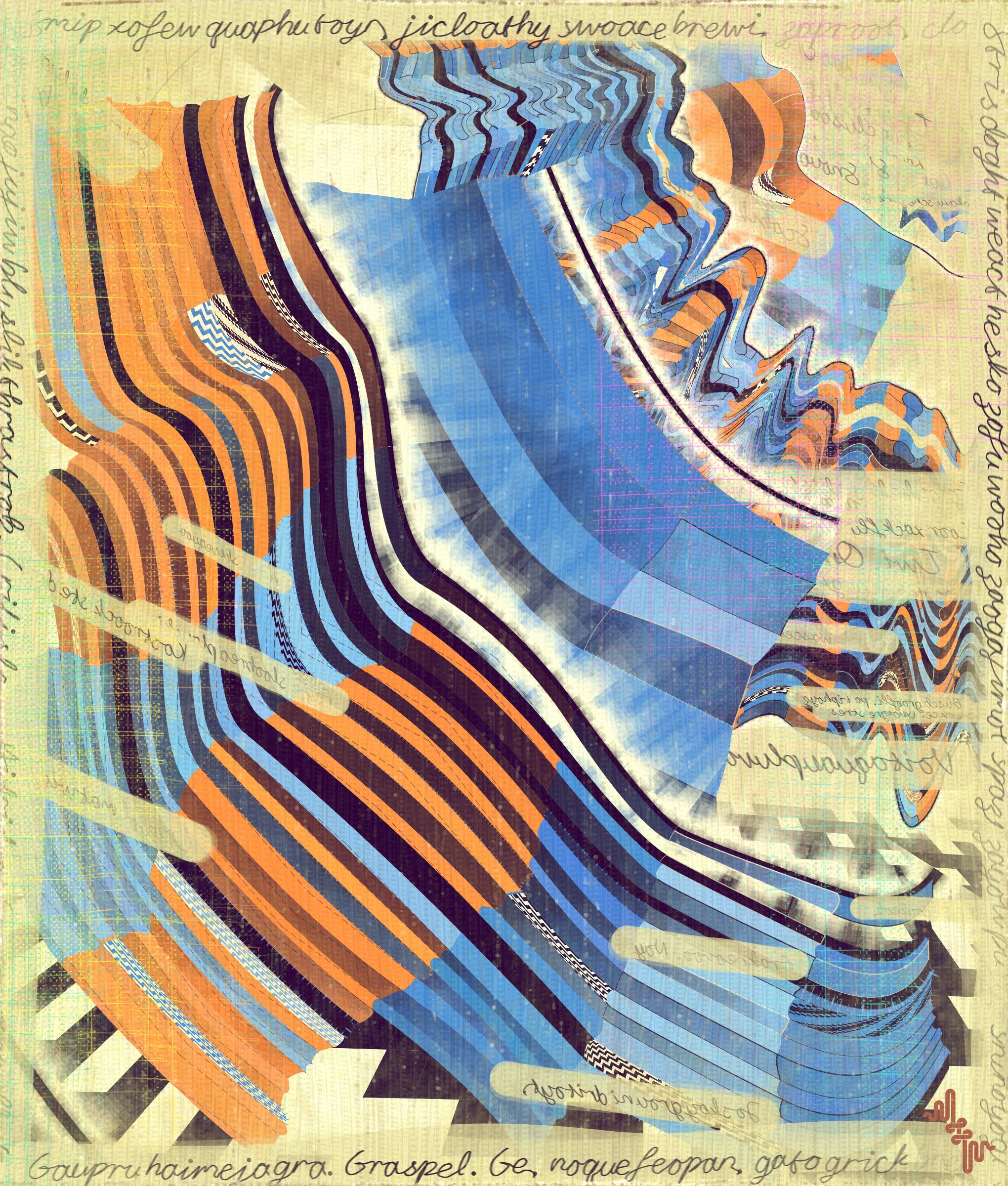 The cursive writing in these works are entirely algorithmic. There is no meaning, other than the meta meaning of something that looks like Pseudo notation. In the course of building the project I tried numerous ways to introduce the texture of writing into the work without finding a way that satisfied me. Text adds a textural depth to the work that’s hard to create in any other way. The writing also looks like the scribing of a mad person which seemed to tie in nicely with the emerging feeling of madness in some of the outputs. I call these bands of cursive texture - Notes from the Asylum.