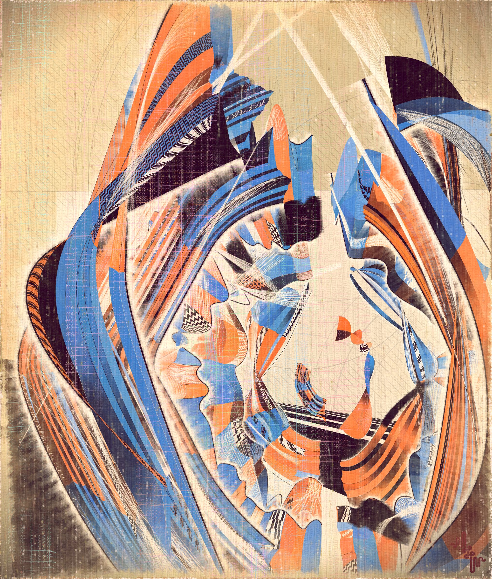 Creating surfaces that look worn and discolored might be seen as skeuomorphic, however I feel there is an honesty to this type of treatment because objects in real life are also typically aged in an algorithmic way. Usually through a repetition of partially constrained movements and patterns of specific interactions. The intrinsic visual properties we find comforting and fascinating in antique surfaces can be created in generative art in a very direct and authentic way. When I remove these layers of textural distress the underlying work is often somewhat unapproachable and cold. I feel the compositional flow is also softened and unified by the addition of algorithmic distress. Transitions are easier to visually digest and the overall visual variety and interest of the surface is increased. Perhaps what’s more important is there is a sense in which the art has settled into the physical world and has had interactions with it. Of course this is a lie but every story we tell in art is a lie. When creating the distress marks I am careful to leave the simple circle and line primitive building blocks at a scale that makes it easy to see on close examination how the art is constructed. This reveals the truth about the lie and creates visual tension between the illusionistic and abstracted mark making.