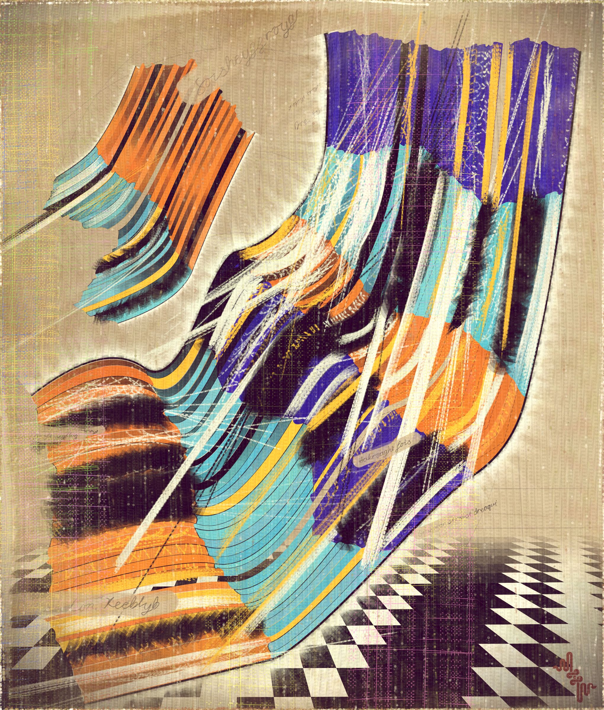 Algorithmic mark making reminiscent of human gesture is not really abstract. They are more representational of artifacts created by the human skeleton in the creative act. Through this association gesture seems to have a direct expressive path to our deep human emotions. When gestures become incoherent and turbulent, something in us feels this as a kind of violence. Although Amplitudes of Canvas started life as gently flowing landscape-esk forms, the use of gesture became stronger and the spectrum of movement and expressive power of the work ramped up considerably. The addition of the floor plane reminded me of Victorian hospital rooms. In some of these works emerged the traces of an asylum, a container for the more extreme gestural madness appearing at the out edges of the algorithm's expressive space.