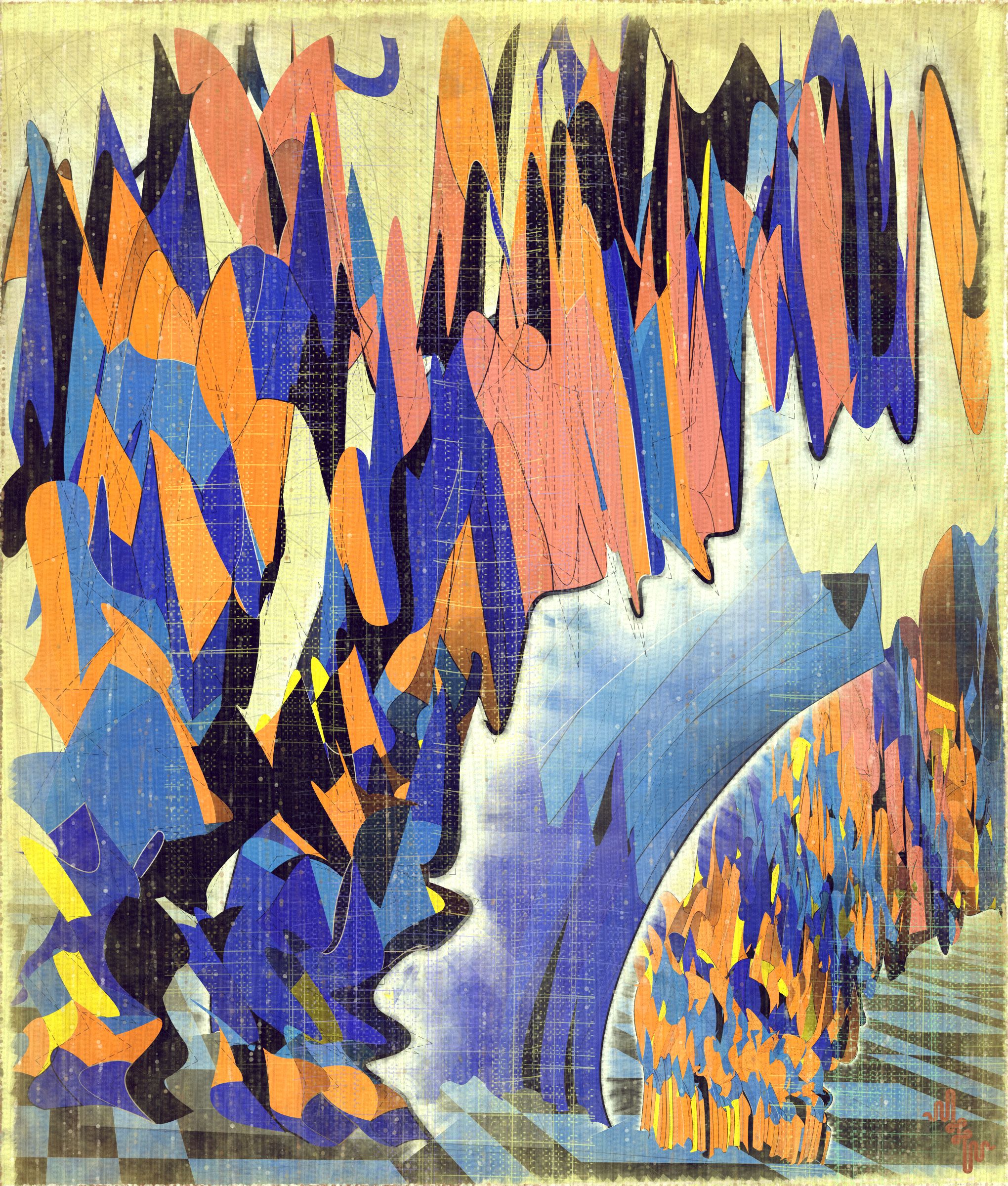 Bold gestural markings within this algorithm also evolved into a way of defining scale and movement in the landscape. They serve as a bridge between the illusion of receding depth and the true flatness of the digital surface. For centuries, bold brushstrokes—evidence of the painterly act—have created intentional tension between illusionism and the physical reality of the canvas. The gestural marks in this series, although complex and layered, are still clearly derived from rudimentary vector-based primitives. Preserving the evidence of a digitally native process is my reinterpretation of this same artifact found in representational painting.