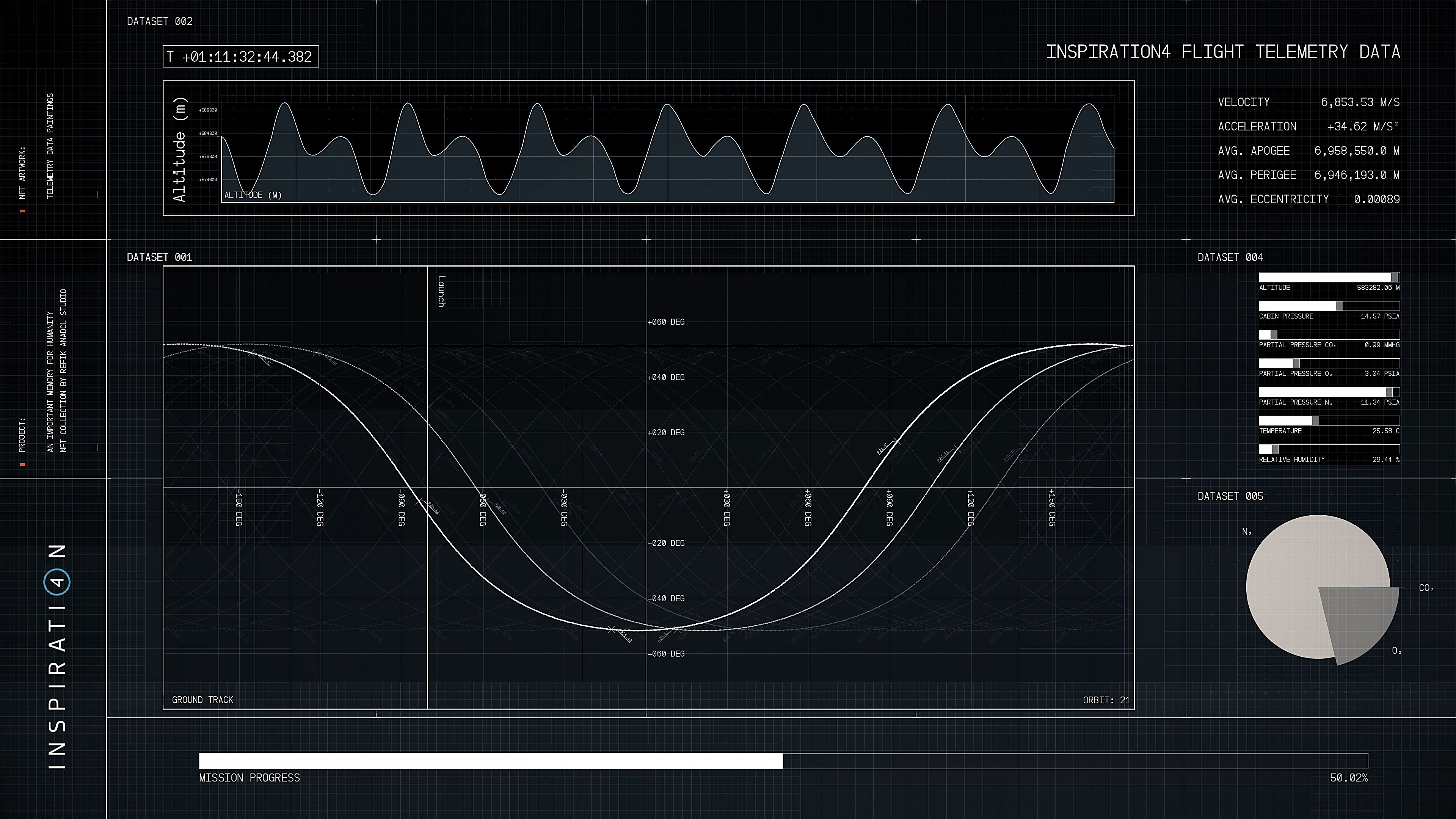 An Important Memory for Humanity is Refik Anadol’s groundbreaking limited-edition NFT collection that utilizes data from the world’s first all-civilian space flight. The collection presents a series of poetic data sculptures and paintings of the Inspiration4 mission.
