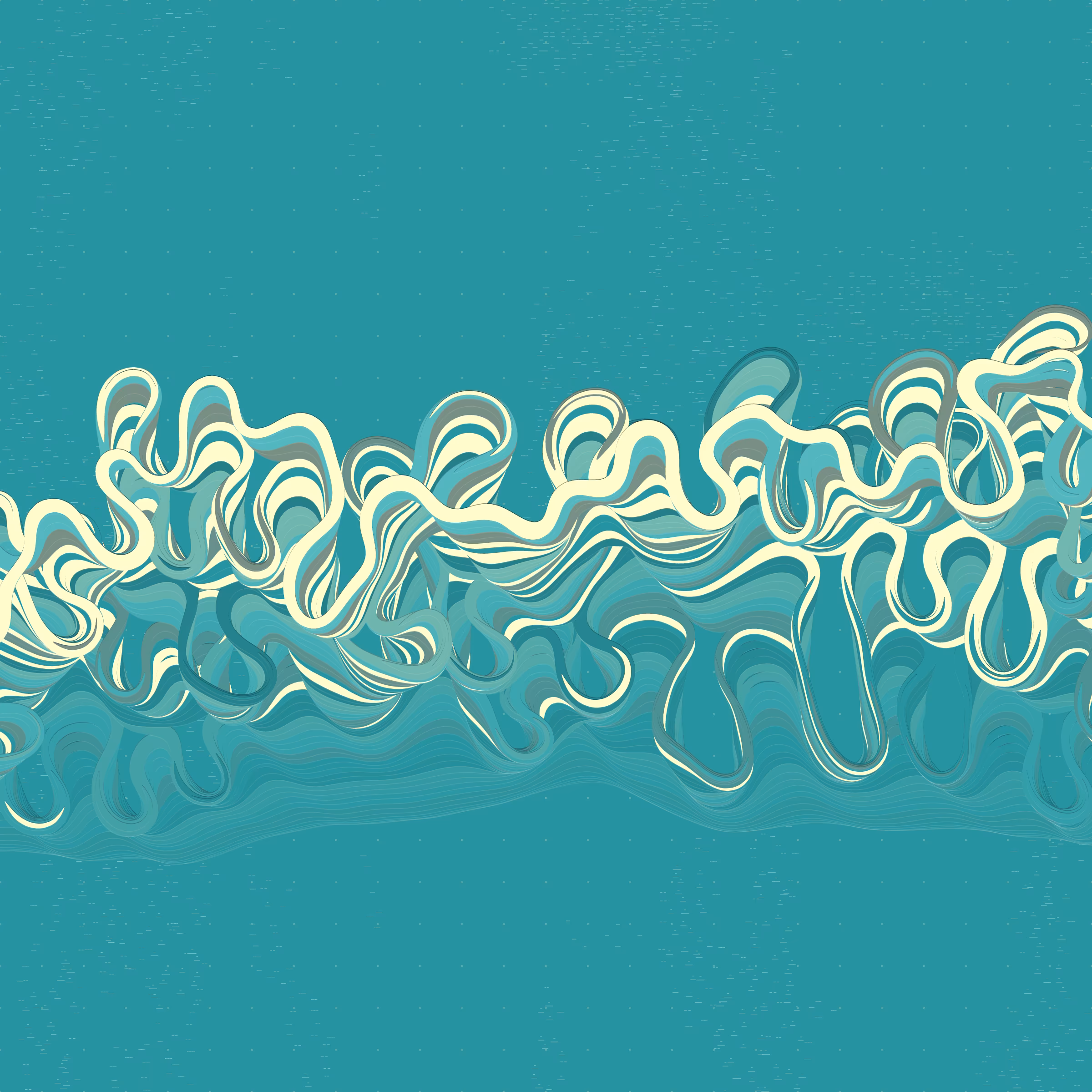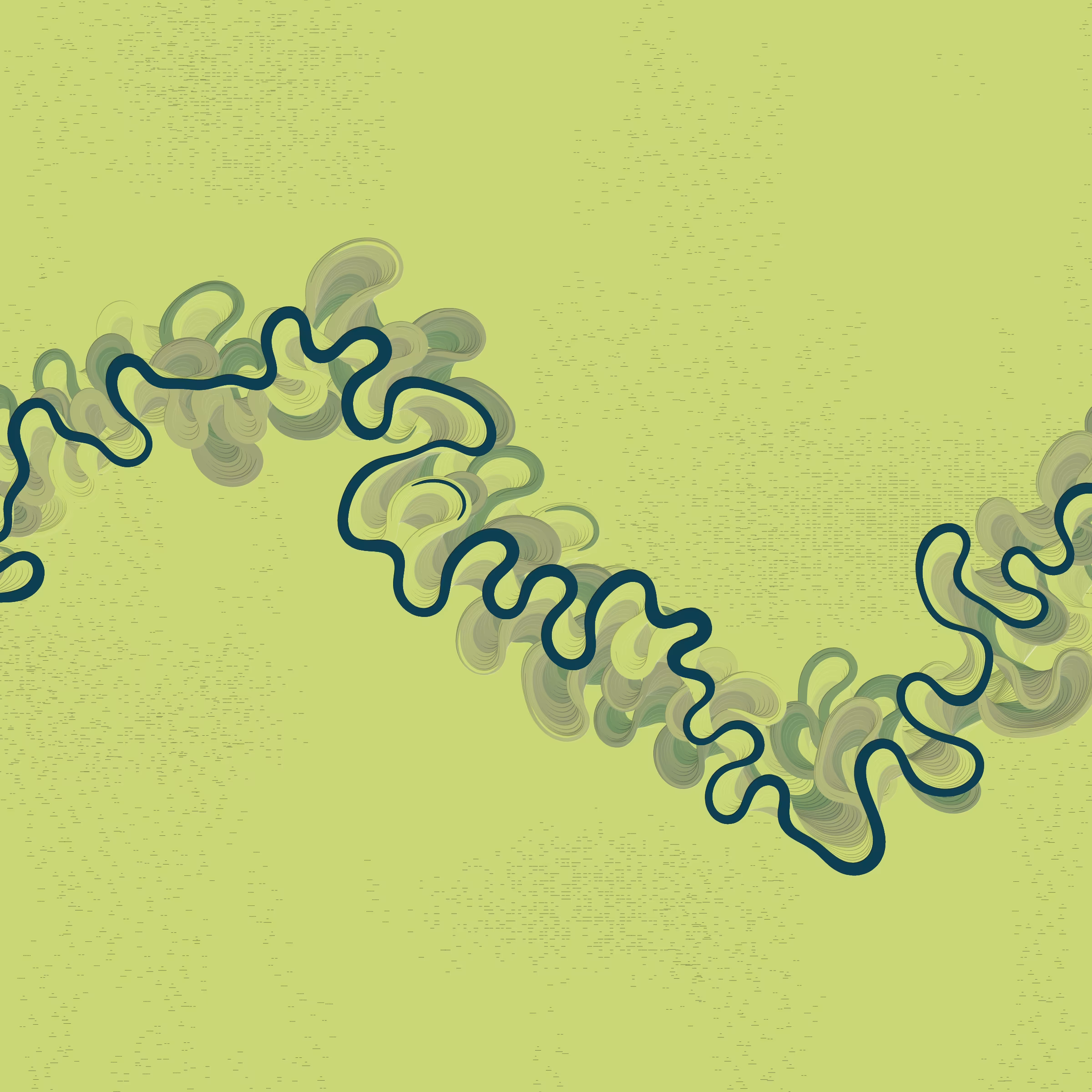 Project Description: Ancient Courses is a generative experience that explores the aesthetics of meandering rivers and the settlements that form on their banks. The design is graphic and cartographic with bold color palettes rendered against map iconography and line sensibility. From the river banks, roads stretch across the landscape: sometimes a single access road, other times sprawling towns. The river meandering is simulated via a custom algorithm which closely models the real world process.