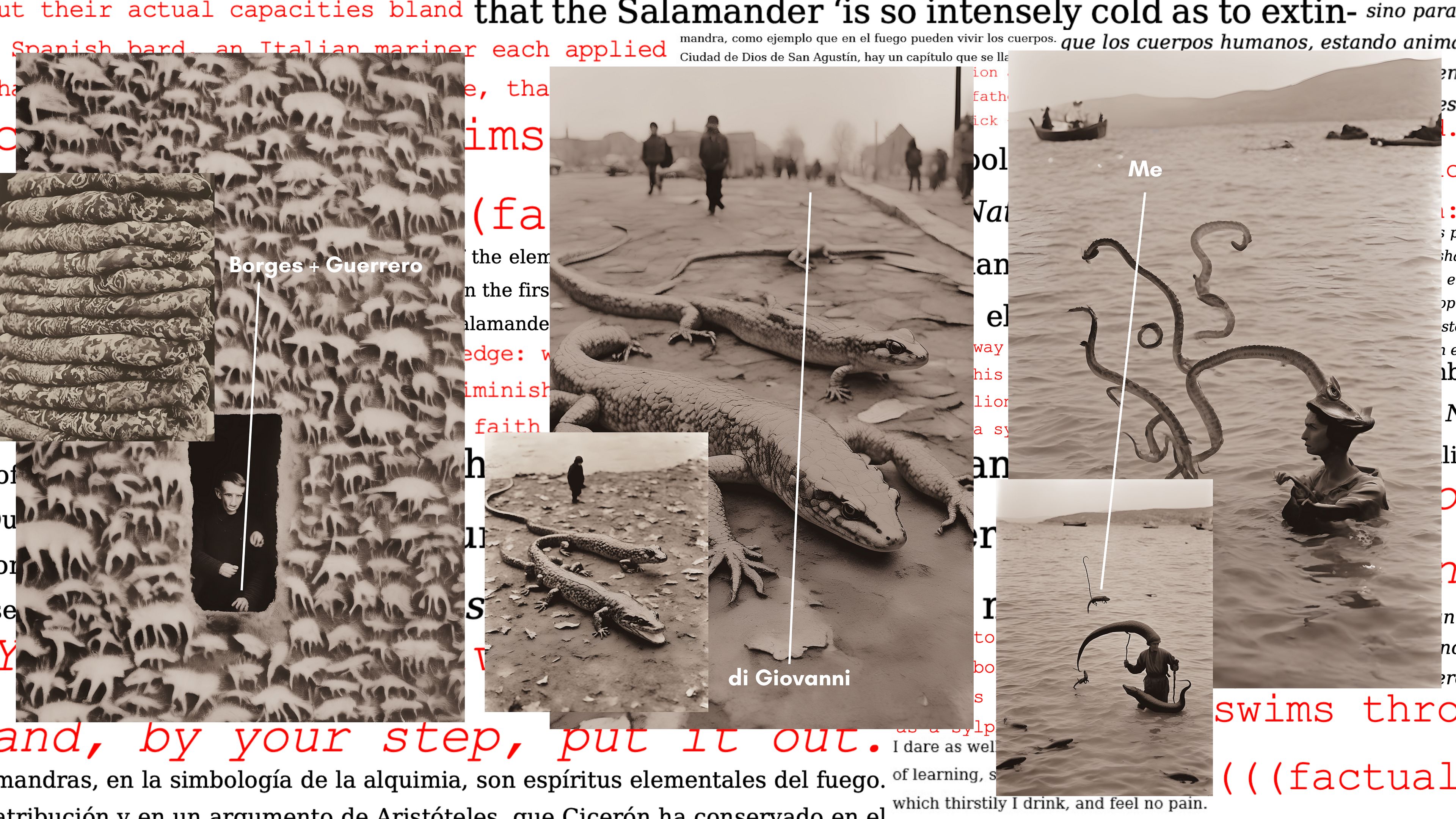 Caballero’s process was three-fold. She first used Borges and Guerrero’s Spanish descriptions of imaginary beings as prompts to create a large corpus of images from which two were selected. The process was repeated using di Giovanni’s English translations.