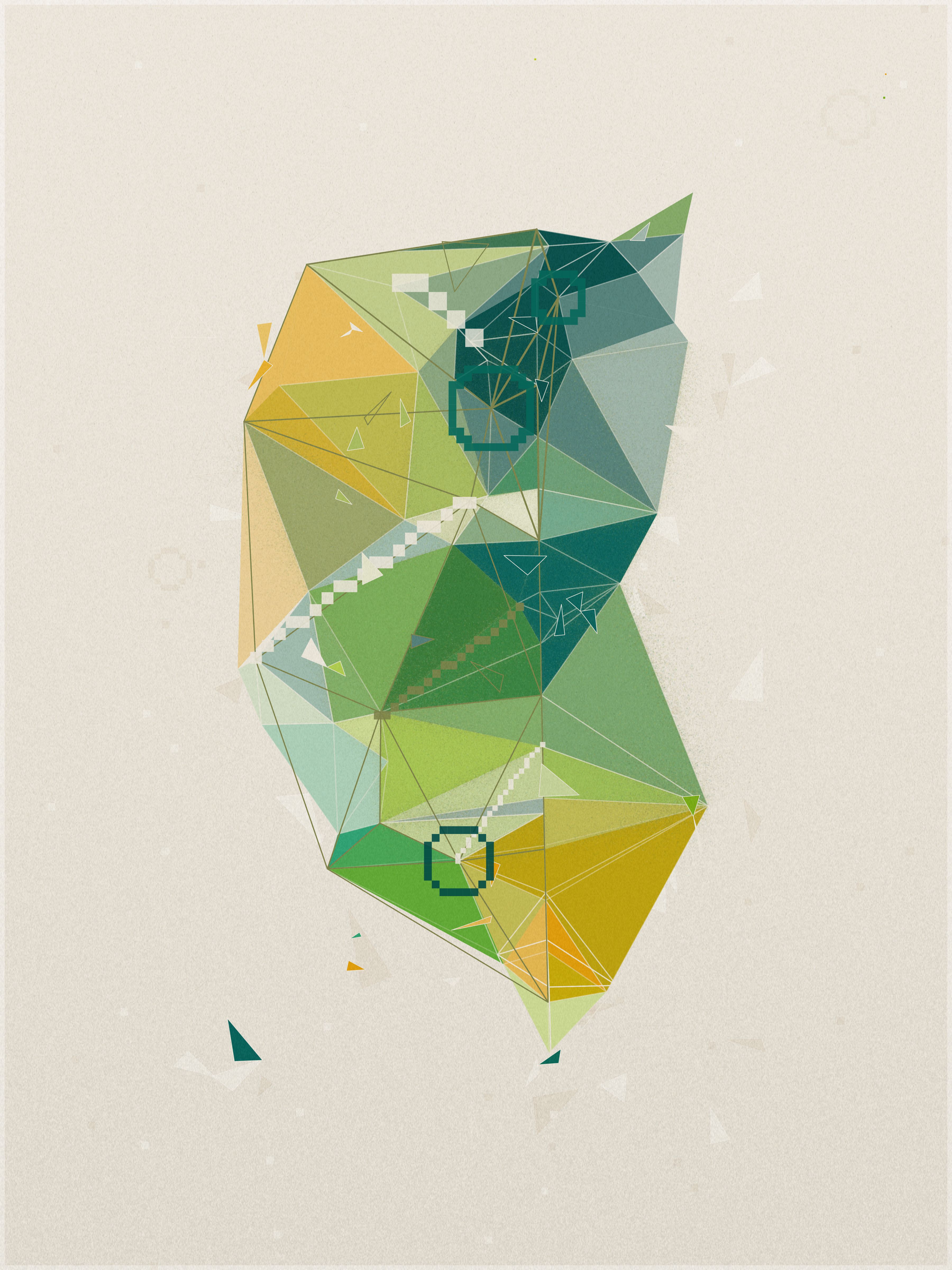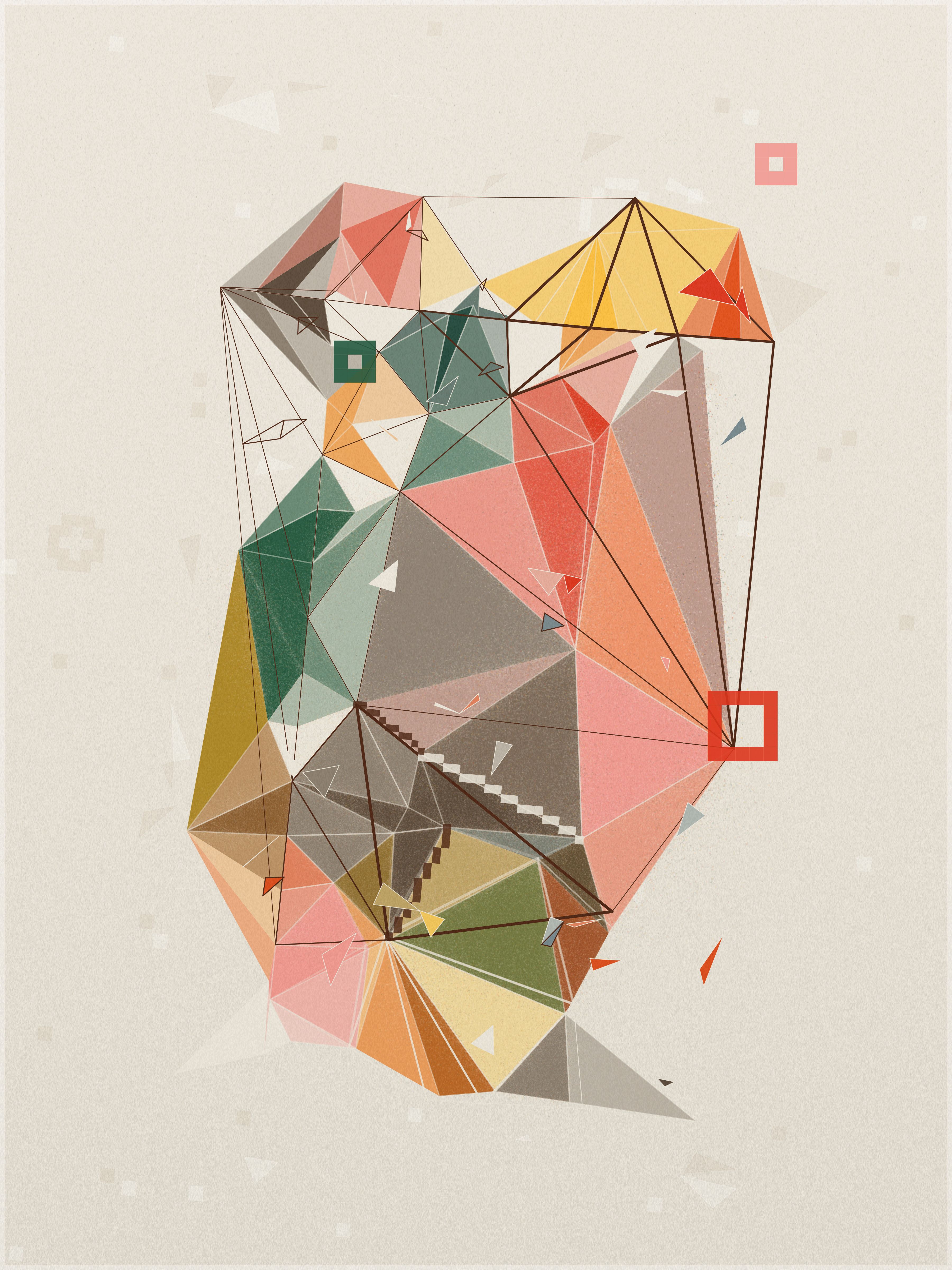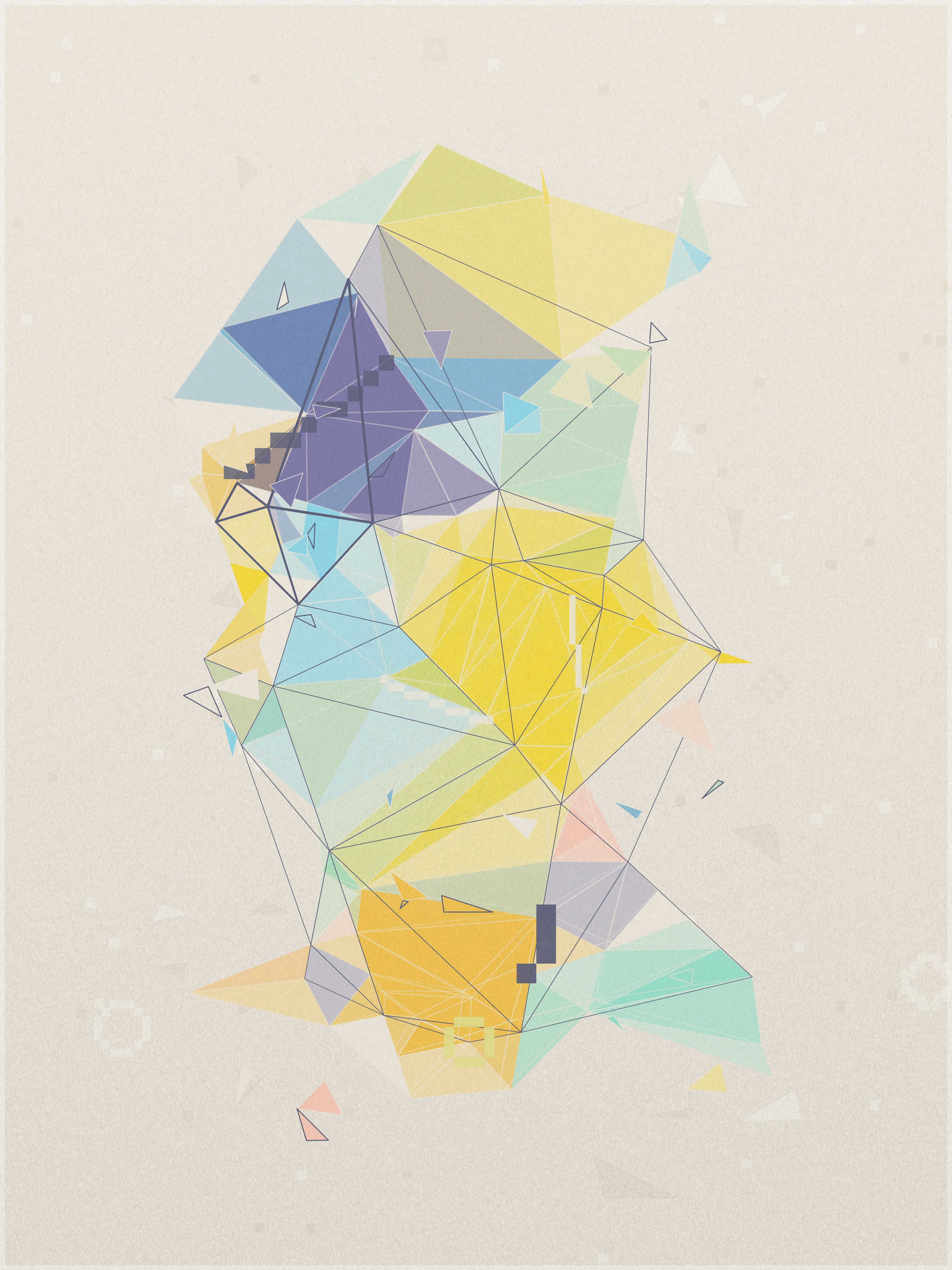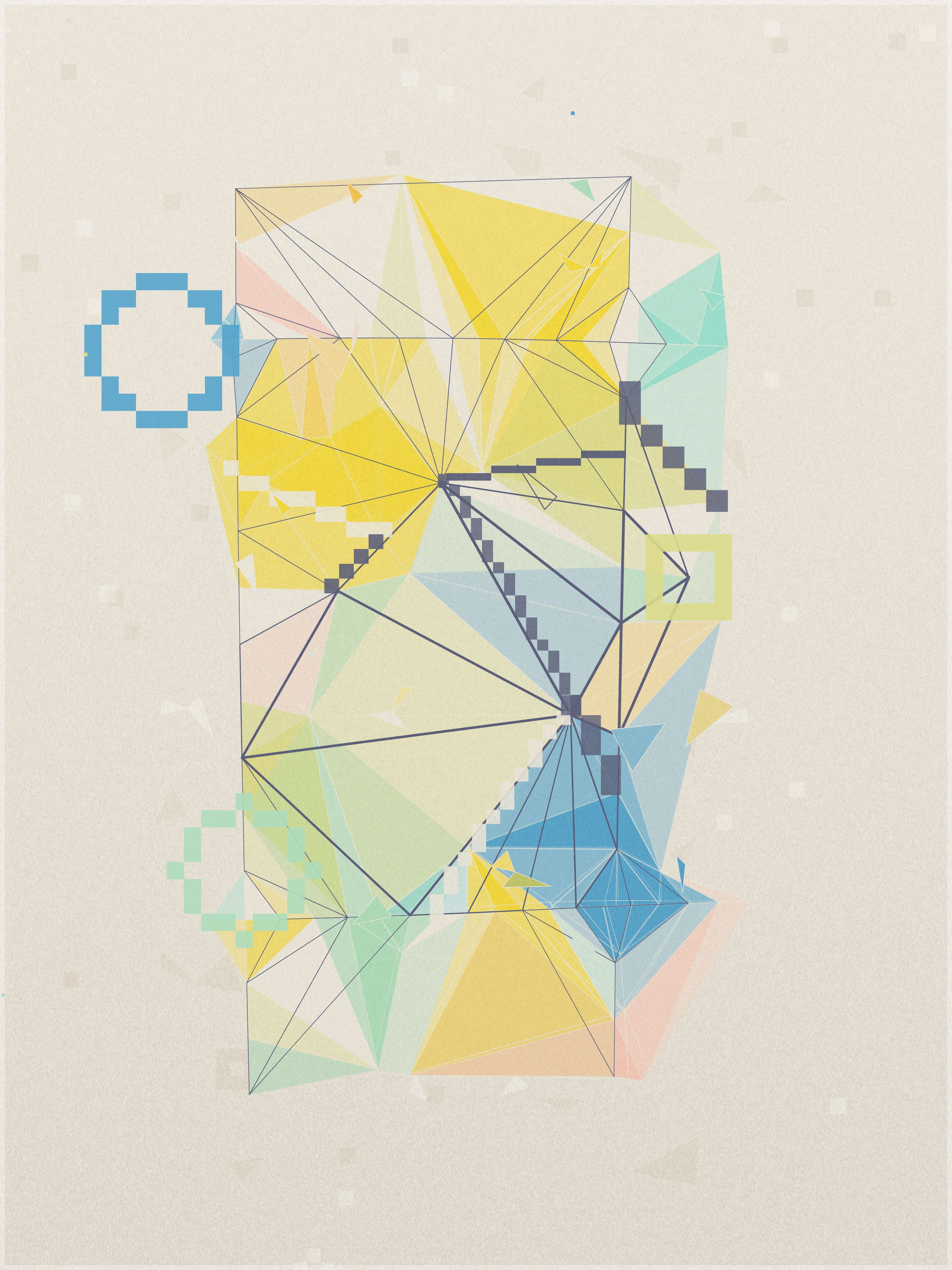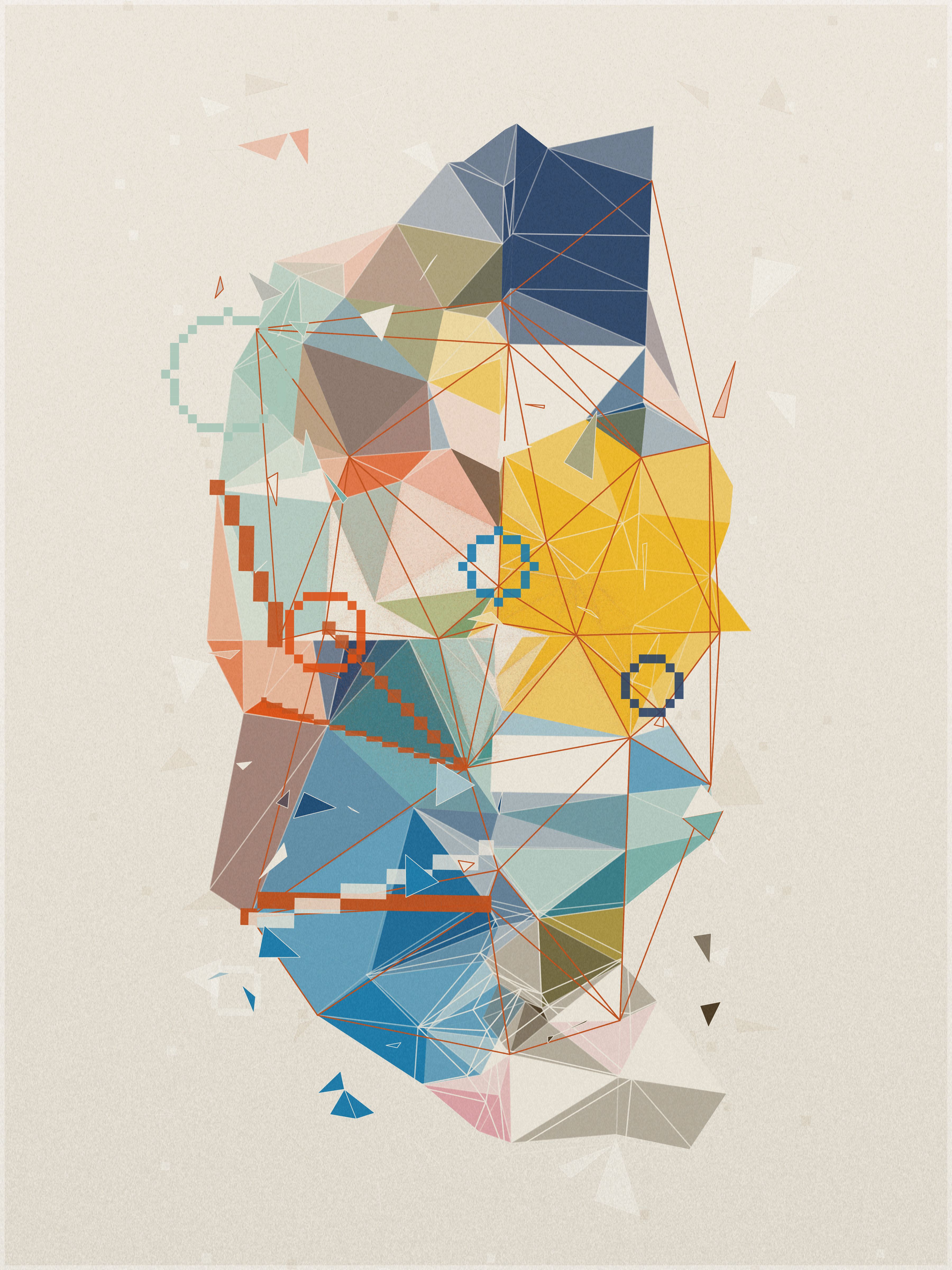 First, a base layer is created, where the colors of the palette flow in an organic pattern. On top of this, each triangle samples five key points: the center, the three vertices, and the midpoint of its longest side. The algorithm calculates an average of these values to define the triangle’s final color.