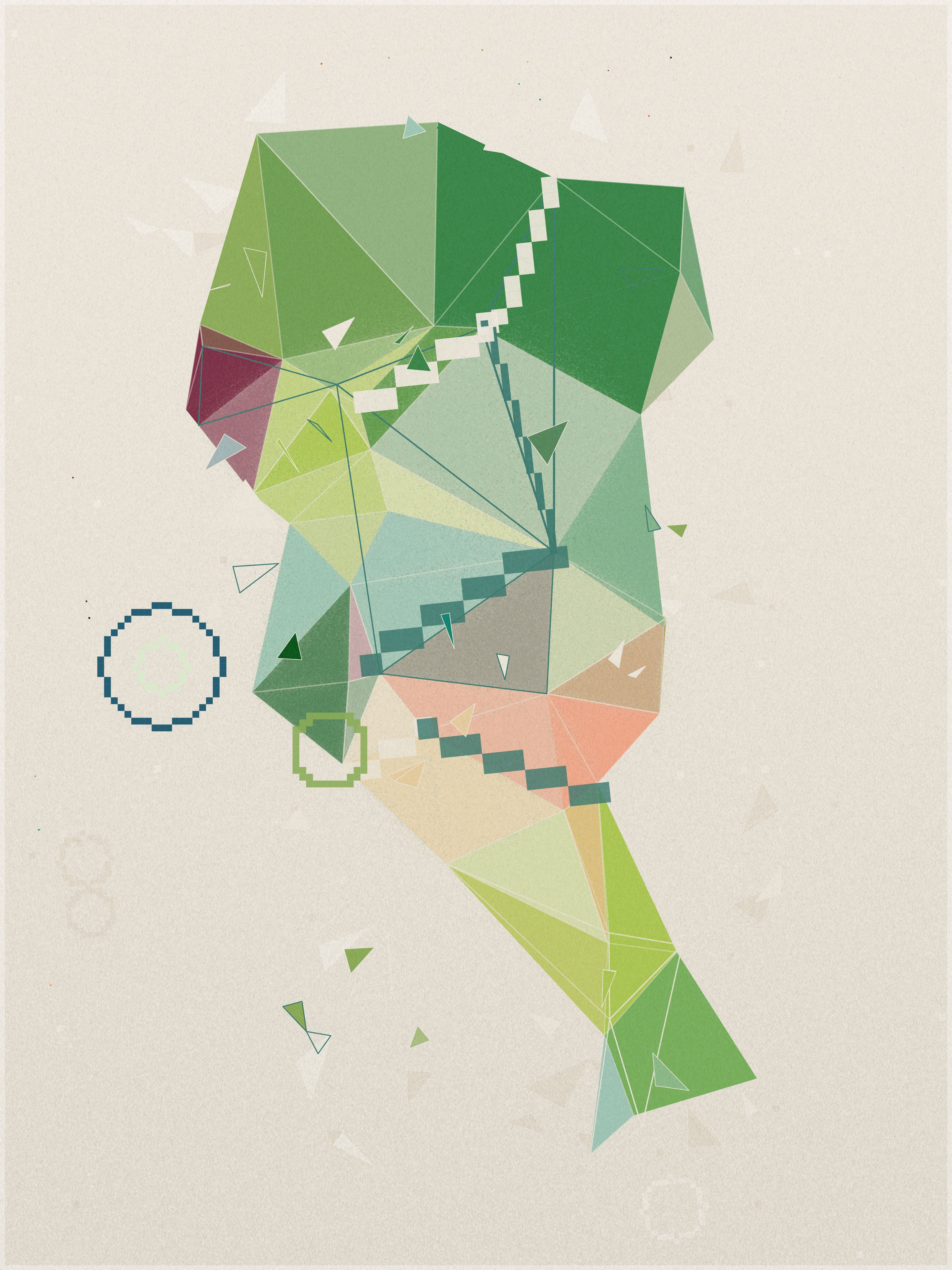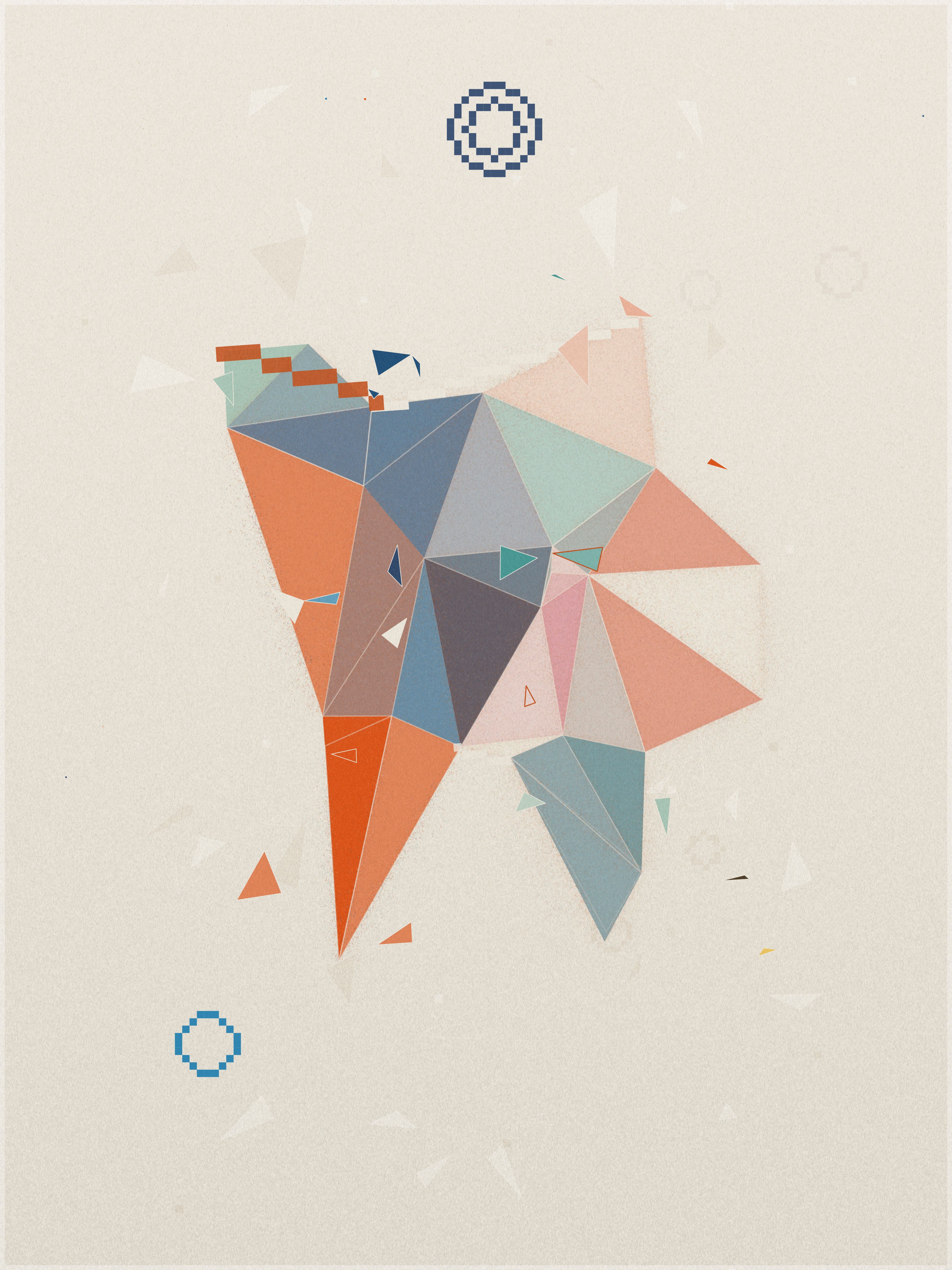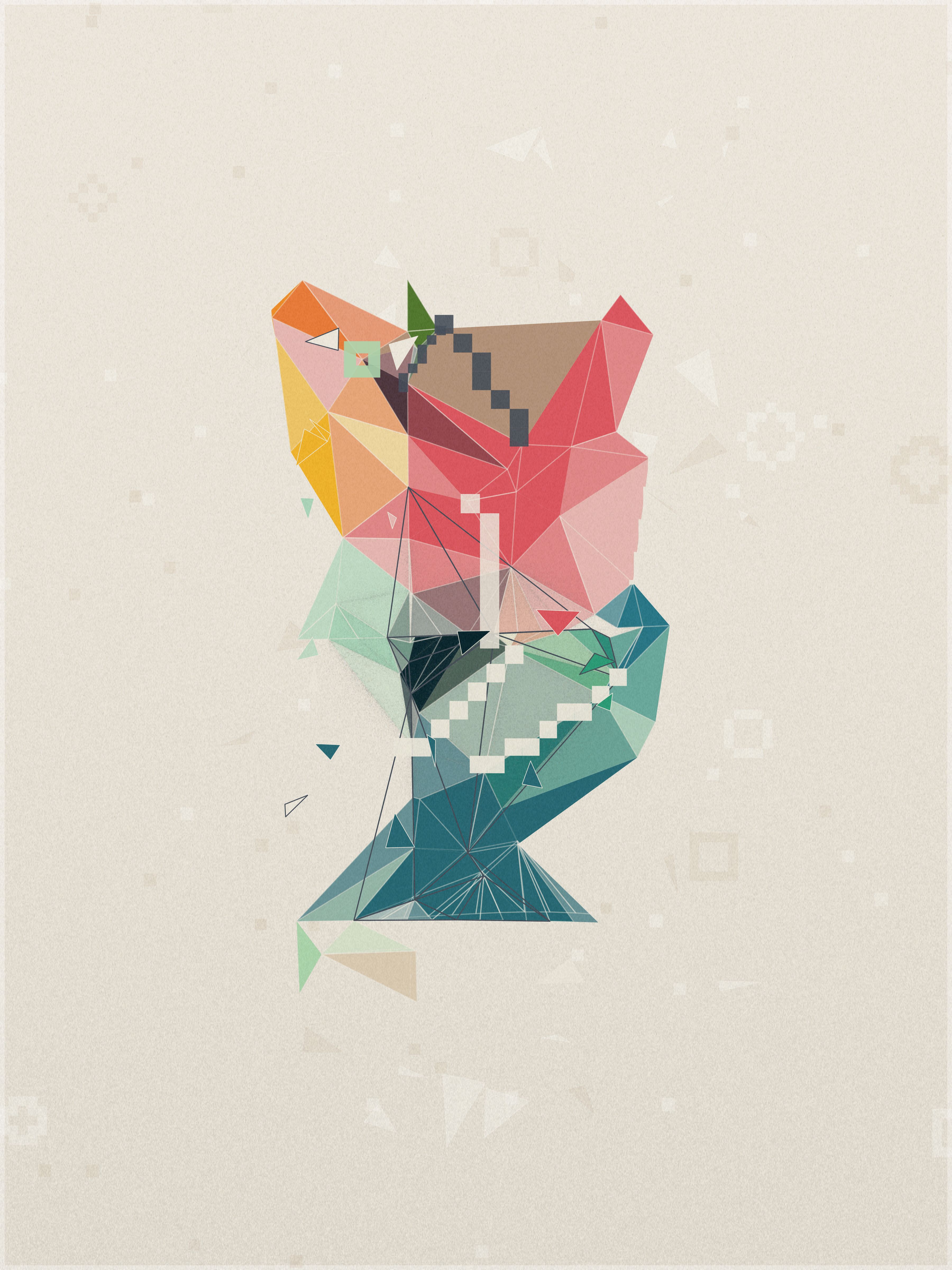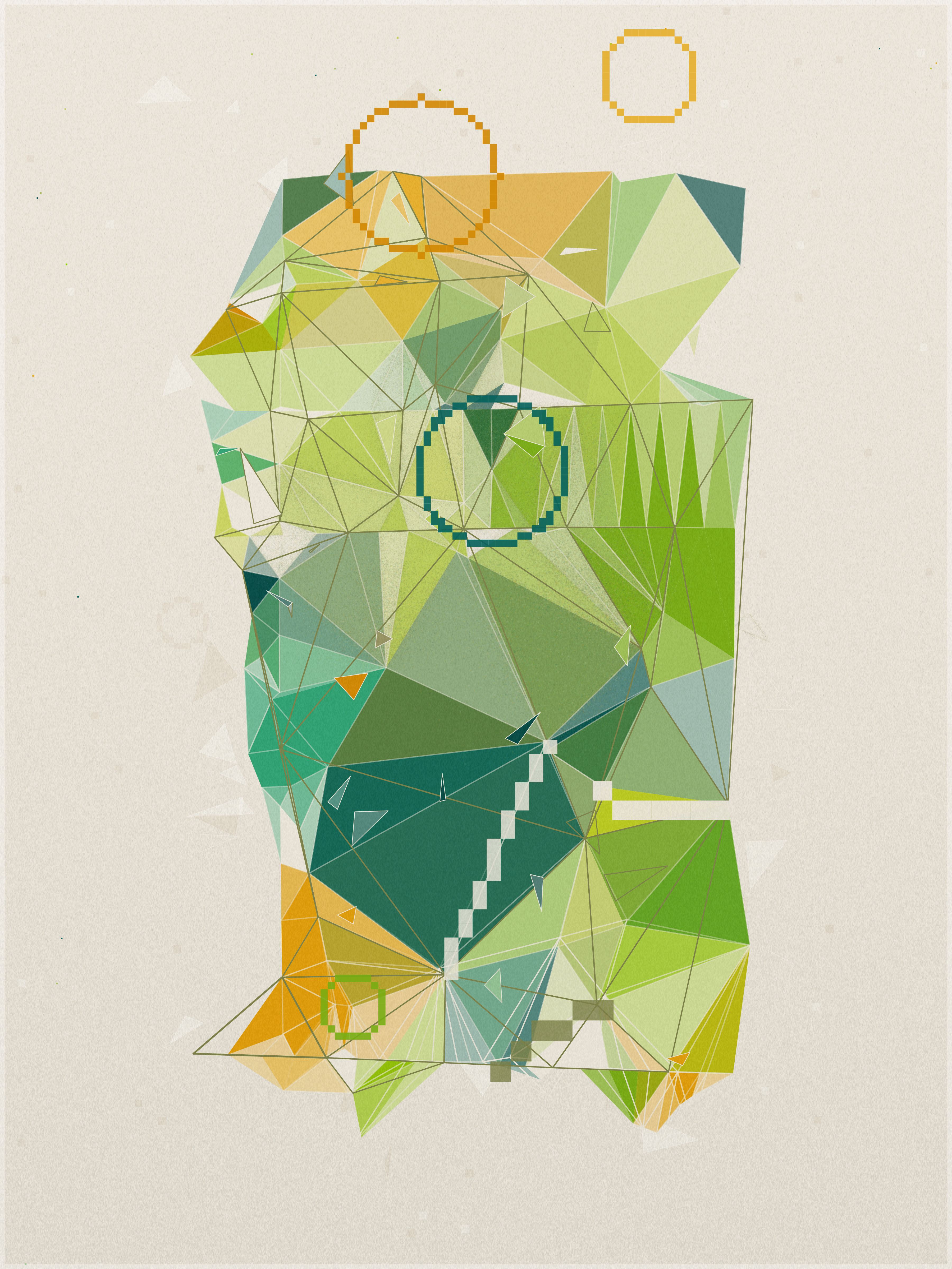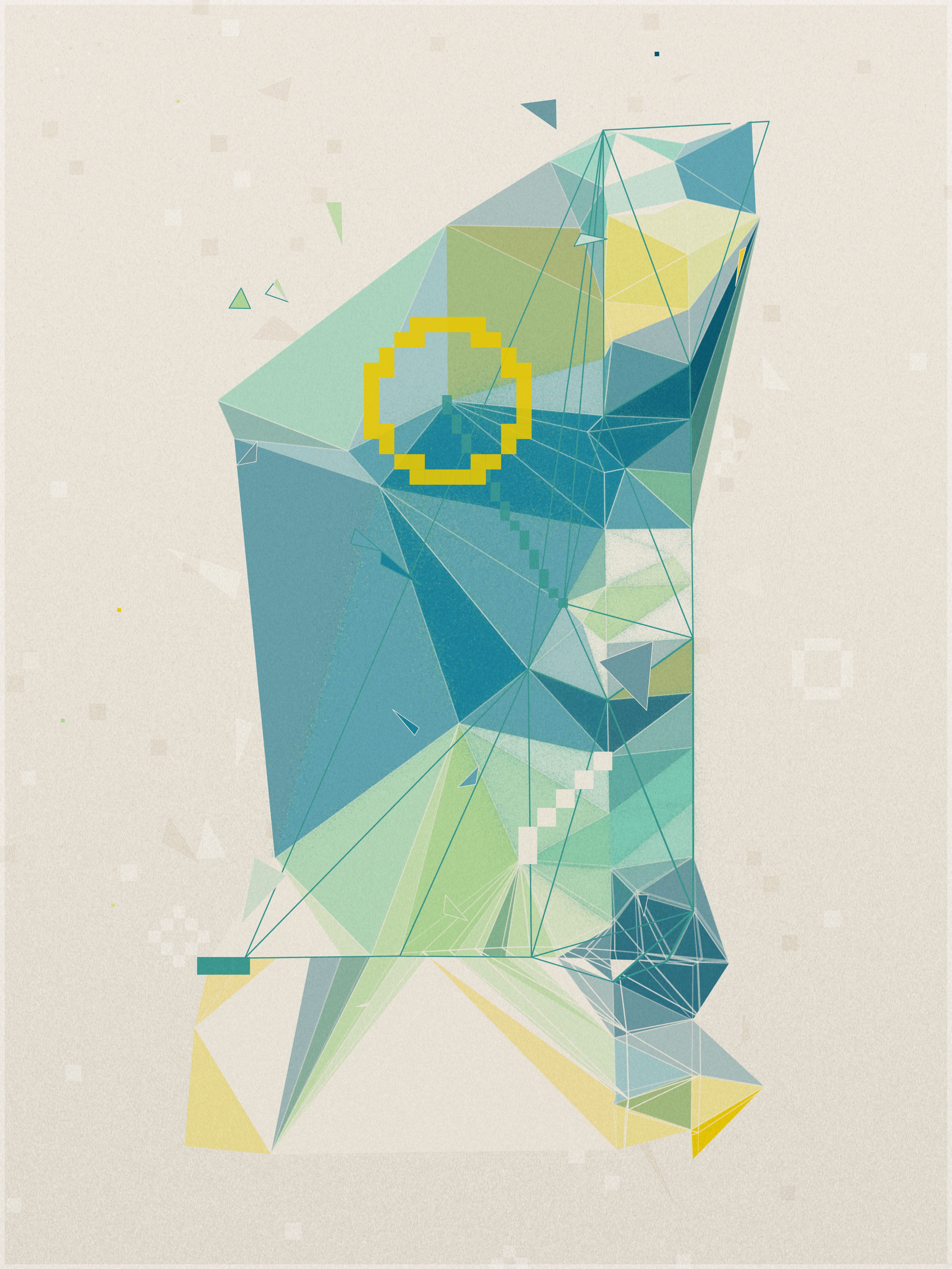 First, a base layer is created, where the colors of the palette flow in an organic pattern. On top of this, each triangle samples five key points: the center, the three vertices, and the midpoint of its longest side. The algorithm calculates an average of these values to define the triangle’s final color.