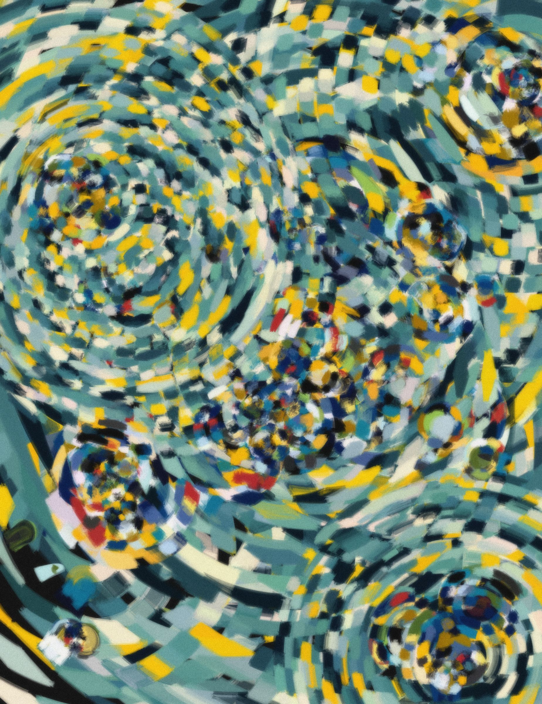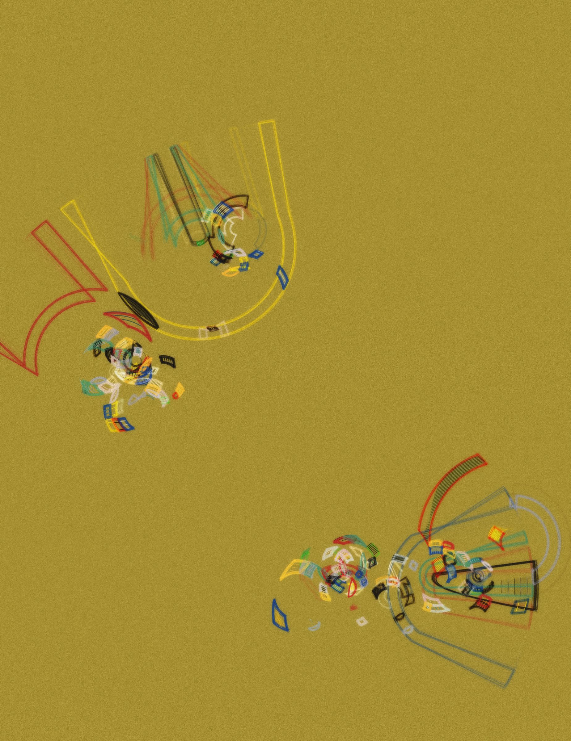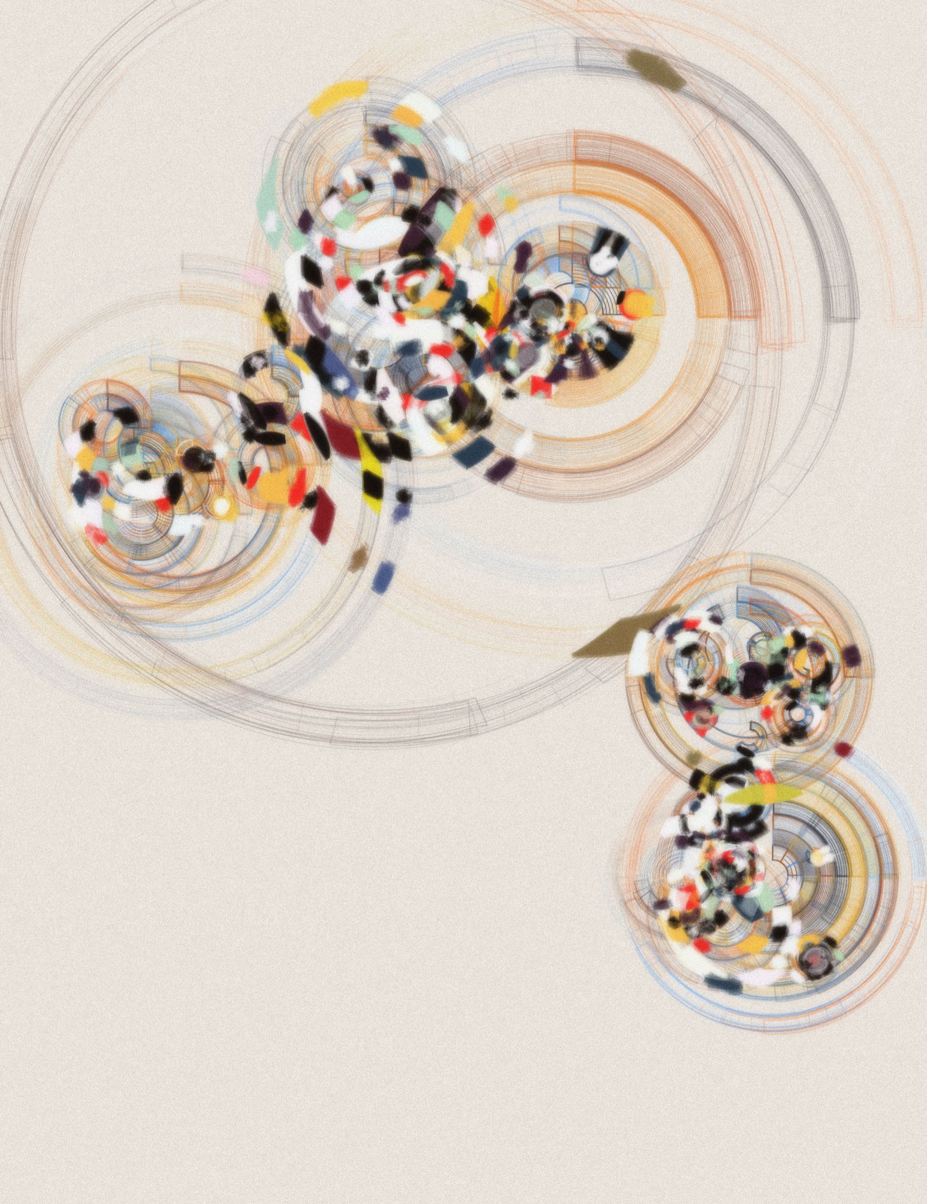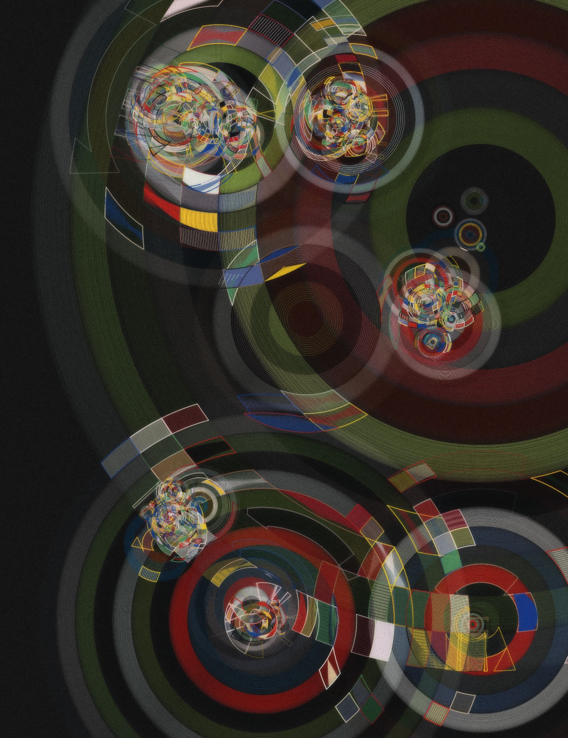 Project Description: Our lives are scattered across several time scales, and the meaning of every event that takes place depends on the time scale that we choose to define & observe them from. Yet we fail to fully comprehend this in our daily errands. Entretiempos is an artwork that reflects on this, based on an aesthetic that pays a tribute to the works of Sonia Delaunay, František Kupka and other painters from their era, recreated by the usage of intersecting rings that create a varied and rich space.
