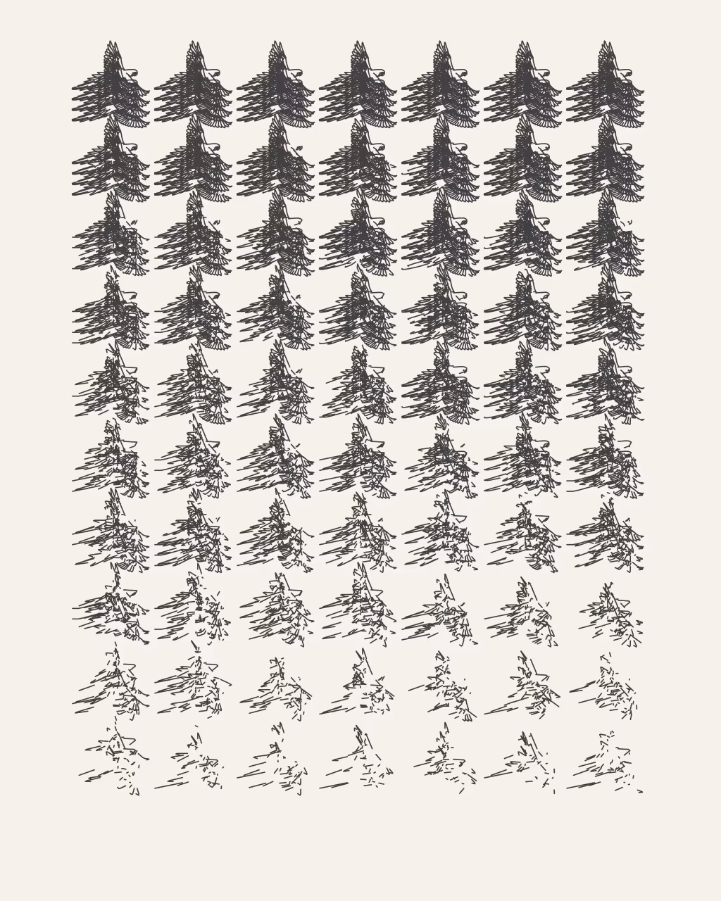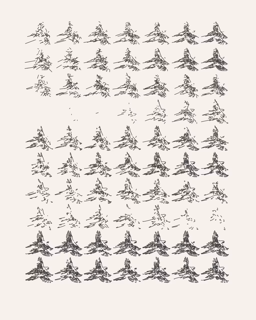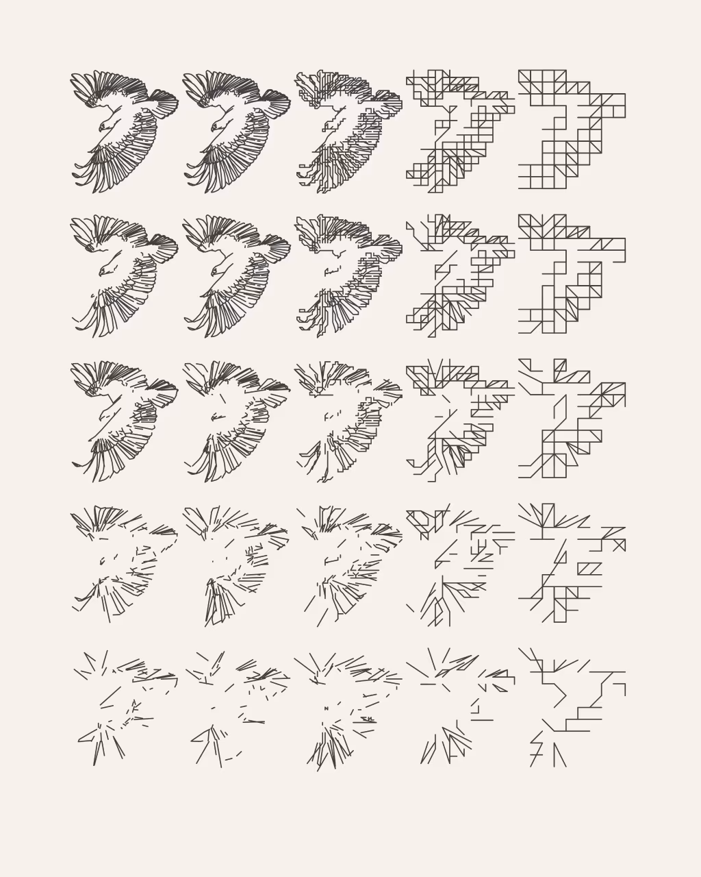 A plotter drawing is a physical drawing created with a mechanical drawing machine. In the 1960s, plotters were created to automate precise technical drawings, but were co-opted by artists in order to explore new ways of creating art. Before high-resolution printers and computers with screens, plotters were the primary way that code became drawings. Today, using a plotter to create images from code is one decision among many others. Making plotter drawings is difficult and wonderful, and the artists in –GRAPH are passionate about this medium. They share a love of working with visual systems and writing code, and transforming how the code is rendered through drawing machines. Each of the six artists in –GRAPH have created one software artwork that creates 30 unique physical drawings. Alongside these drawings, millions of other compositions are embedded in the software, to be viewed through an interface created by each artist. — Casey Reas