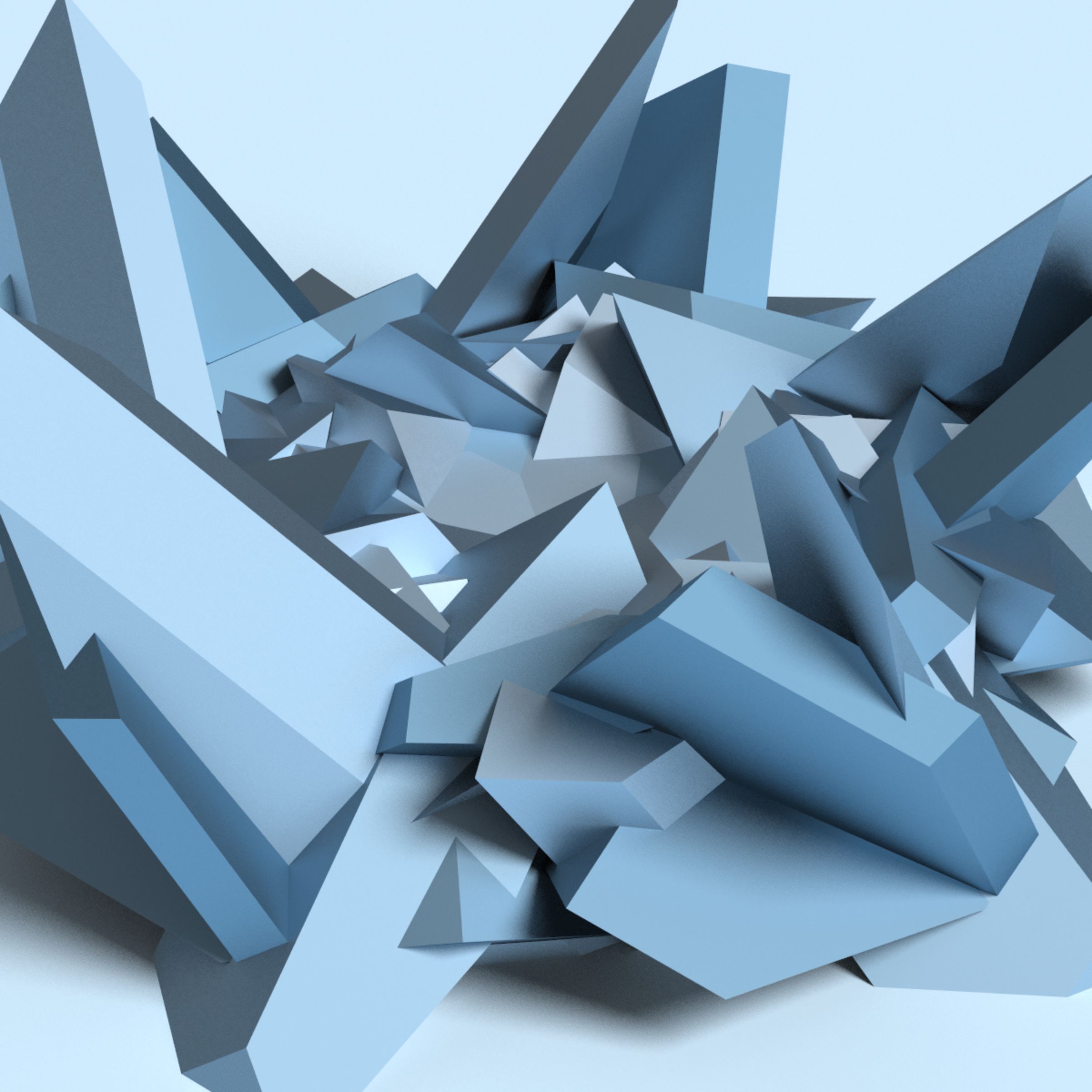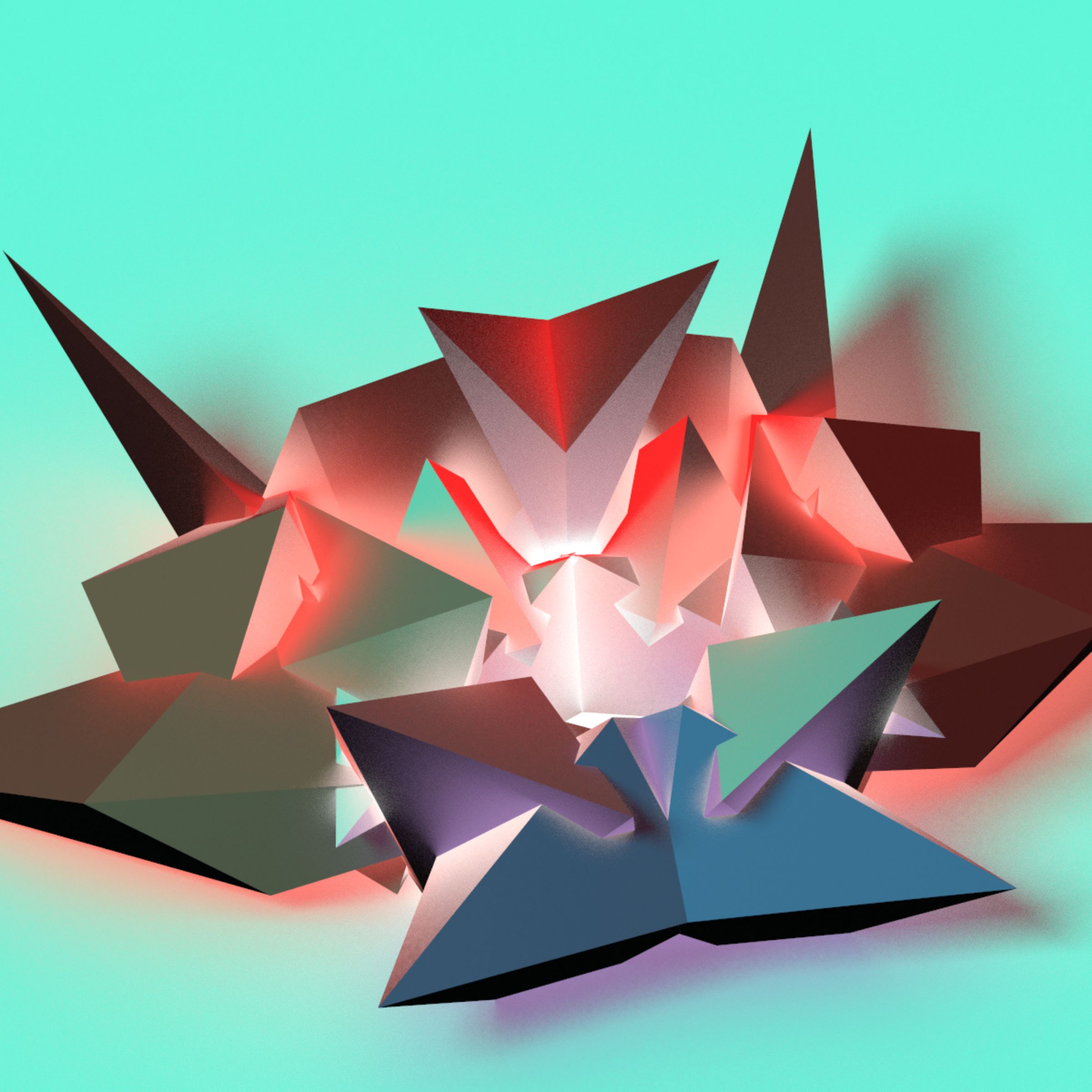 Polyhedra are distorted and duplicated around a symmetry axis, intersecting and merging into a great diversity of forms. These forms are rendered in a light simulation with different colors and material properties. The sharp edges of the shapes carve out light and space, casting soft shadows, glows, and reflections.