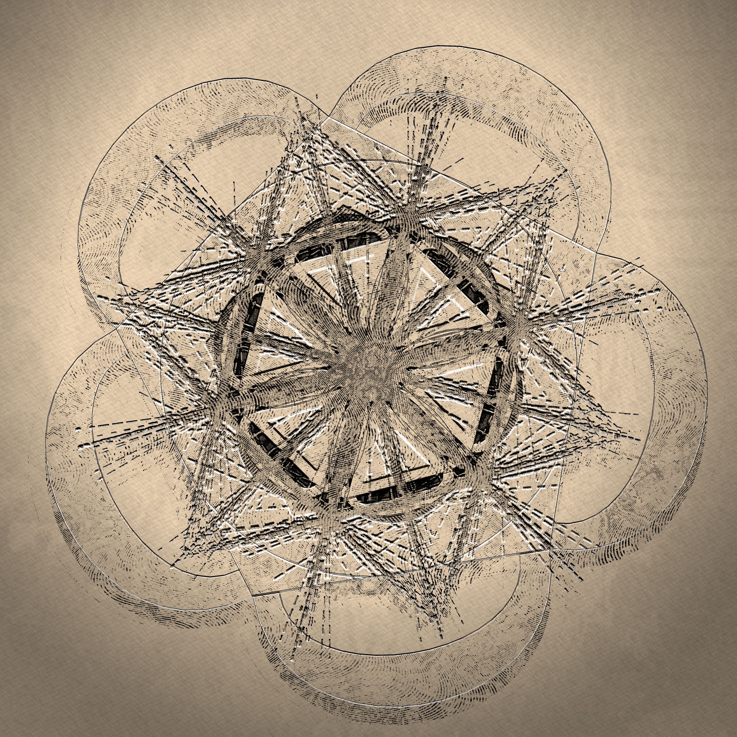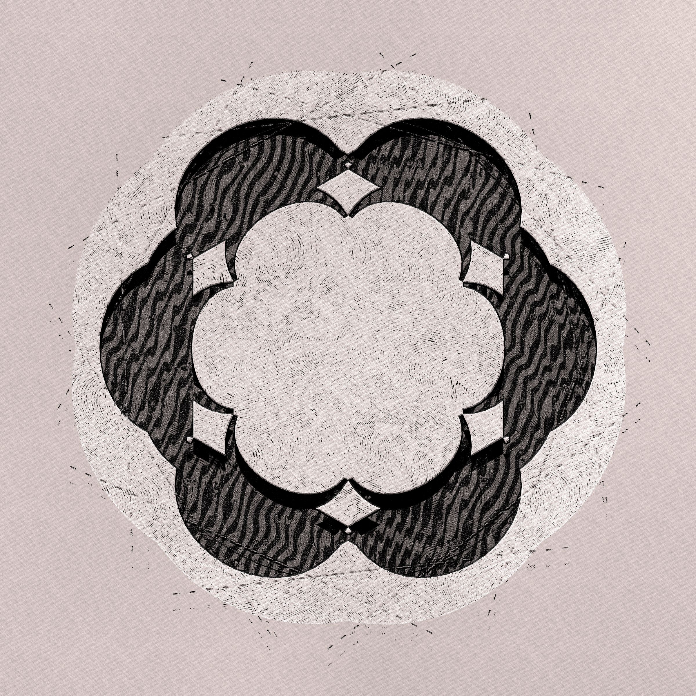 Flourish’s logic uses a linguistic structure that treats simple shapes like an alphabet and arranges geometry into phrases, establishing and dissolving symmetries. This logic is similar to a formal grammar system with rules that describe how words can be combined to form sentences. As a very simple example, a rule for the English language might be that a noun phrase can be followed by a verb phrase. So, a person dances, a cat sleeps, a bird sings. In the context of Flourish, pentagons can be subdivided into triangles, which can be enclosed by circles to create complex patterns. As geometry is combined and rearranged, the linguistic-like structure of the image changes, which also changes the next possible sets of geometric operations.