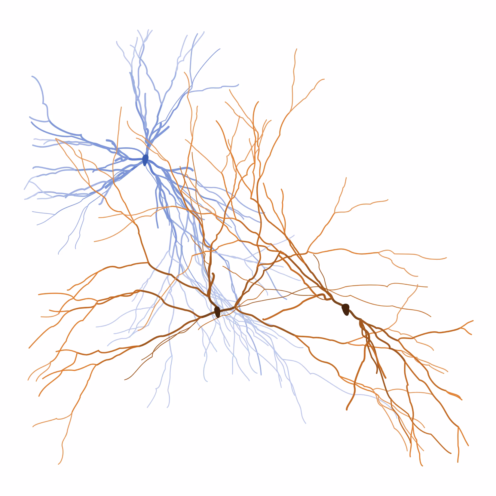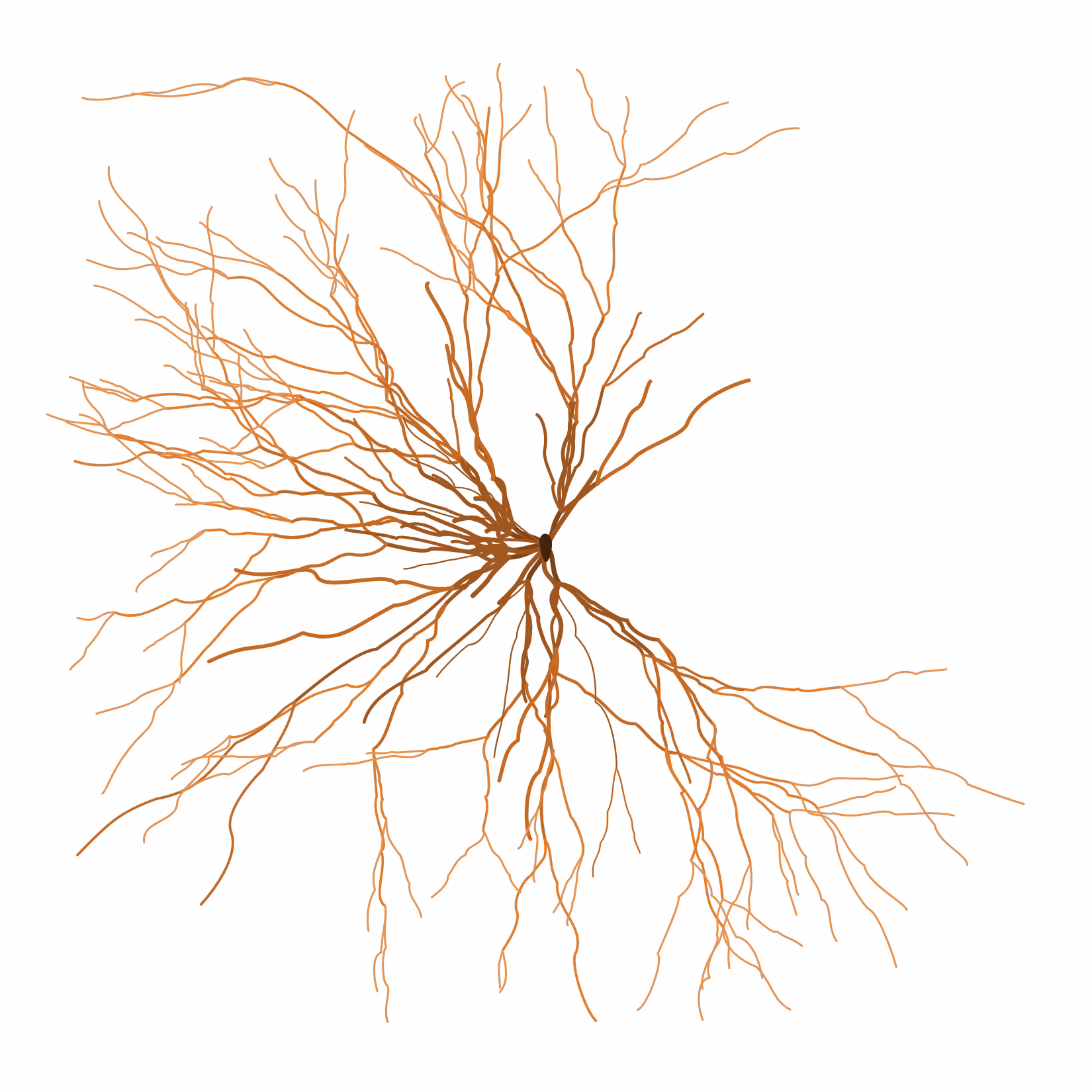 Ghost Forest Seedlings captures the organic growth patterns of a living, underground network of tree roots. The artworks depict a seed or group of seeds growing into an intricate root pattern, or seedling. Eschewing most computer-derived growth patterns, which create geometric and fractal patterning, the algorithm Lin has created generates artworks with growth patterns that are