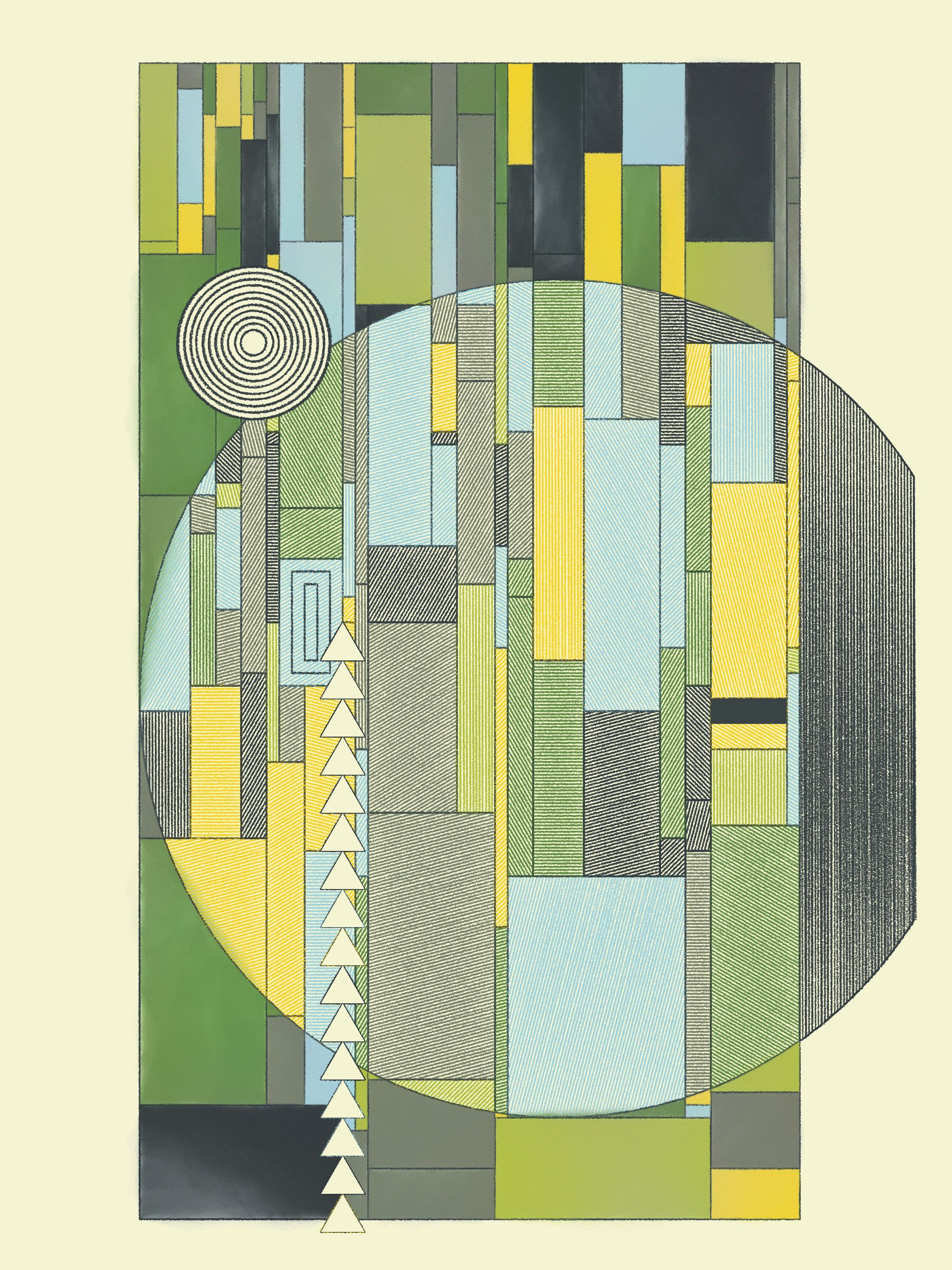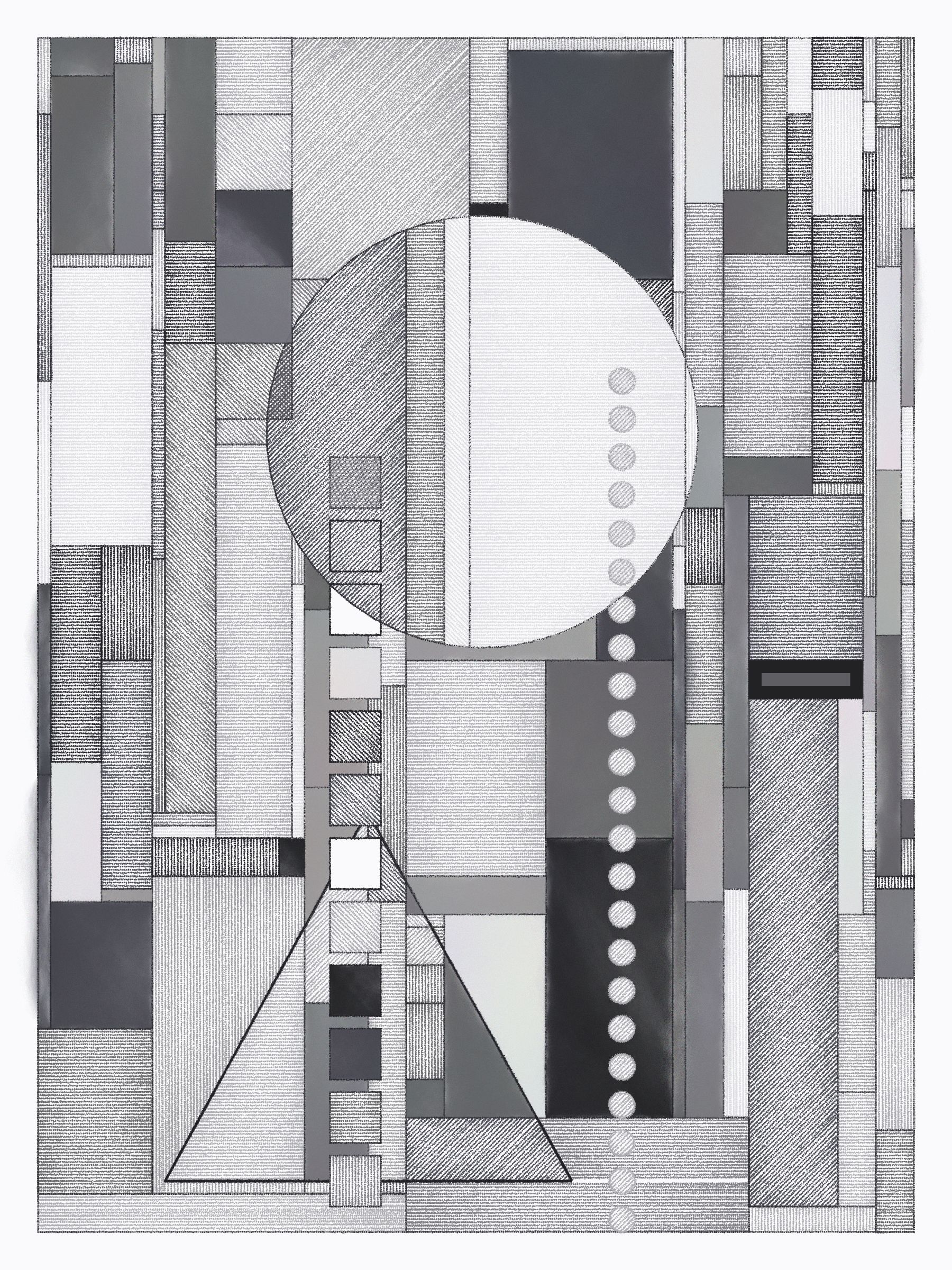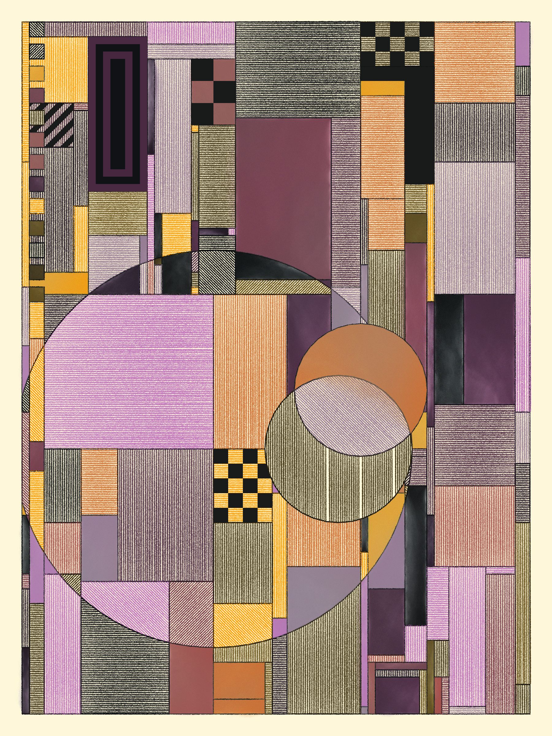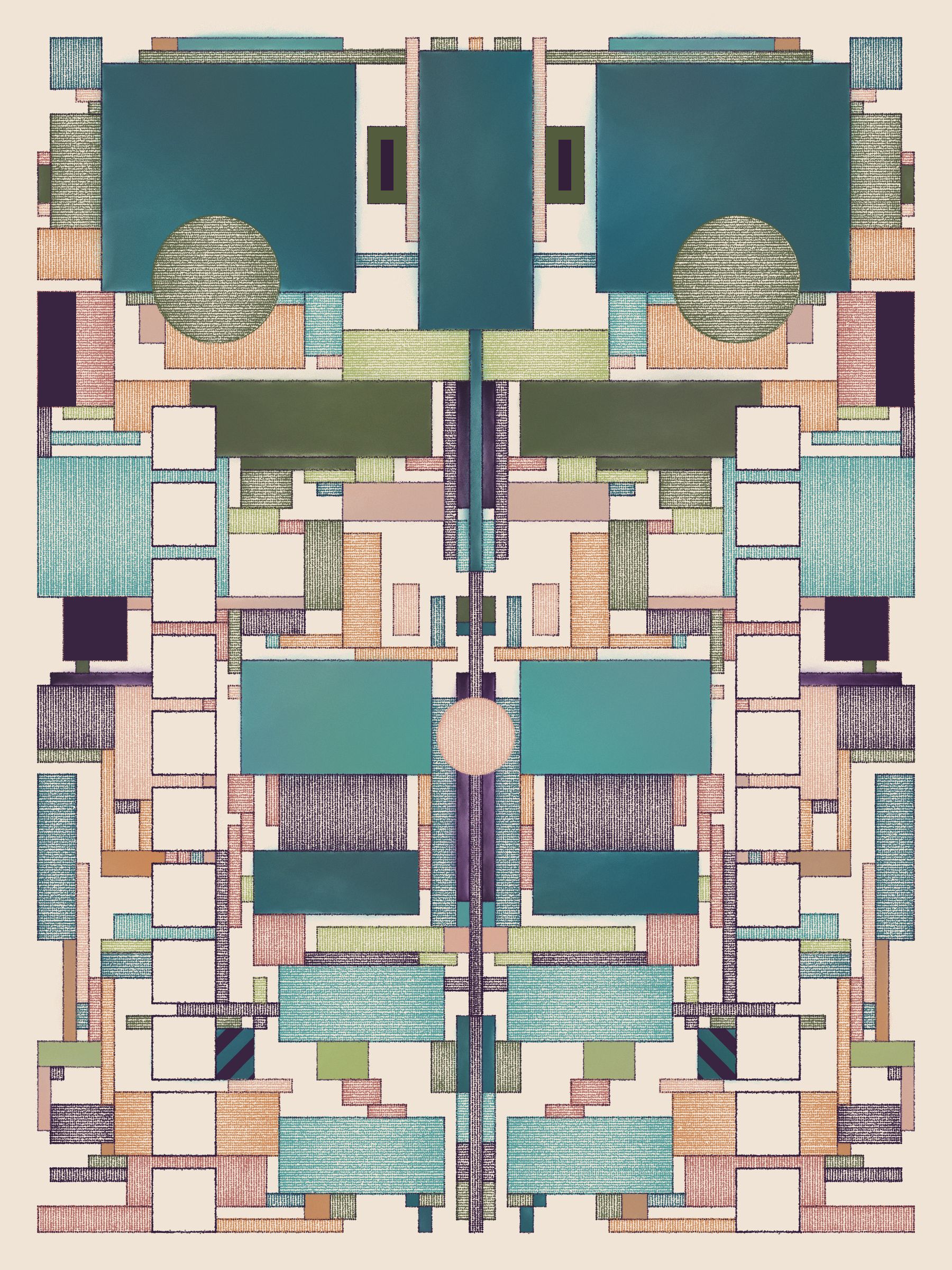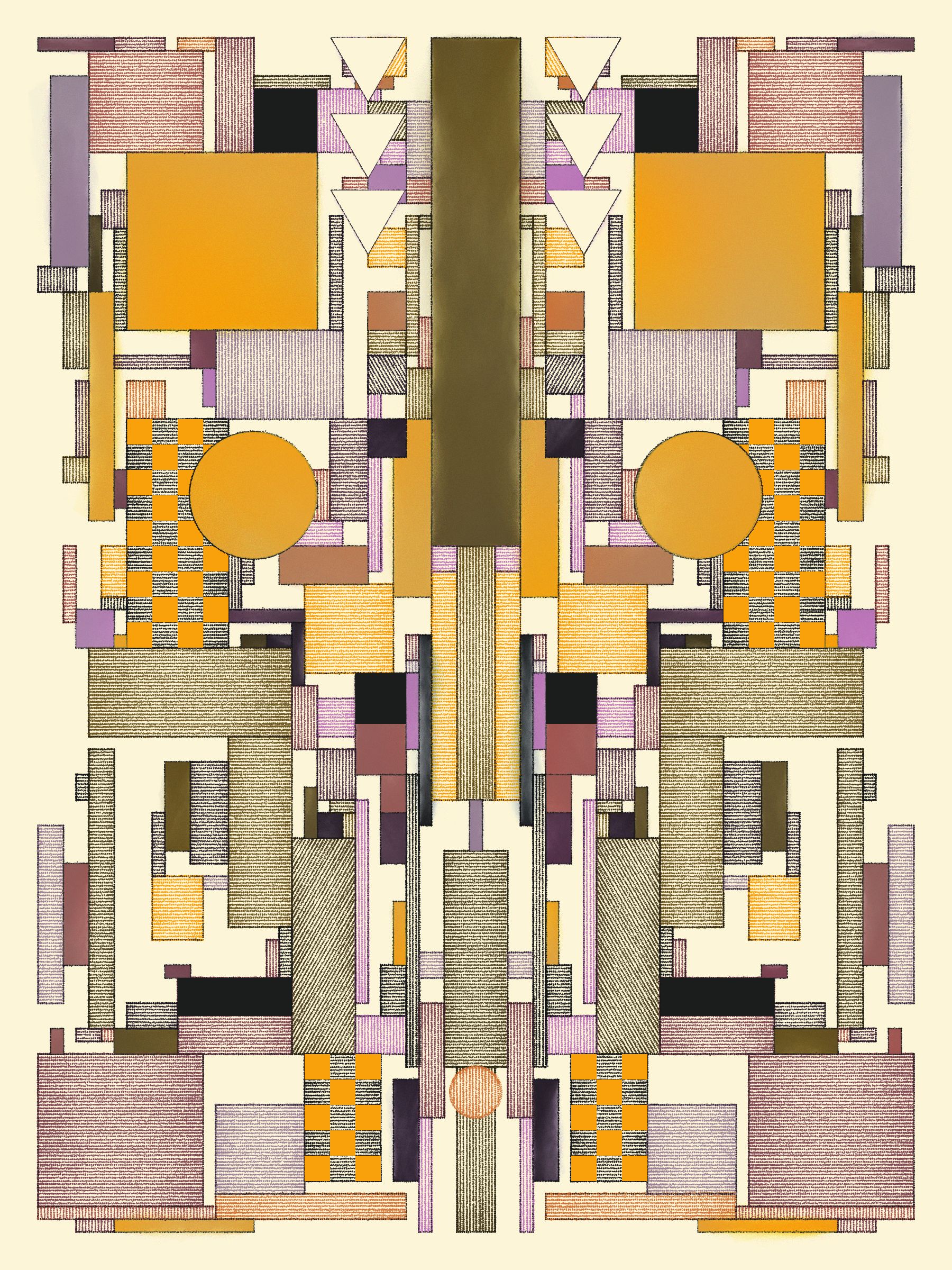 These works blend inspirations from Frank Lloyd Wright's decorative works, Art Deco patterns, the Bauhaus school, and Sol Le Witt's rules-based art practice into fresh new compositions.