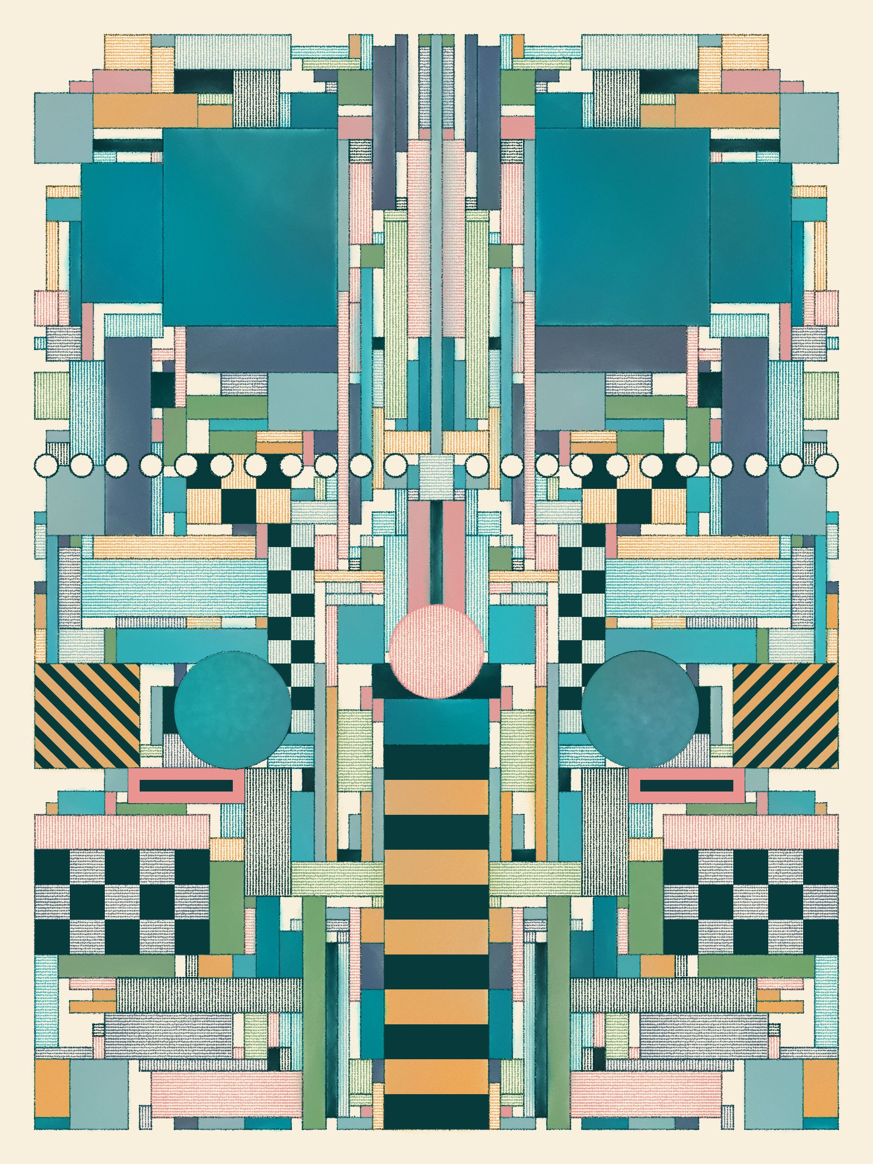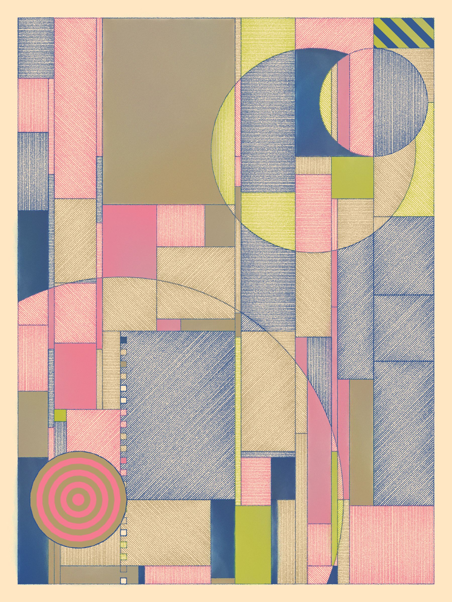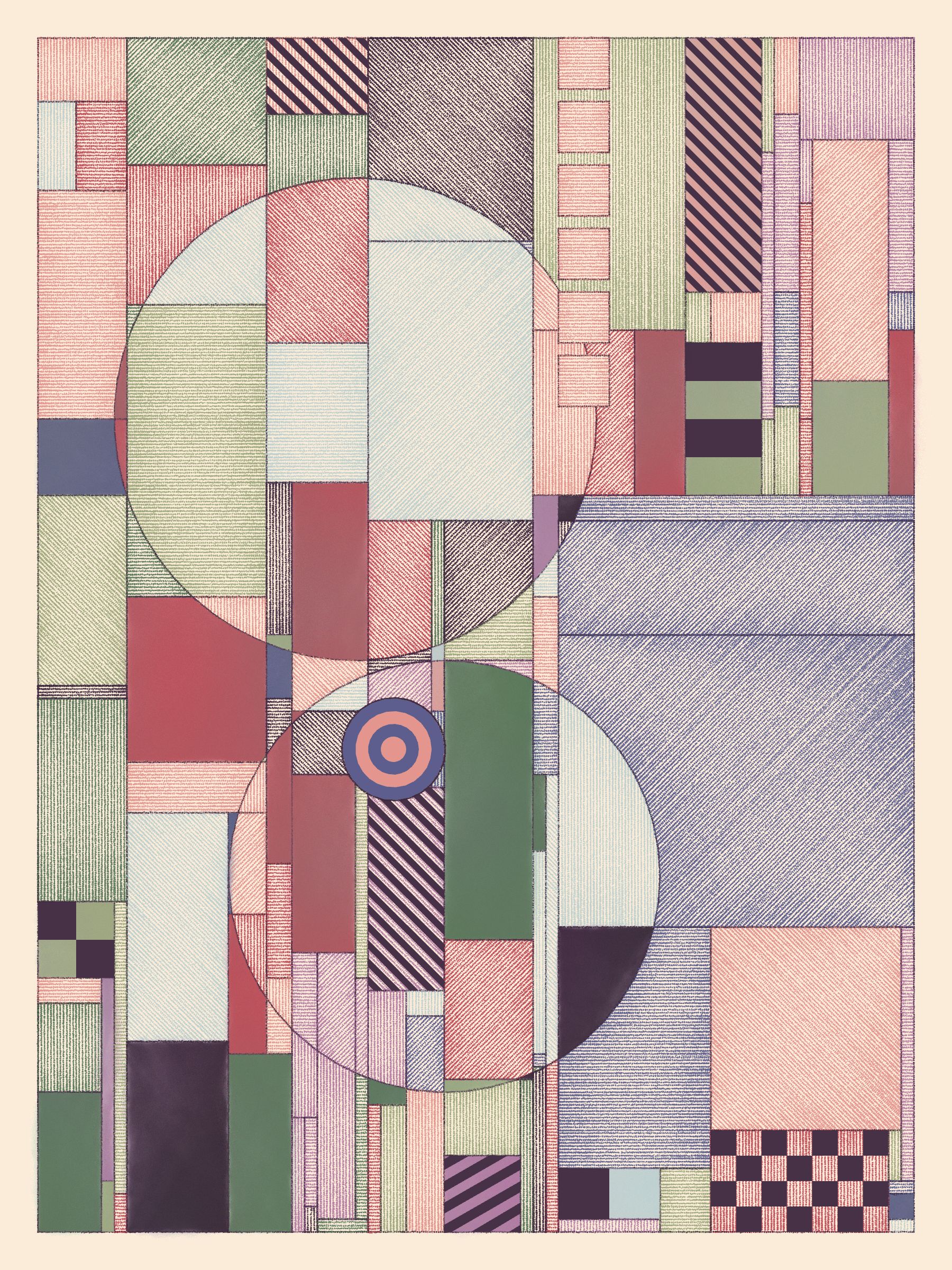 This code-based gen art series explores how simple design rules can lead to expressive compositions. Watercolor washes and cross-hatching add a hand-made feel to humanize each piece and soften the vibe.