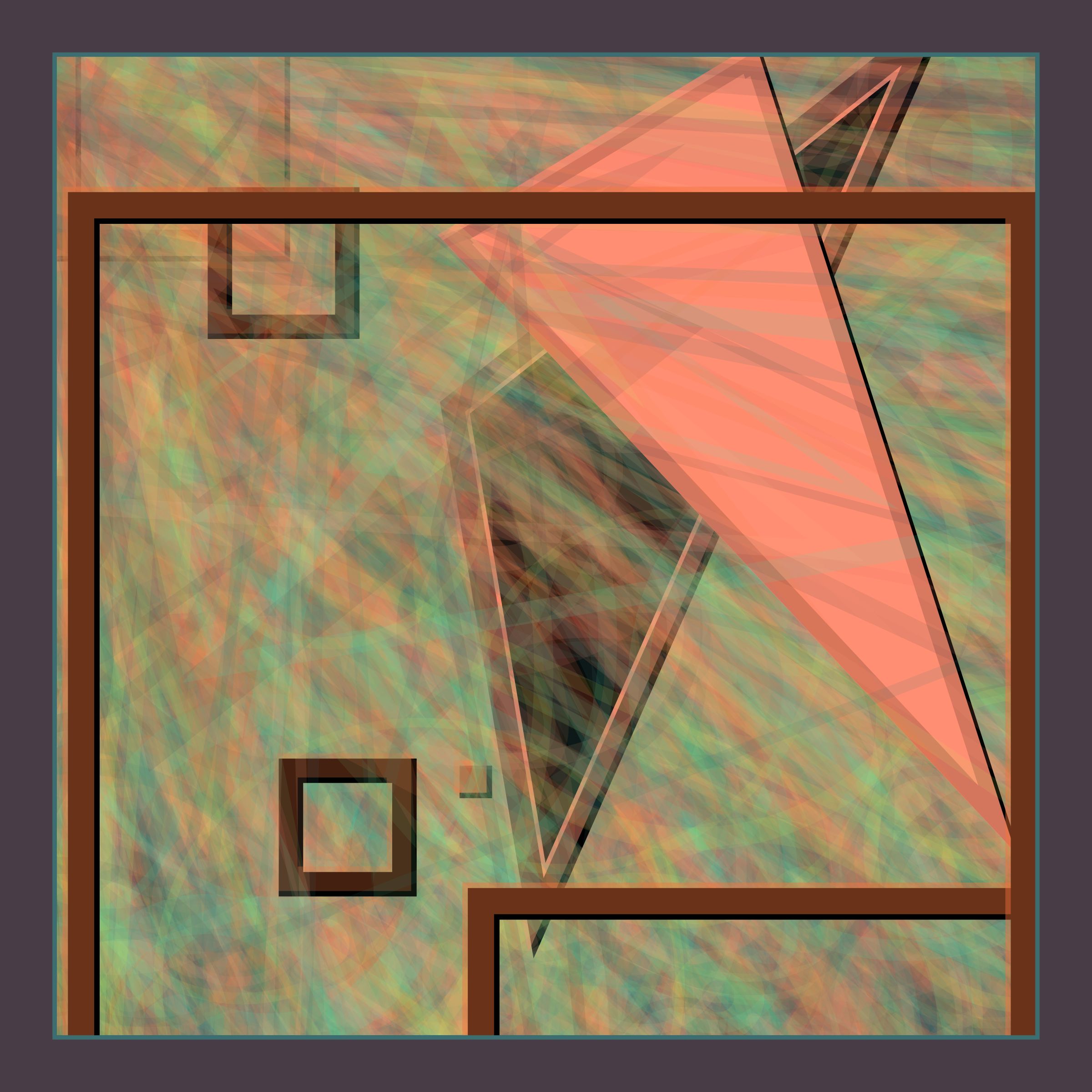 Project Description: A labyrinth of geometric specters. Shapes are painted between layers of fog and sometimes presented encased in bold frames. Shadows are cast to create depth and entice the viewer to step inside. Each invocation represents an imaginary room in an abstract maze-like building.