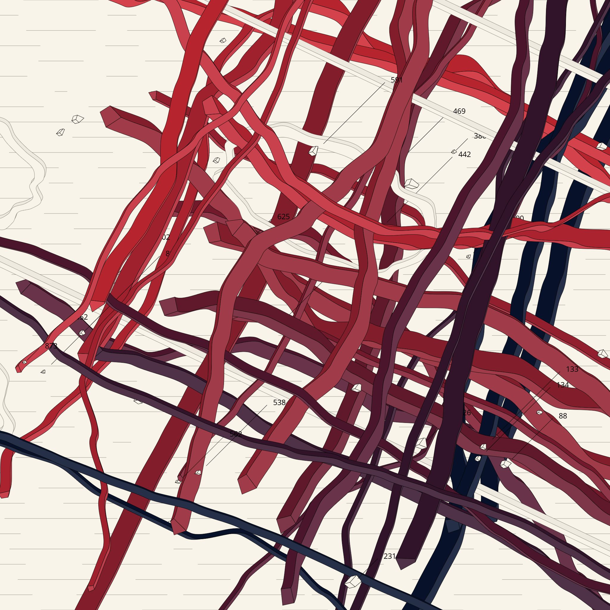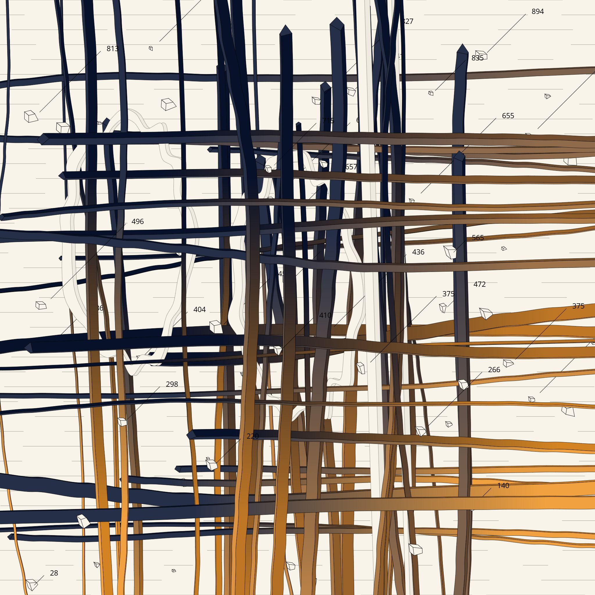 "Latitudes" is a series of infinite animations in which a number of long extruded shapes travel in set directions with only minimal deflections. On their journey, shapes cross over one another while occasionally encountering loops, beams, and numbered asteroids.