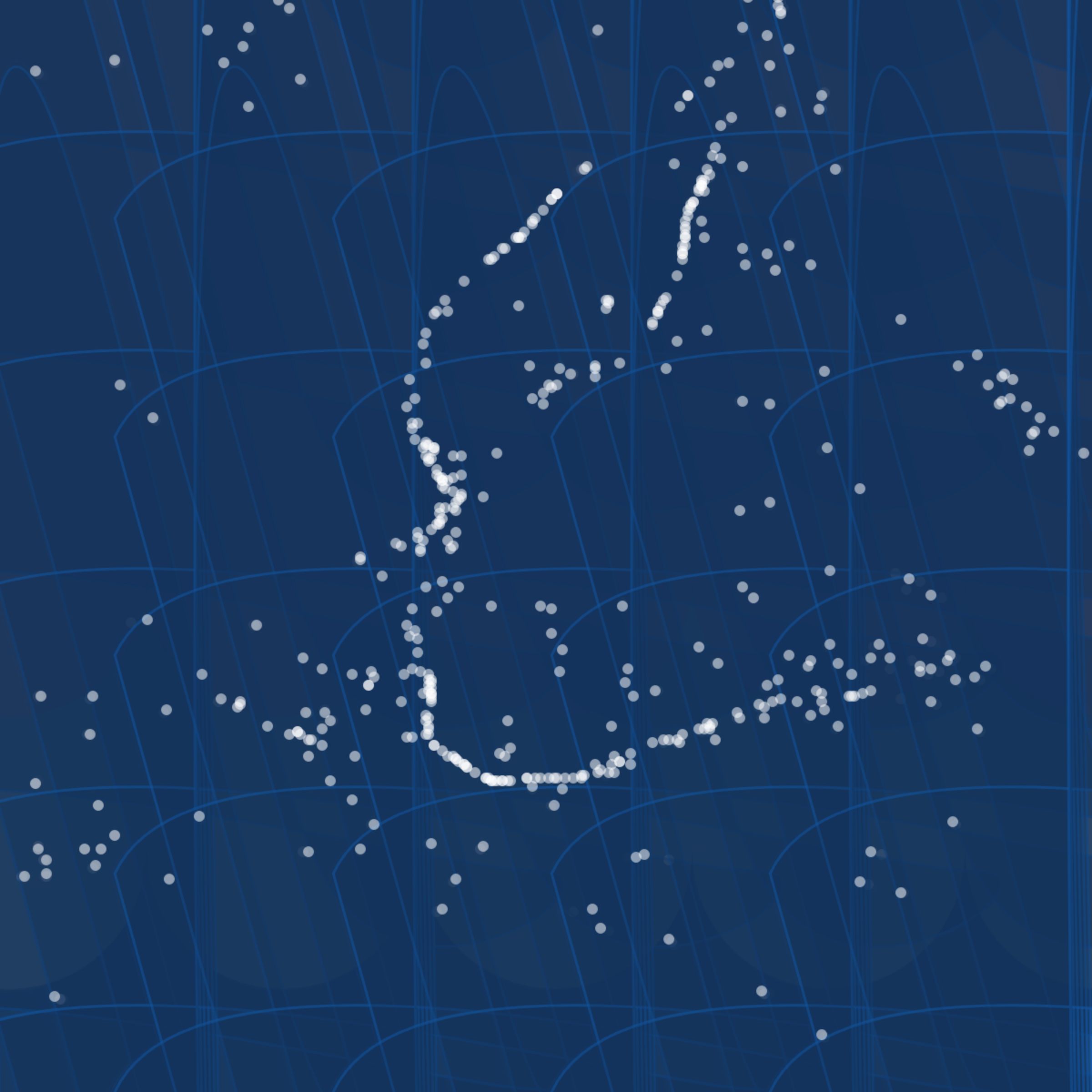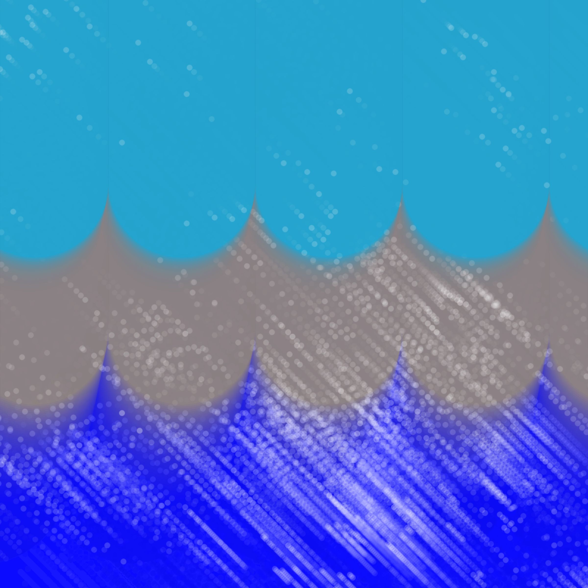Unique invocations of this algorithm consist of any number of several core components including waves that rise and fall, a flow field powered mist, and droplet shapes arranged in a dancing field that are distorted in a rhythmic, sometimes stormy animation.
