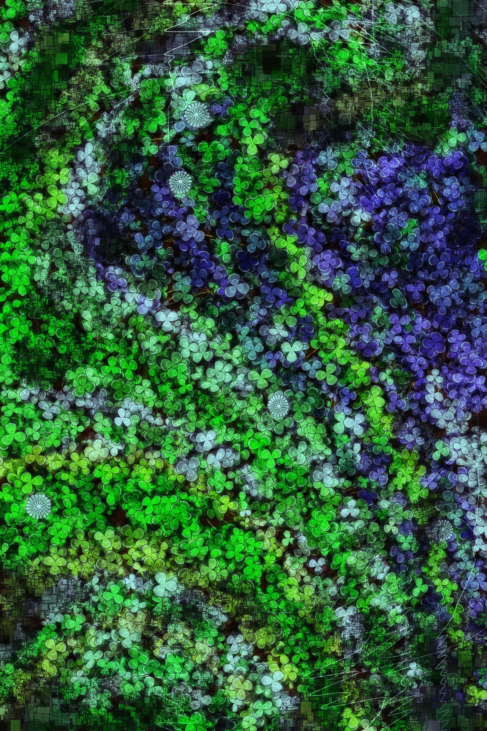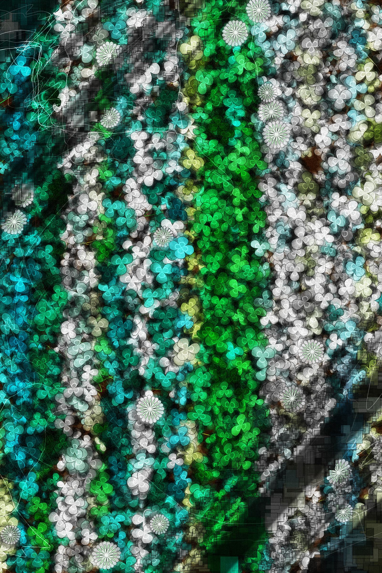 The algorithm in Lucky Clover was designed to be both realistic and surreal. The output is simultaneously photographic and illustrative, merging three-dimensional and two-dimensional elements. The myriad of clovers that fill the screen form a variety of patterns. Every color, placement, and flow is unique. Among the features assigned to the output, the “Number of Four-Leaf Clovers” is the most important feature of the work. Each output also corresponds to a specific time of day, evoking memories of the search, whether at sunrise, sunset –– when you don’t want to go home yet –– or else during mystic moonlight.