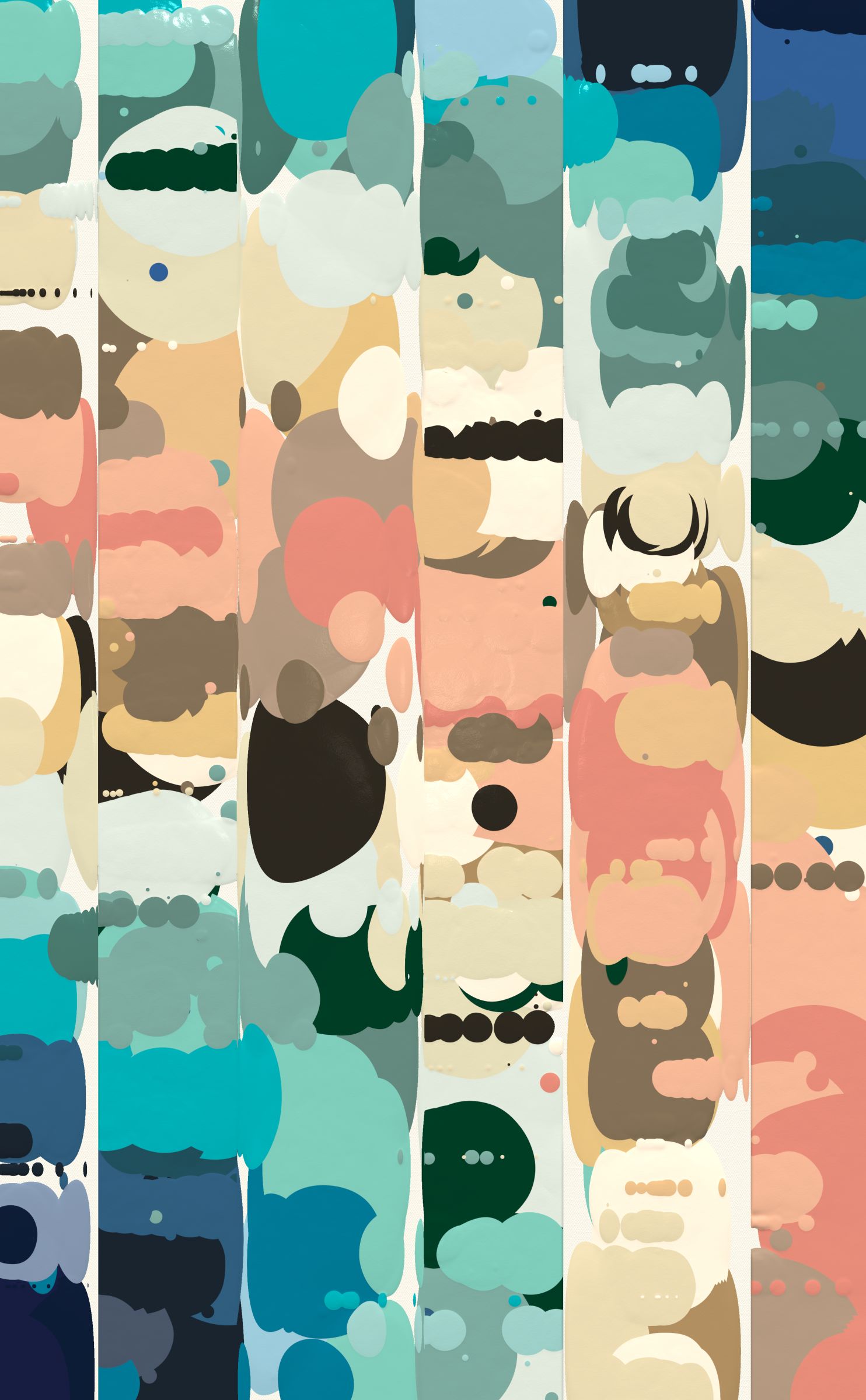 Proscenium's world is adorned with stylized structures, above which formations of paint drops are suspended in the air. As gravity takes hold, the paint falls and bounces across the land. After all the drops have settled or fallen off the canvas, the terrain is flattened, all except for the paint left behind by each bounce. This technique, leaving marks in three dimensions and then flattening down to two, creates a rich variety of shapes that reflect the character of the now invisible world.