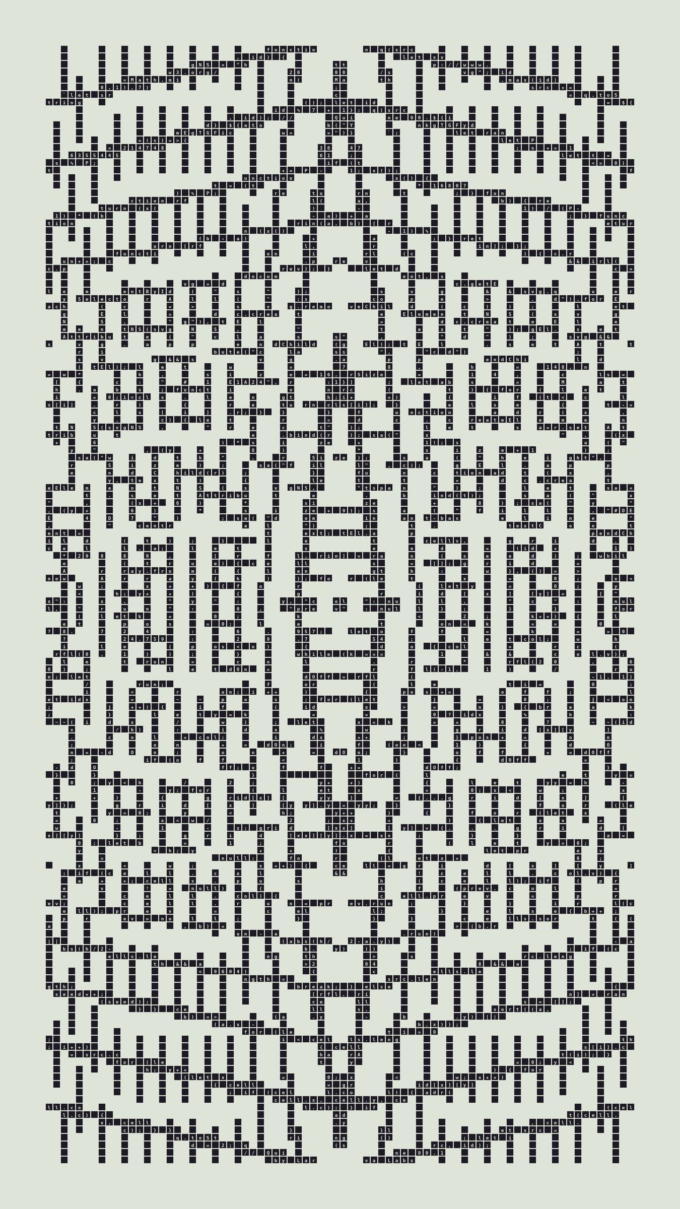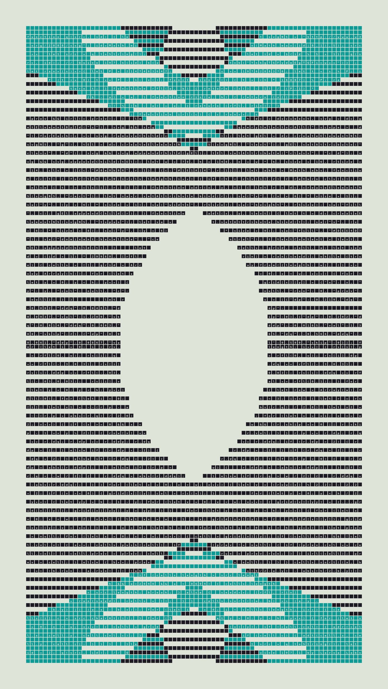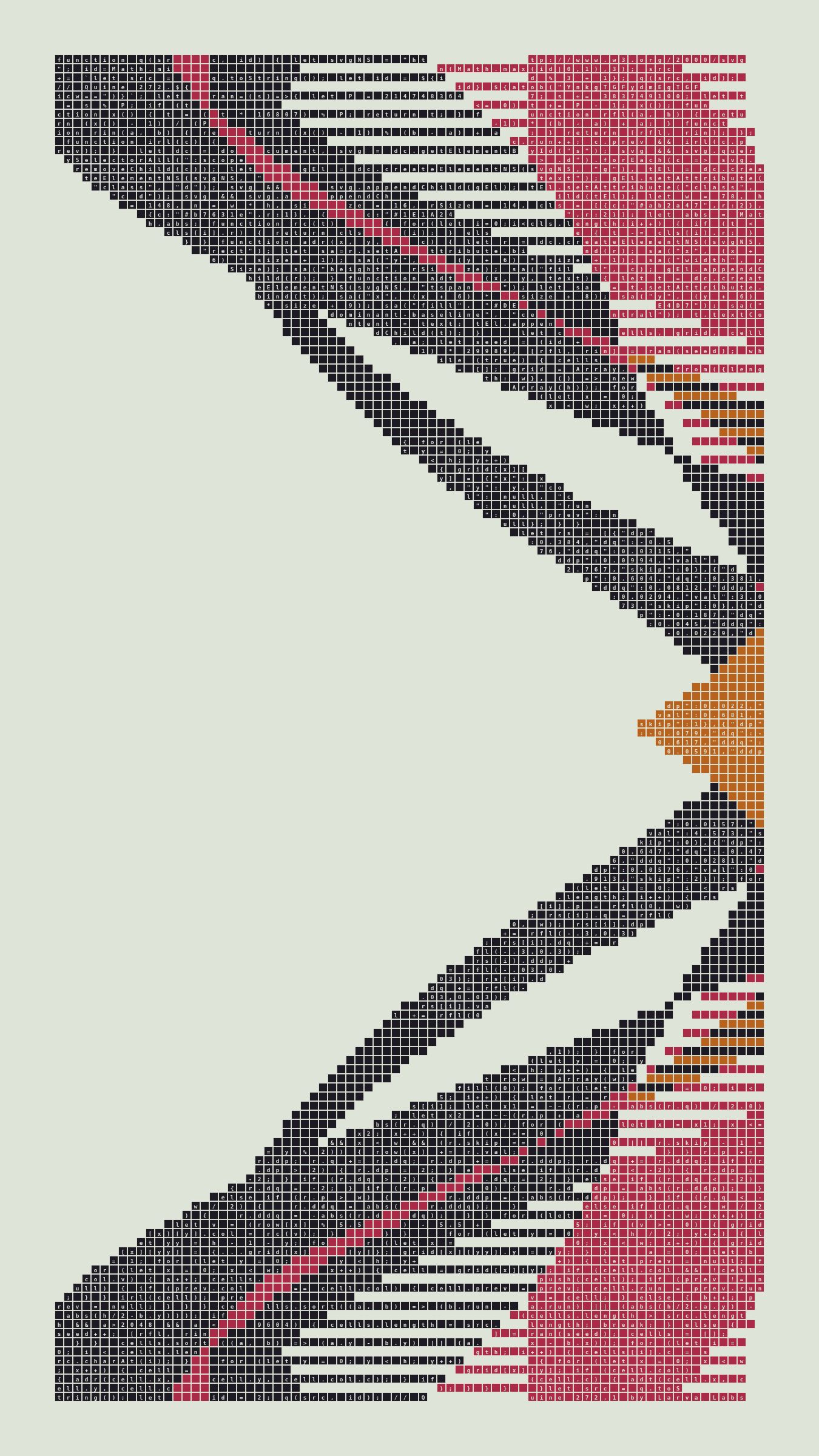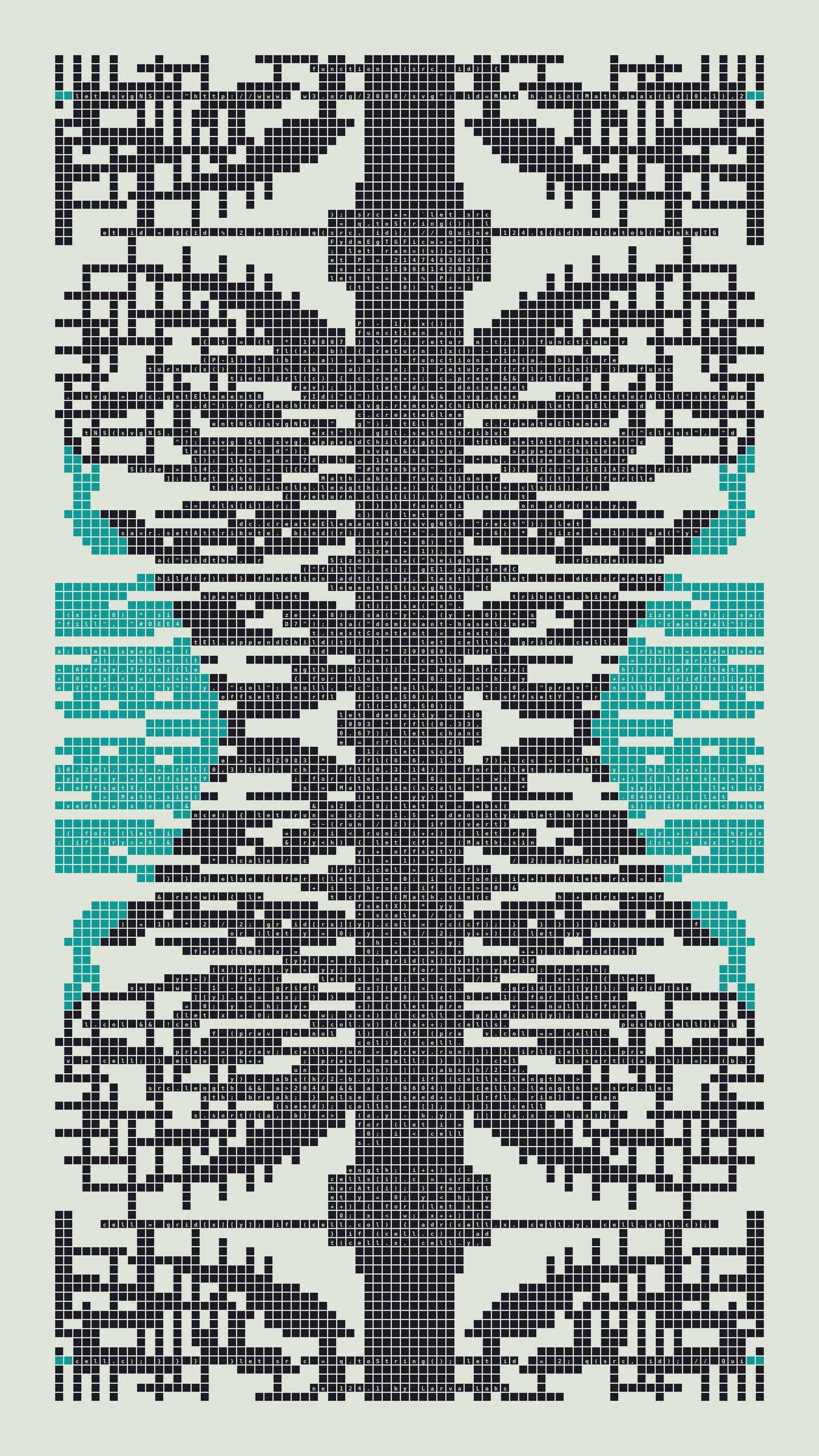 Quine is Larva Labs' contribution to the final Art Blocks Curated series, a project that underscores that all the works on the Art Blocks platform are generated directly from code with no artist supervision. Drawing from the computer science concept of a quine (a computer program that produces a copy of its own source code as its output), the work incorporates its own code into the visuals it creates.