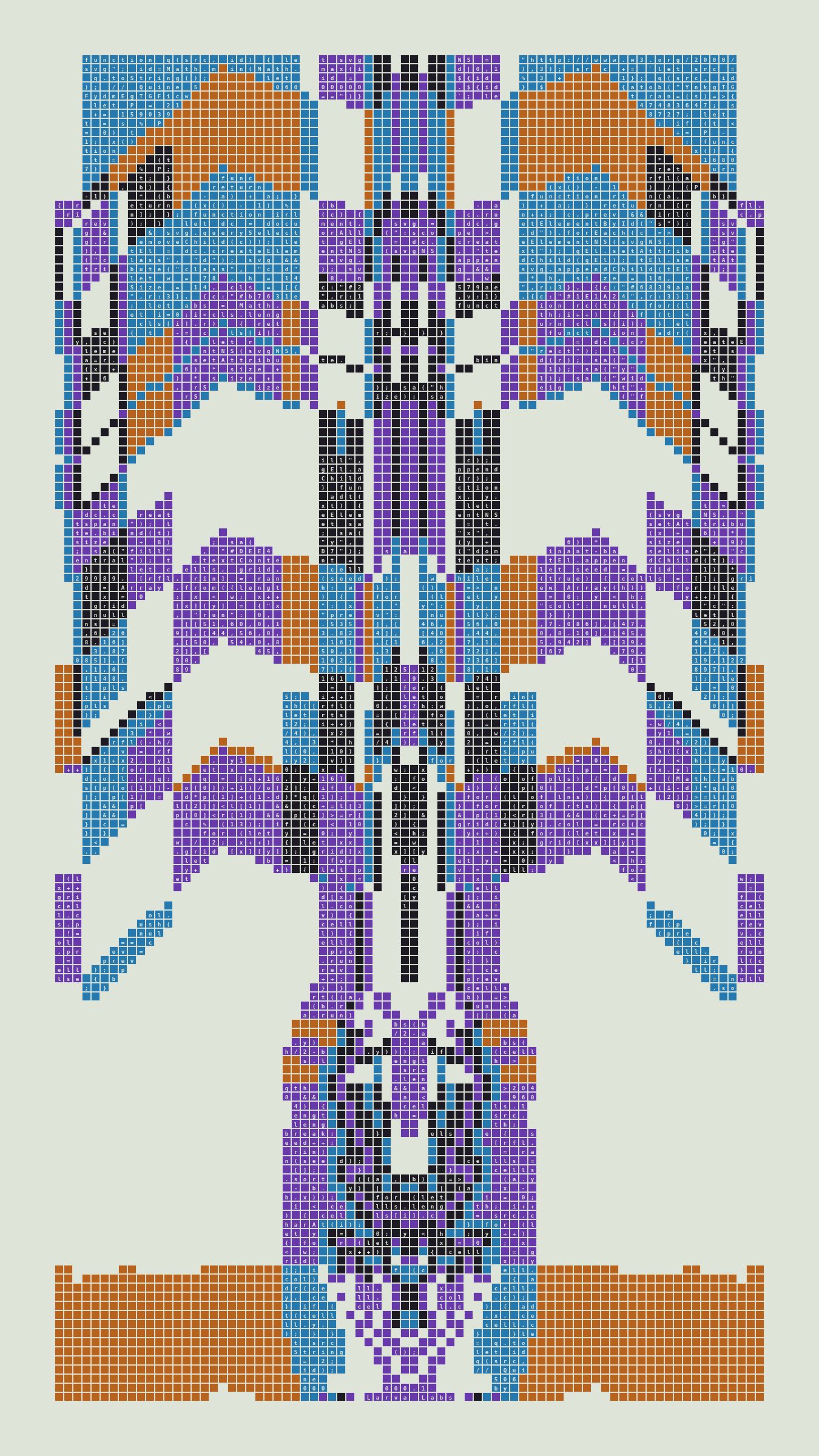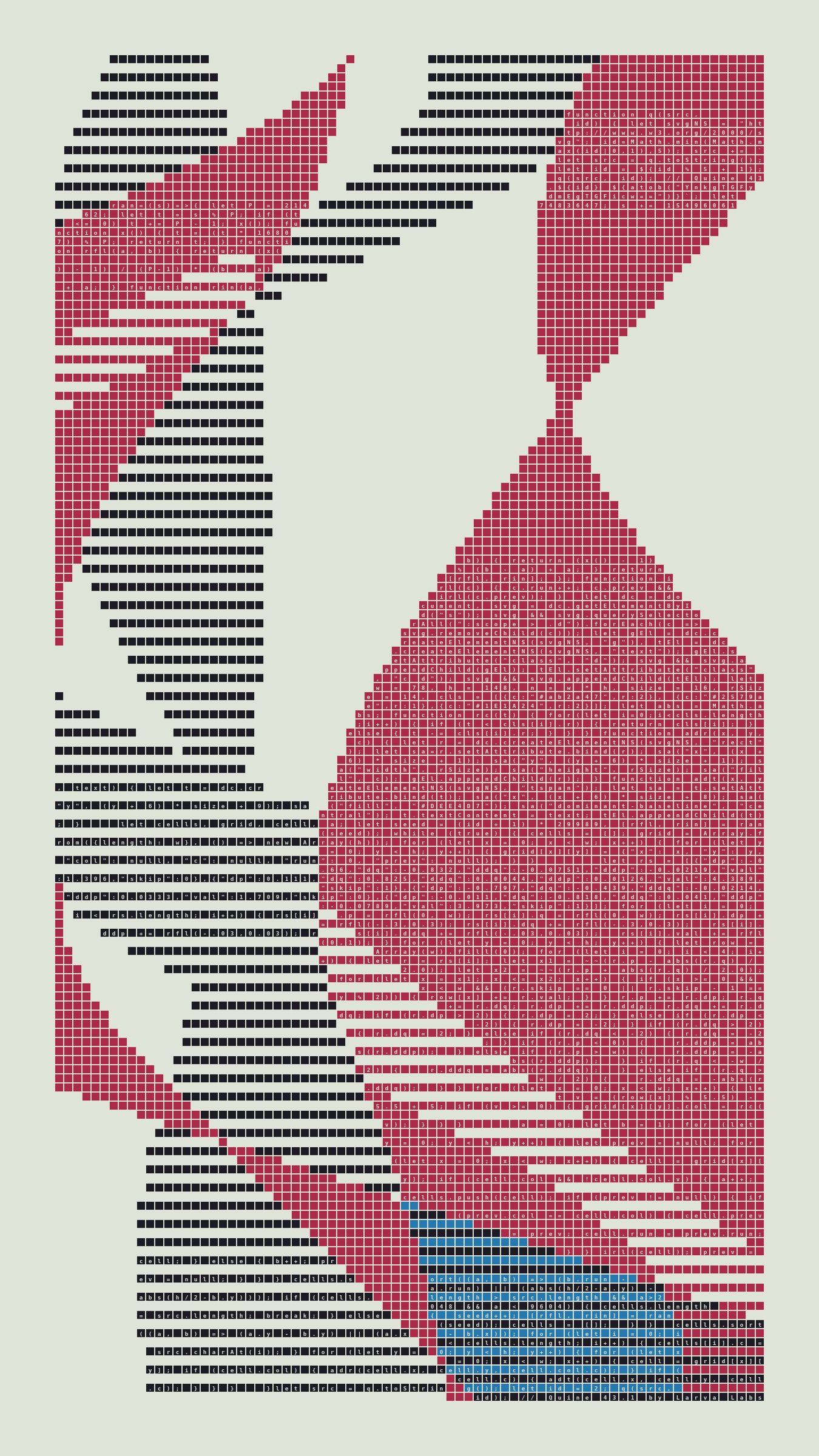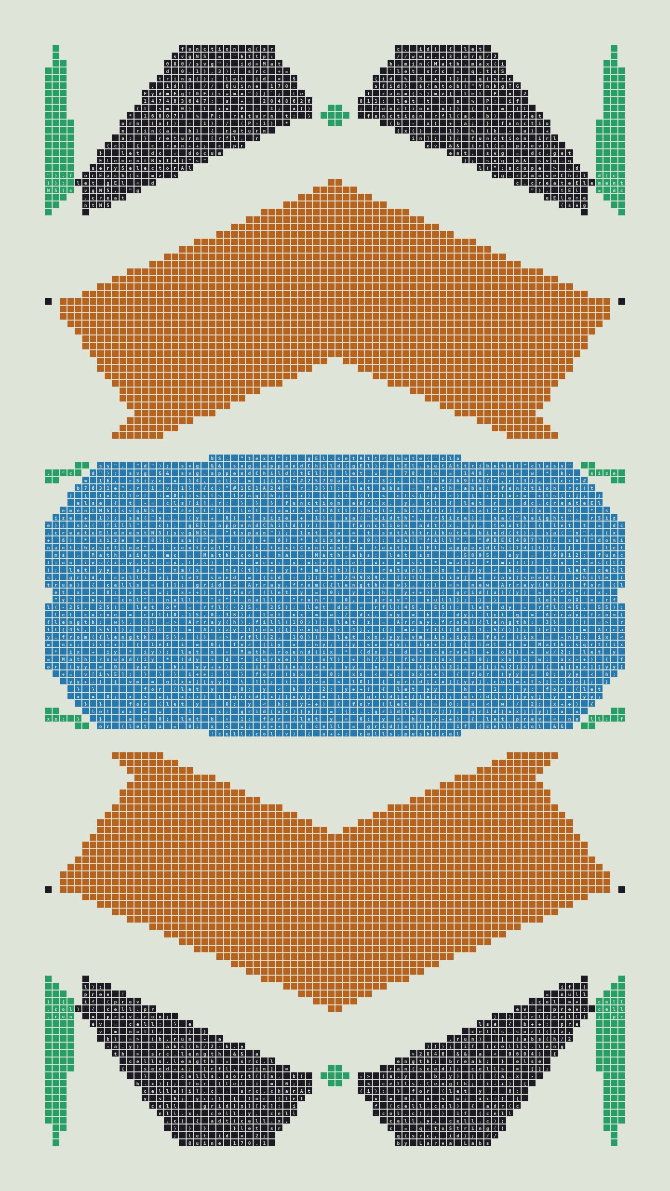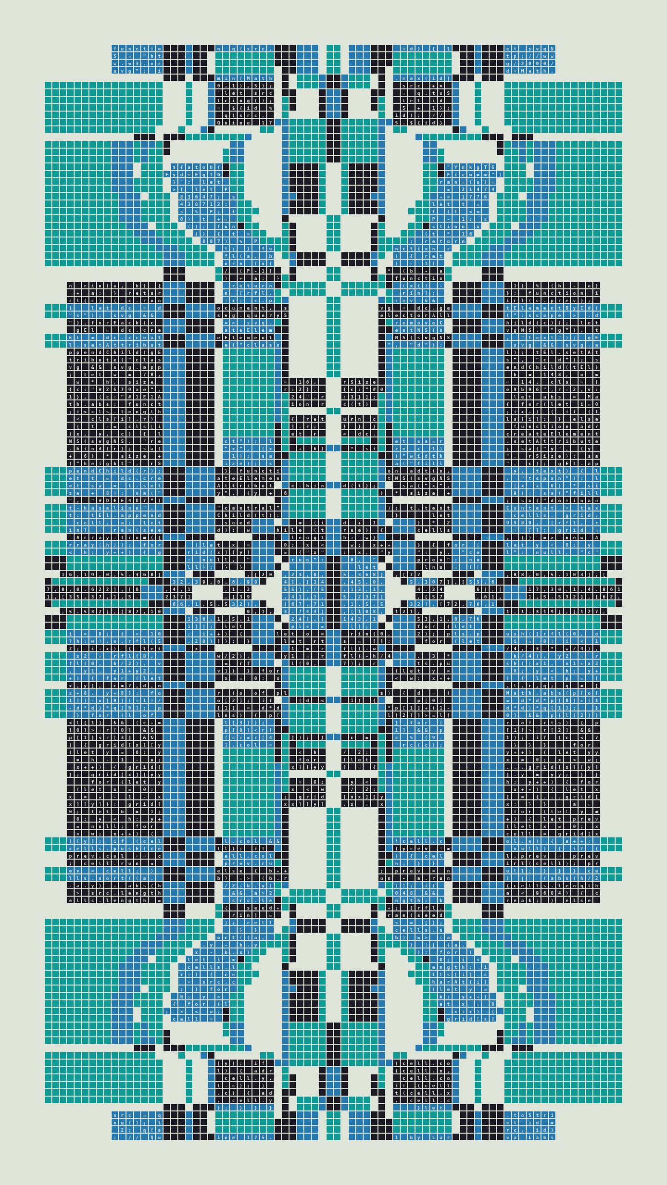 Quine is Larva Labs' contribution to the final Art Blocks Curated series, a project that underscores that all the works on the Art Blocks platform are generated directly from code with no artist supervision. Drawing from the computer science concept of a quine (a computer program that produces a copy of its own source code as its output), the work incorporates its own code into the visuals it creates.