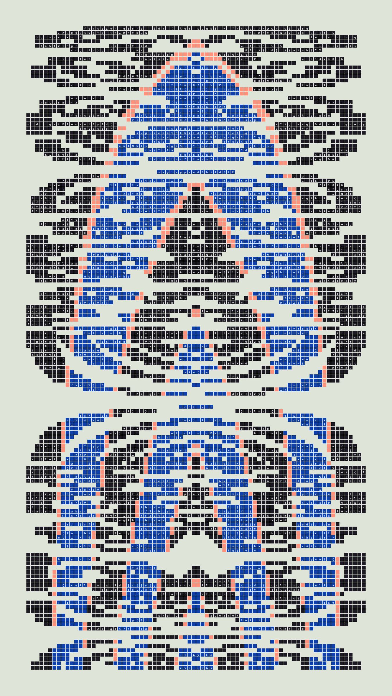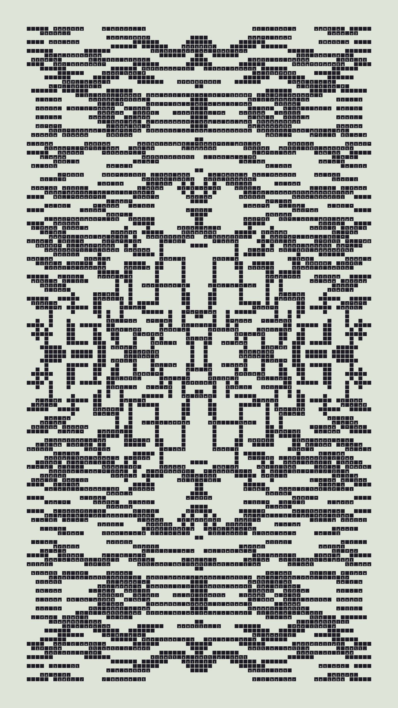 As opposed to creating the artwork directly, the main generator constructs a much smaller, specialized program that produces the visual output, including a layout of its own source code into the work, as well as the mechanism to reproduce itself. In this way, Quines are both program listings and artworks.
