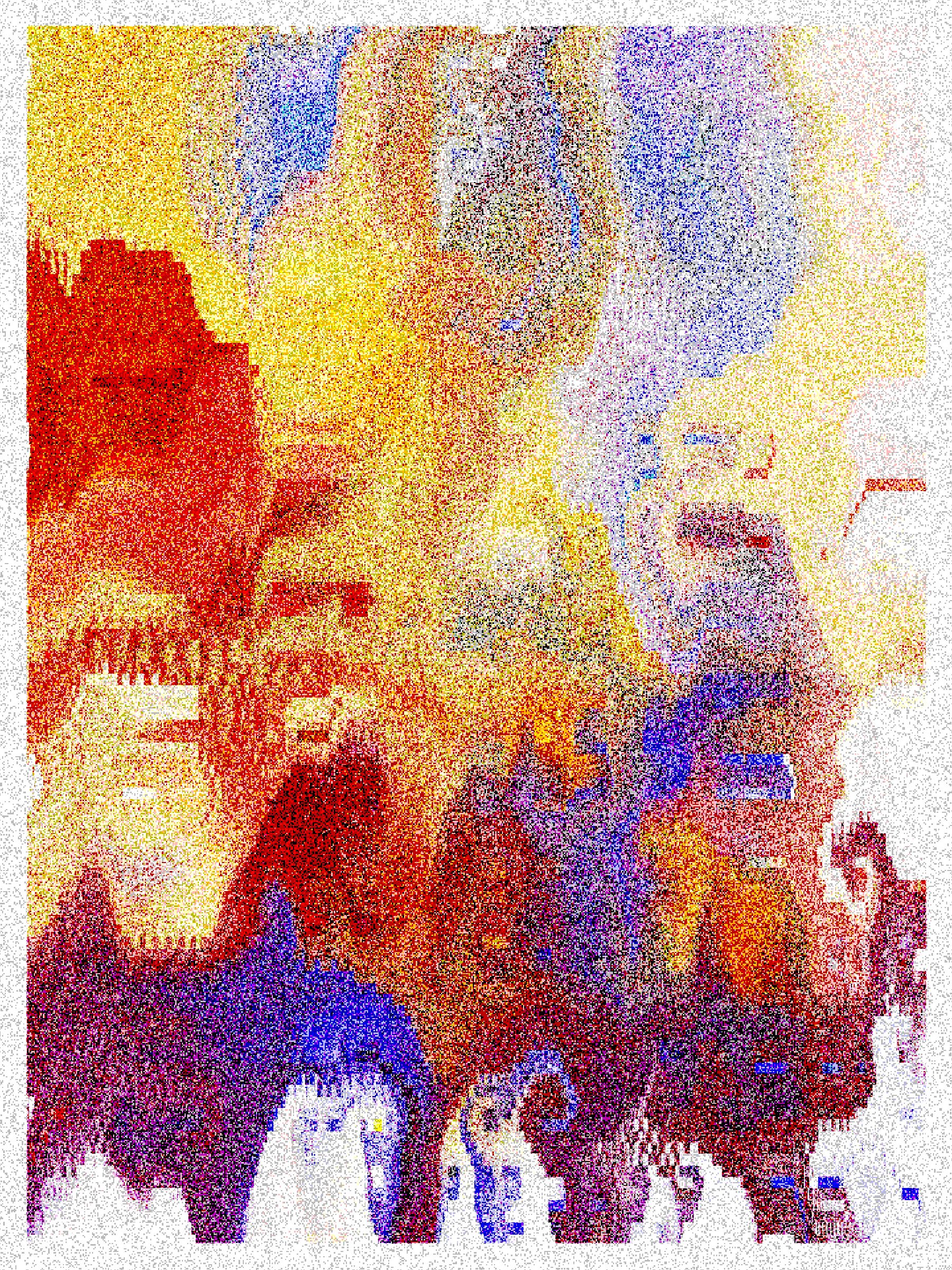 Rasterized procedural brush strokes with low transparency slowly layer themselves over each other in a rhythmic loop until they achieve colorful equilibrium. They continue to overpaint themselves endlessly. The resulting color mixtures are then quantized and dithered to separate them into patches of pixels that recall the discrete materiality of the screen: a strictly digital variation on color field painting. The resulting texture is not a skeuomorphic grain but an overt reference to the universe of screens that surround us every day. Electric light arranged in a grid, fluttering and flickering everywhere all the time.