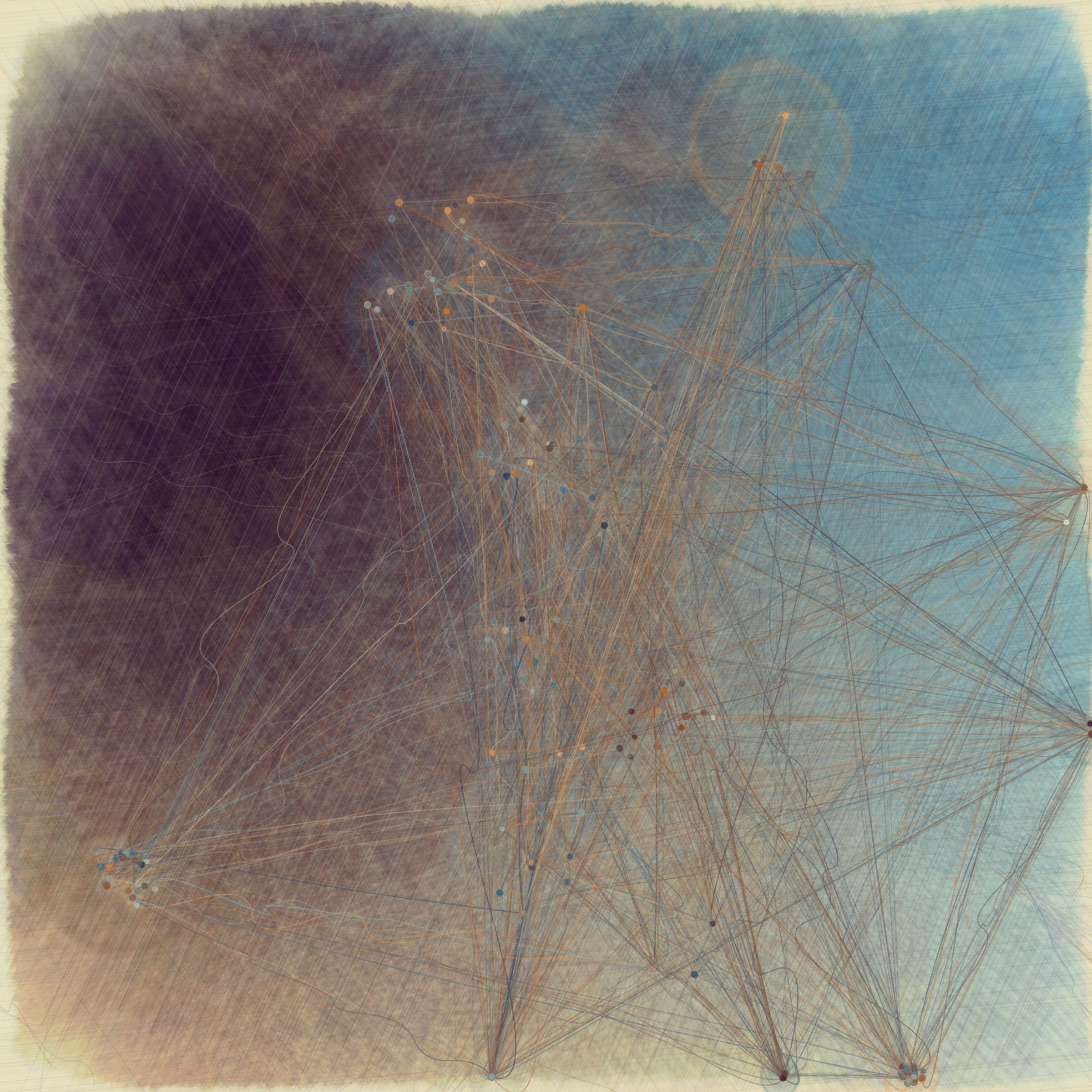 A recurrent theme in all his work is an attempt to create a simultaneous sense of both macro and micro vistas. In building the primitives for this project, he was inspired by images of both microorganisms and vast skeletal gas clouds in interstellar nurseries revealed by the James Webb Telescope. He often has the sense, when looking out into the cosmos, that this might be what it's like for a cell or even an atom looking around at its neighbors and unfathomably distant cousins. In this way, he is filled with a sense that we ourselves might be nodes in a much larger self-aware network.
