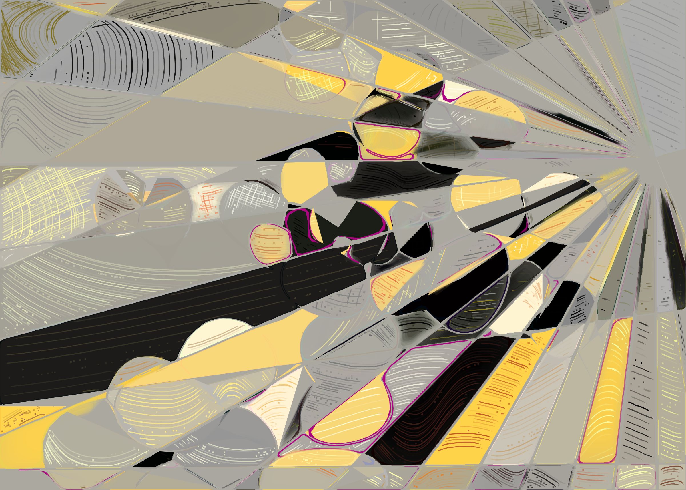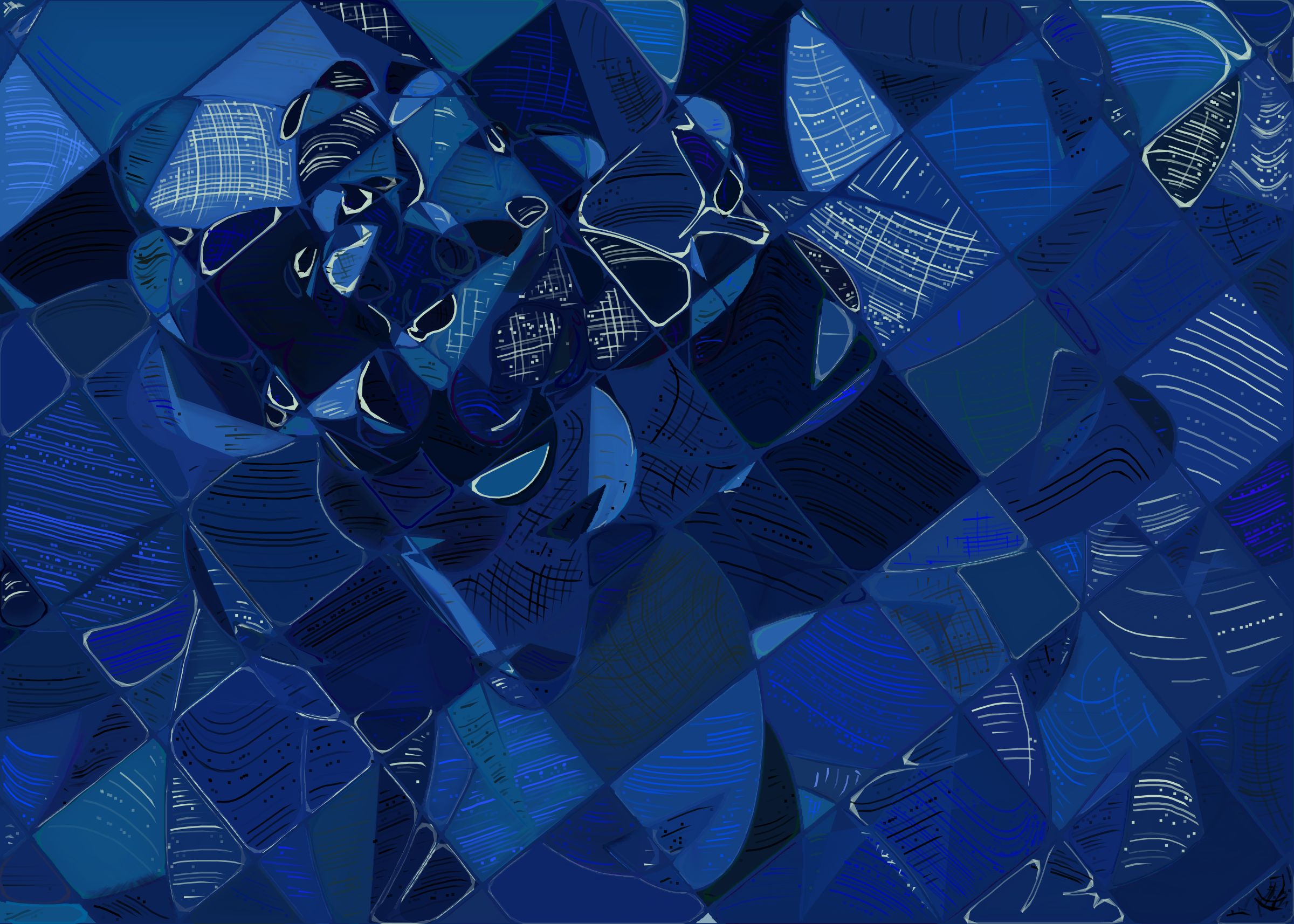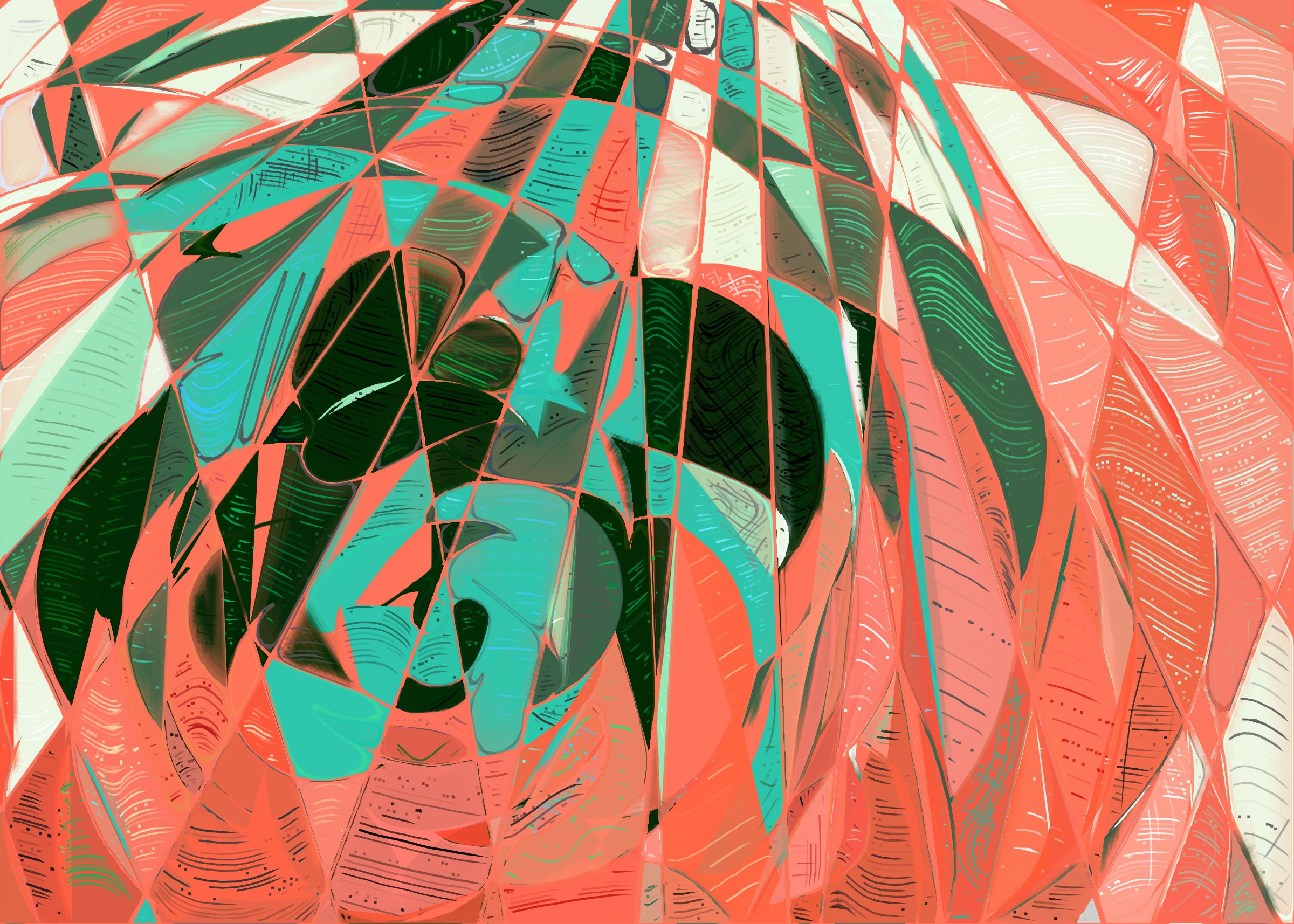 The rendering of Running Moon is inspired by stained glass and watercolor. It captures the sharpness of the glass and the softness of light using abstract forms. As organic shapes gradually expand to fill the space, brush-pen-like stripes solder these pieces together to form intricate compositions.