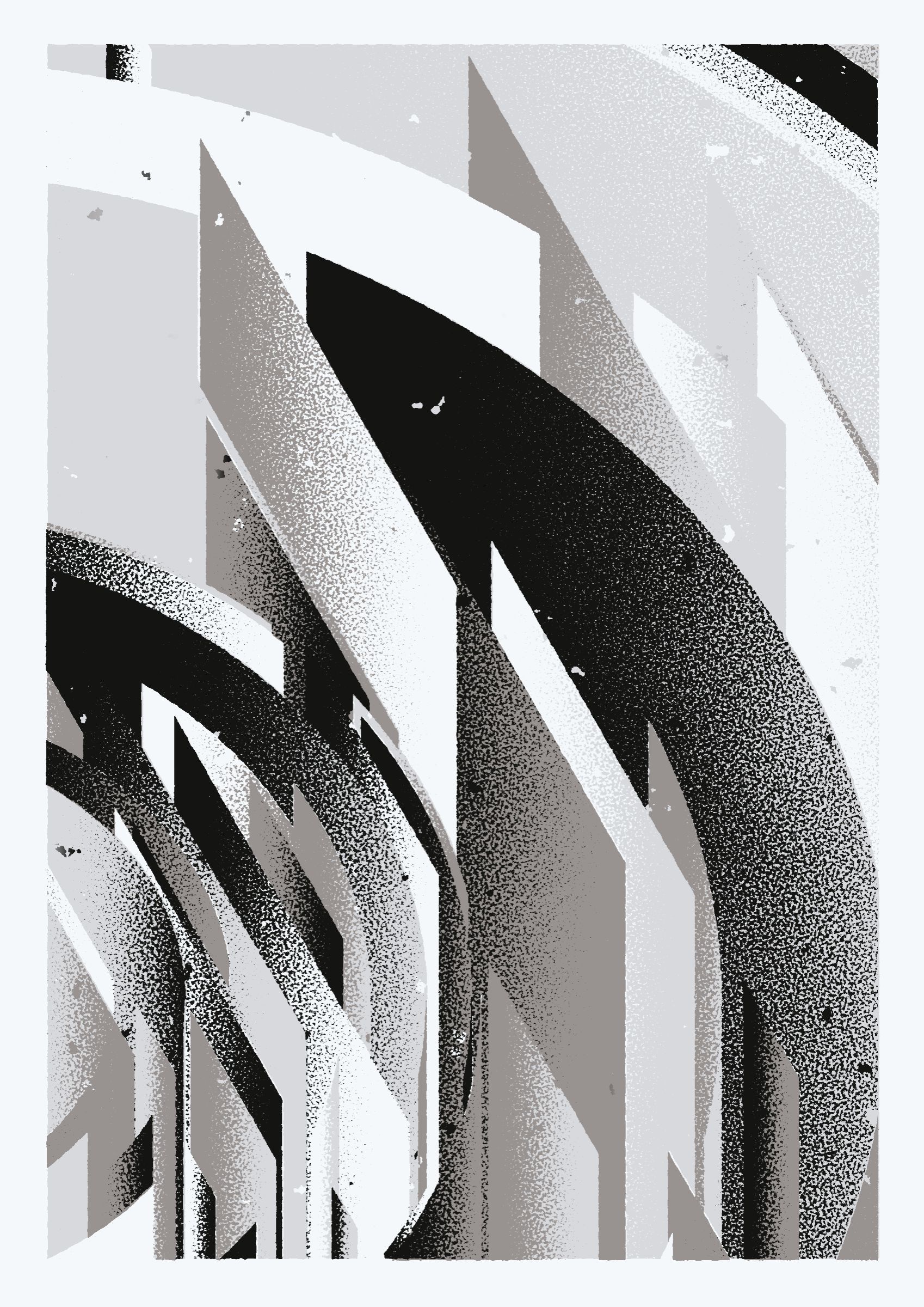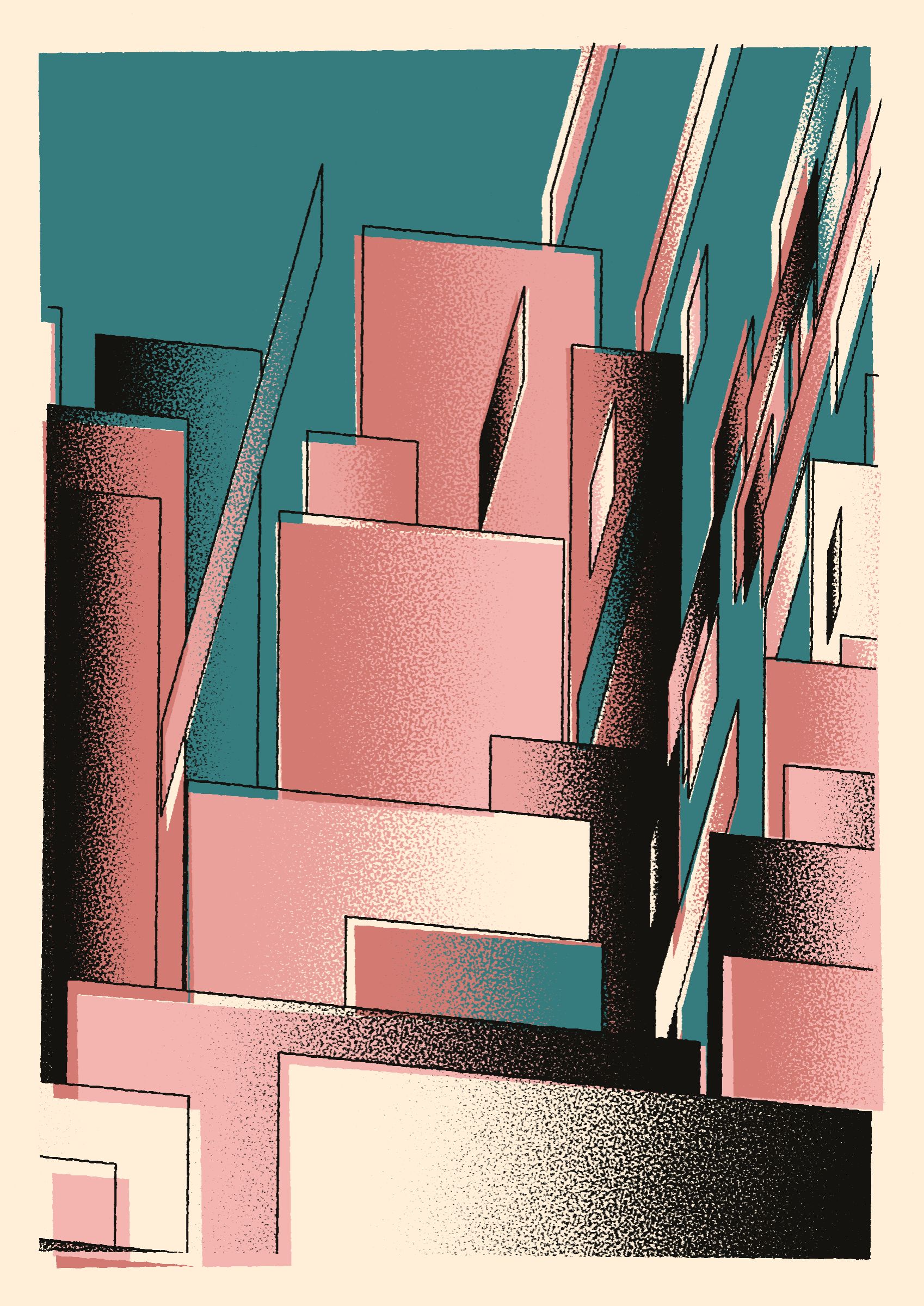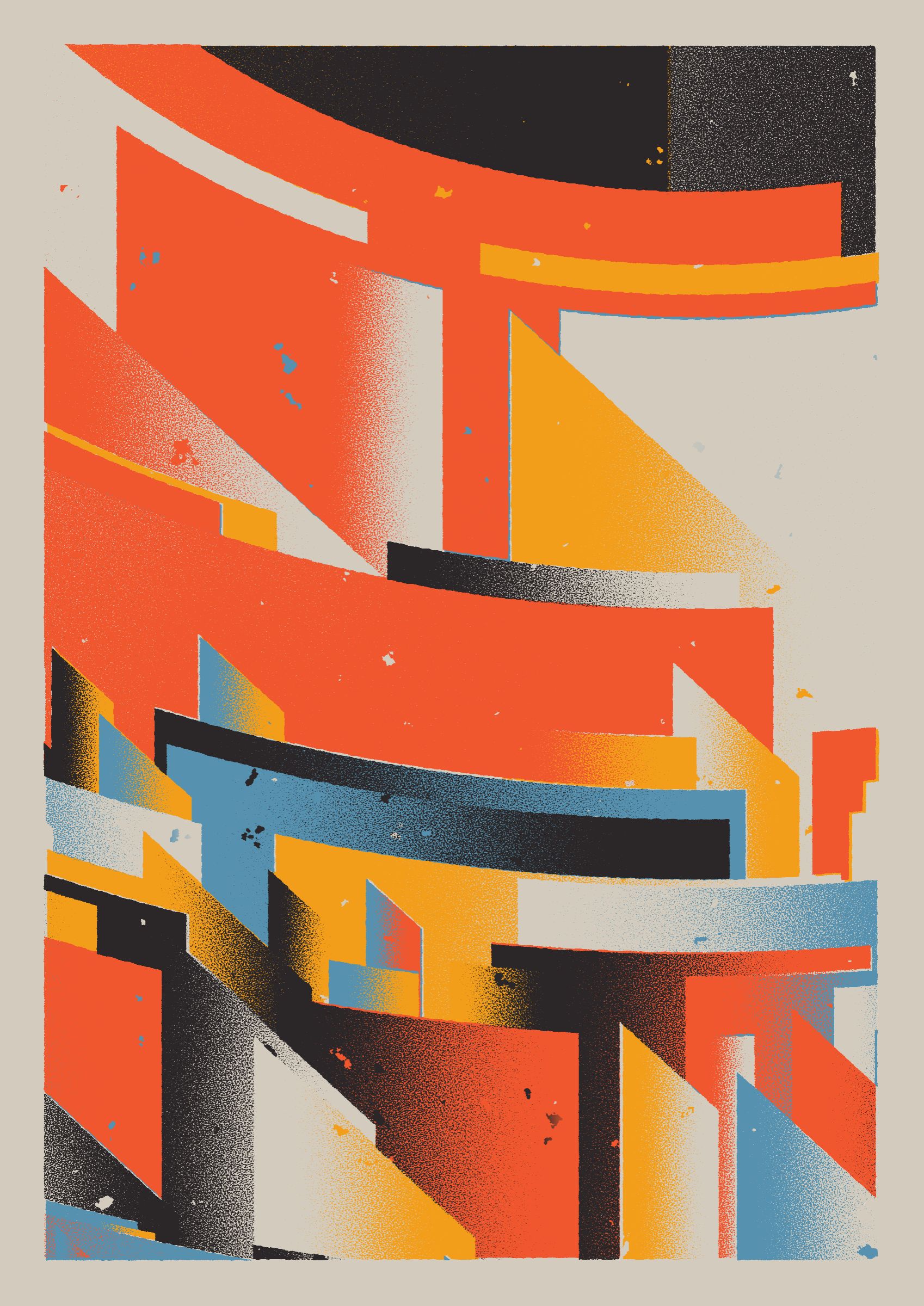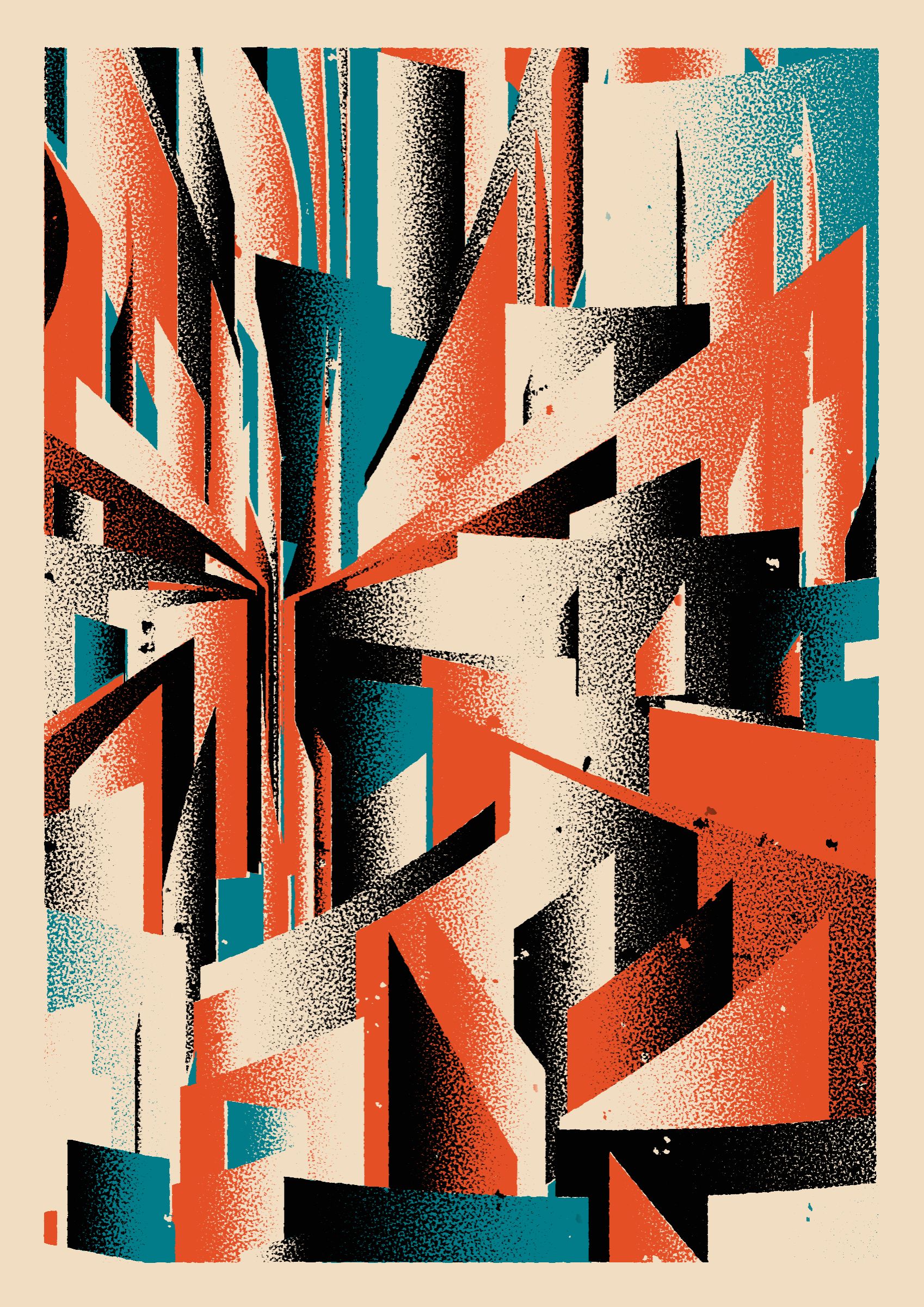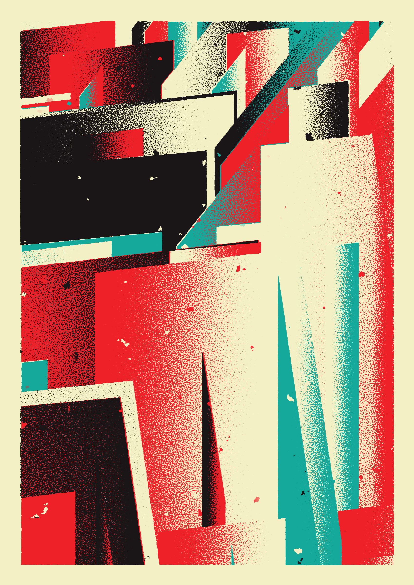 The generative system underlying the rendering mimics the screen printing process by rendering and applying a single color at a time to a master image. Each virtual screen may be more or less aligned with the master, creating a lovely flawed balance to the precision of the rendered geometry.
