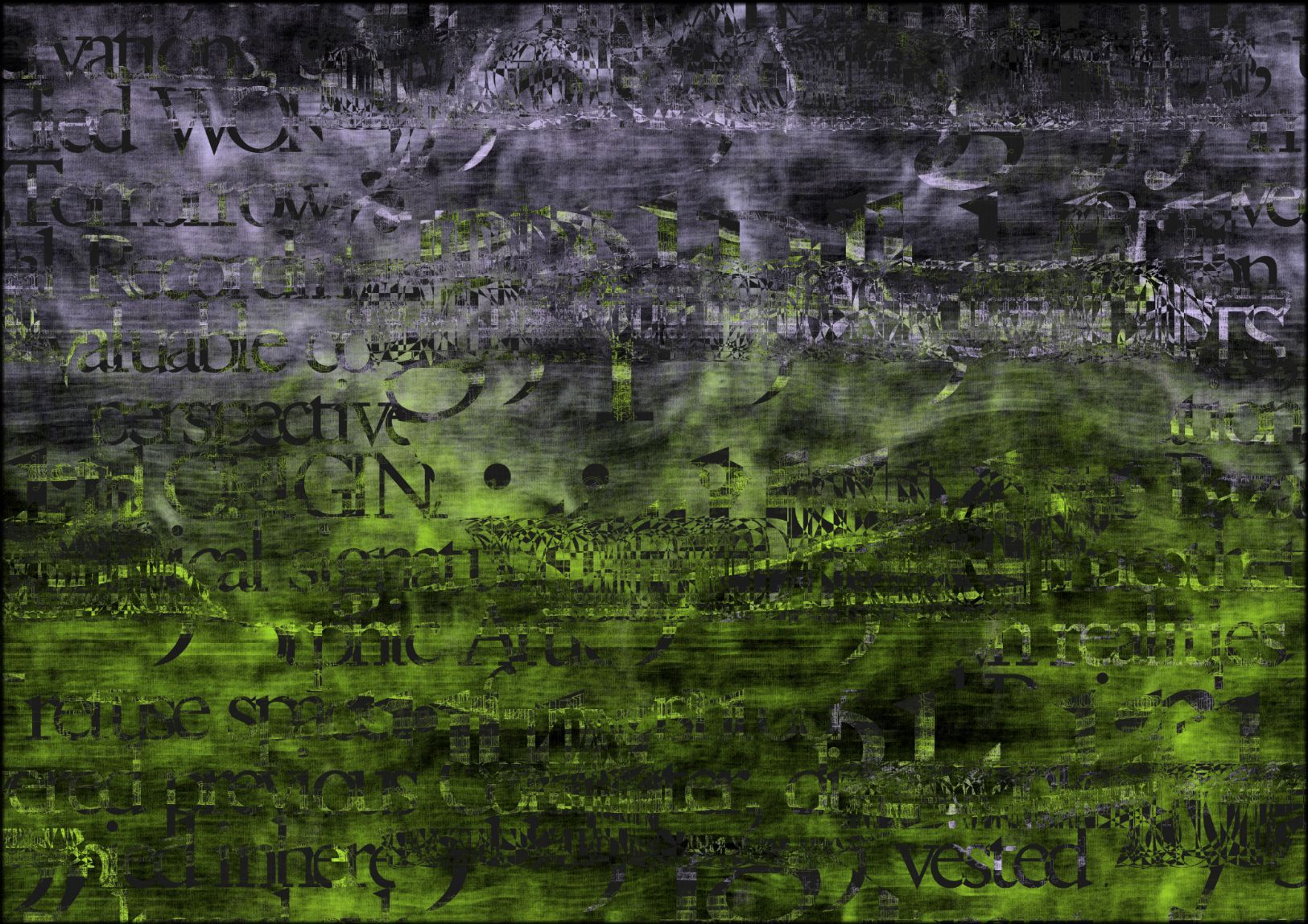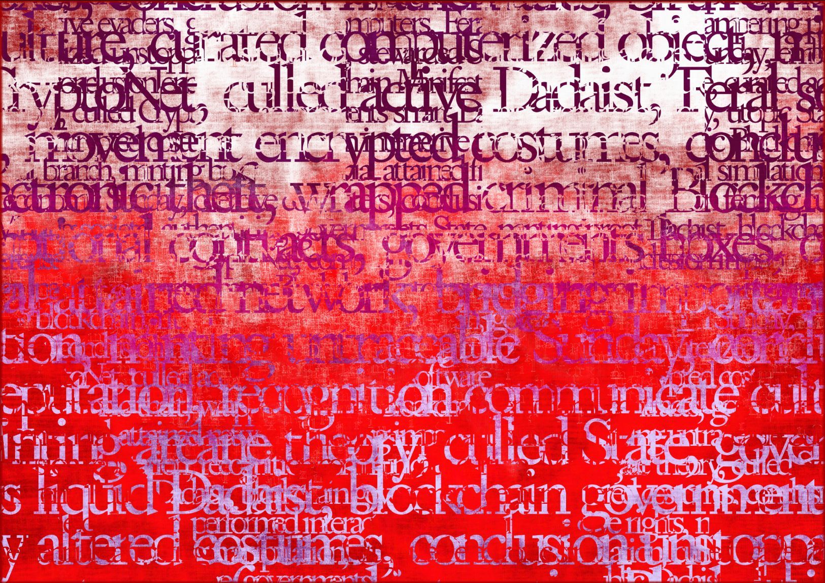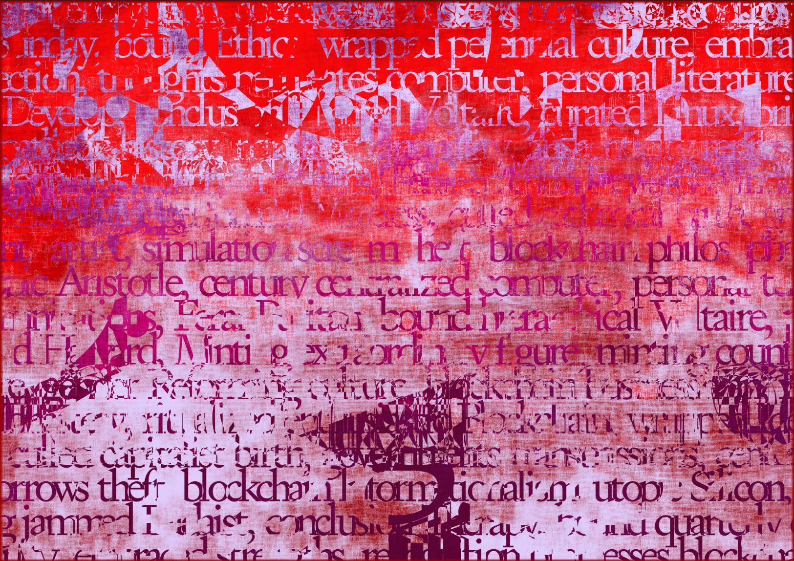 Referencing the importance of blockchains as a new form of publishing, and the idea of NFTs as fundamentally made out of text, the works poetically distill the pre-history of NFTs into large contemporary digital color fields paintings. Each artwork, made entirely out of text, is a collision of two source texts, violently collided together using NLP algorithms to create new histories.