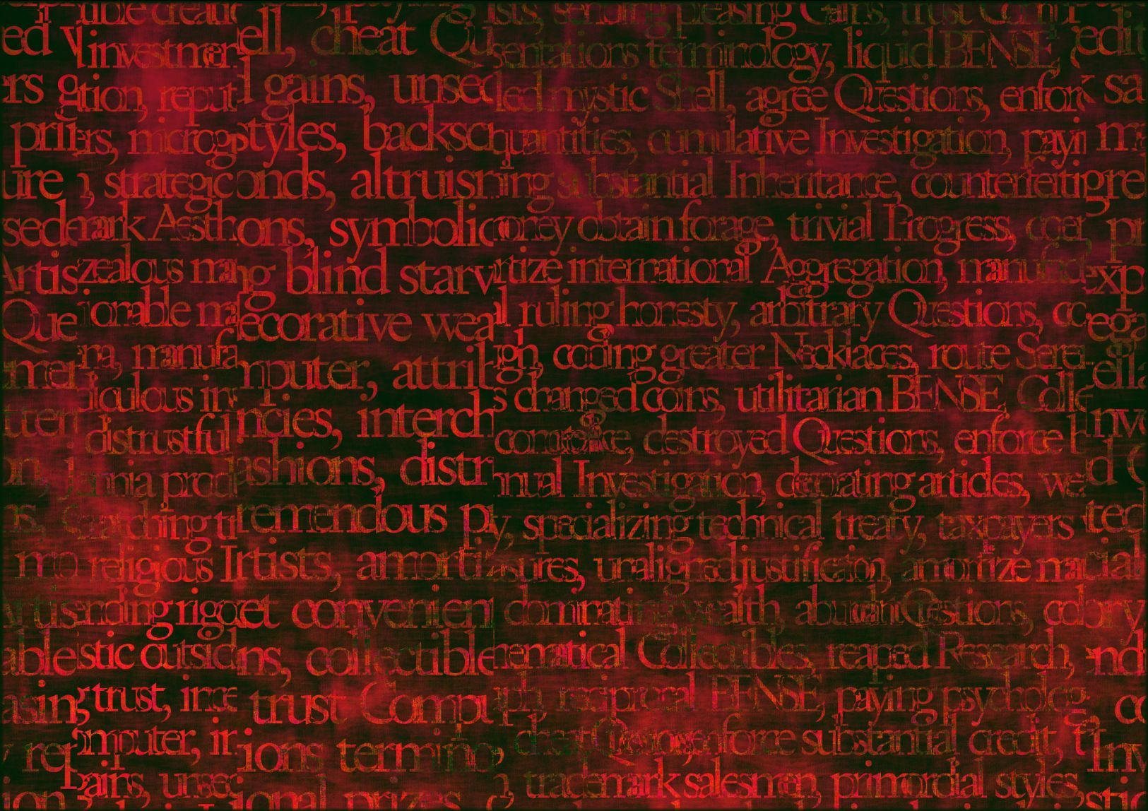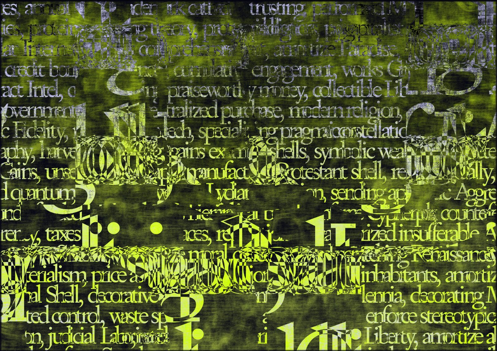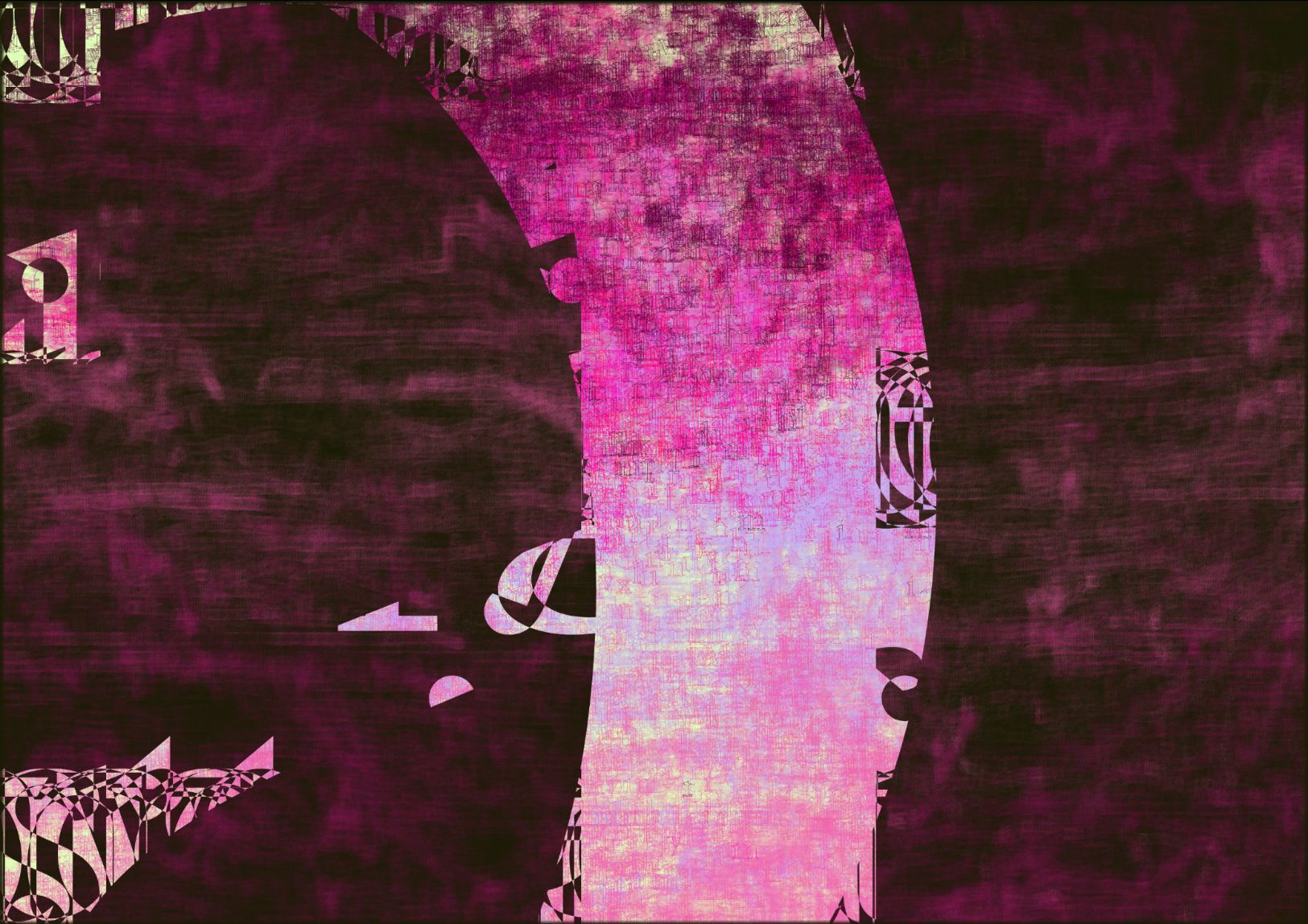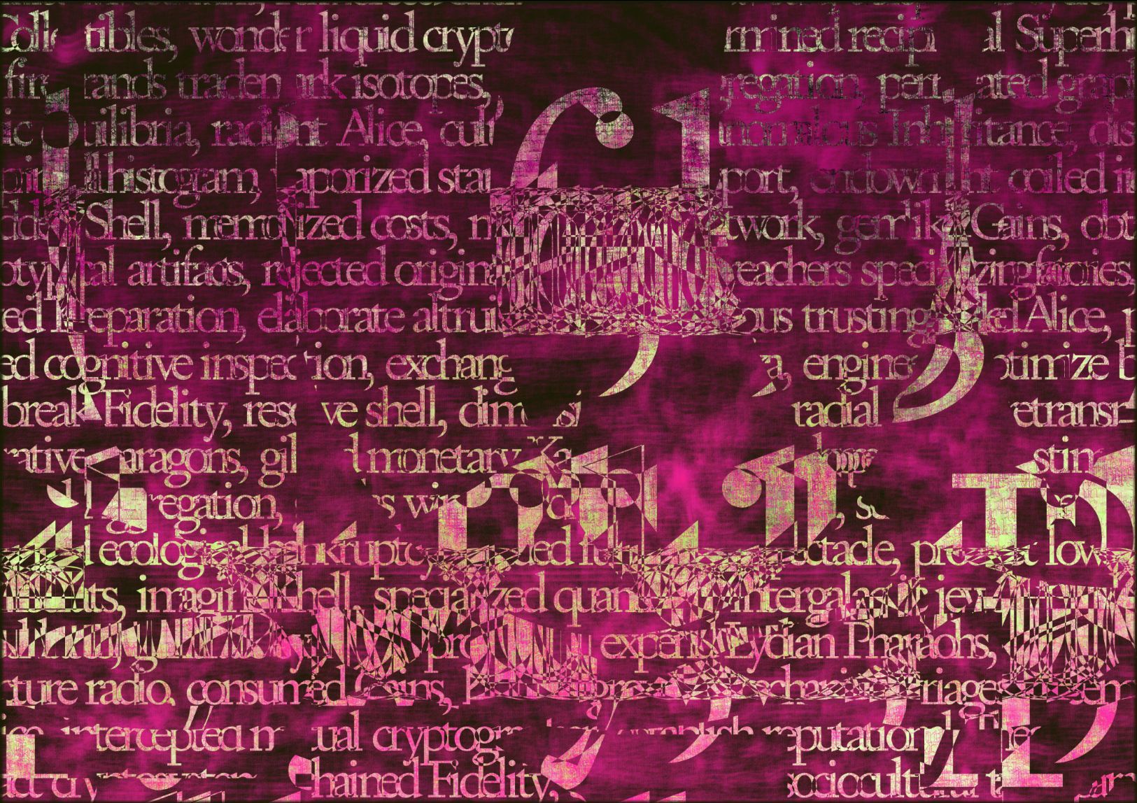 Referencing the importance of blockchains as a new form of publishing, and the idea of NFTs as fundamentally made out of text, the works poetically distill the pre-history of NFTs into large contemporary digital color fields paintings. Each artwork, made entirely out of text, is a collision of two source texts, violently collided together using NLP algorithms to create new histories.