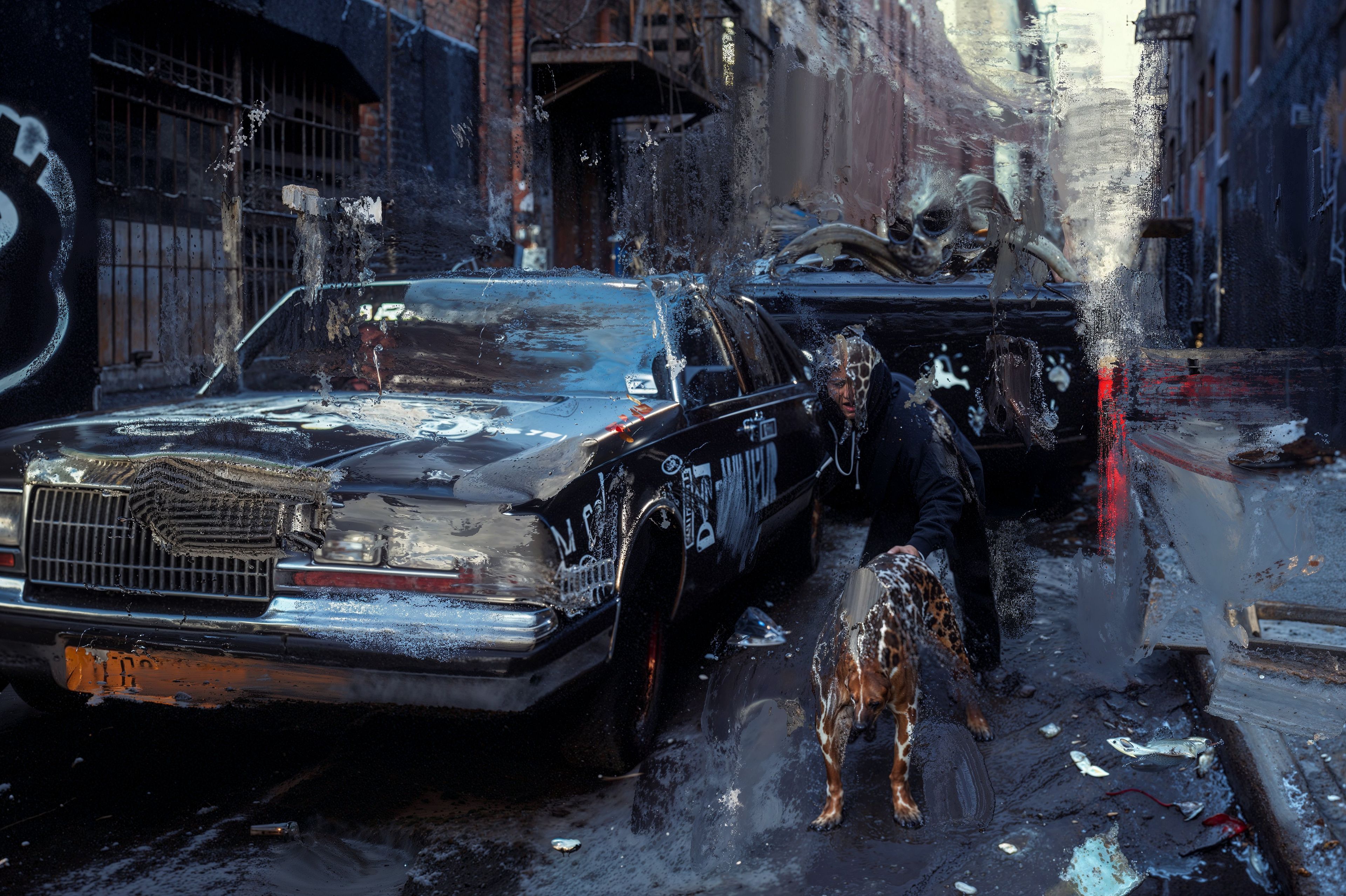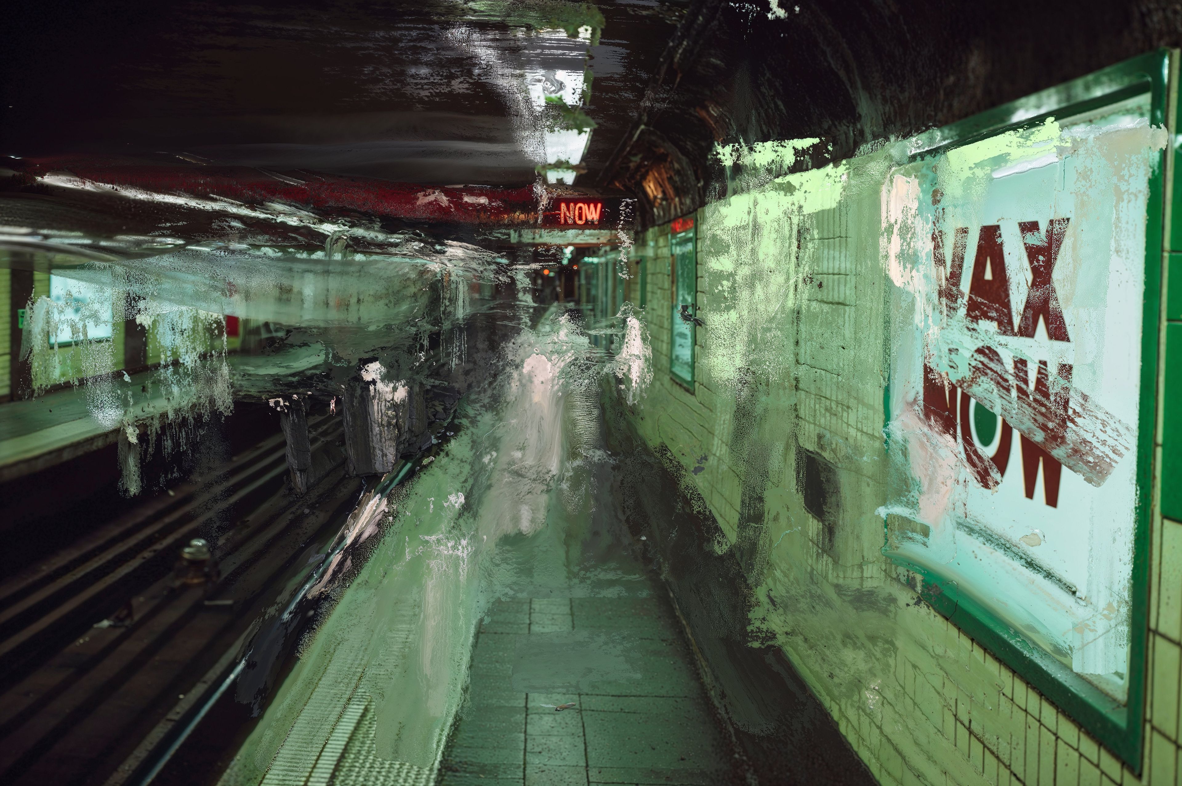 THIS TECHNOCRATIC TOWN is a body of 100 unique postpaintings chronicling a society ruled not by myth or charisma, but by the hum of infrastructure and chemical compliance. Big Pharma, food conglomerates, and surveillance capital pose as caretakers while draining vitality. Images are familiar yet corrupted: a cheeseburger revered like a relic, subway walls preaching medicine as liturgy, drones eclipsing graffiti. Here, nourishment is poisoned, health mandated, rebellion commodified. Choice is an illusion — you may consume, but only from their menu. The works offer no solutions, only residue and corrosion, with paint smearing across photographic surfaces like a virus destabilizing the system. This is not nostalgia but diagnosis: a town governed by data, fed by laboratories, where control masquerades as care and progress is hollowed out by profit.