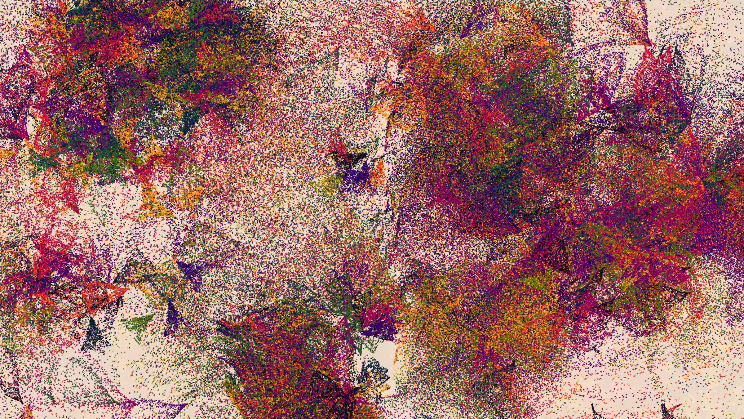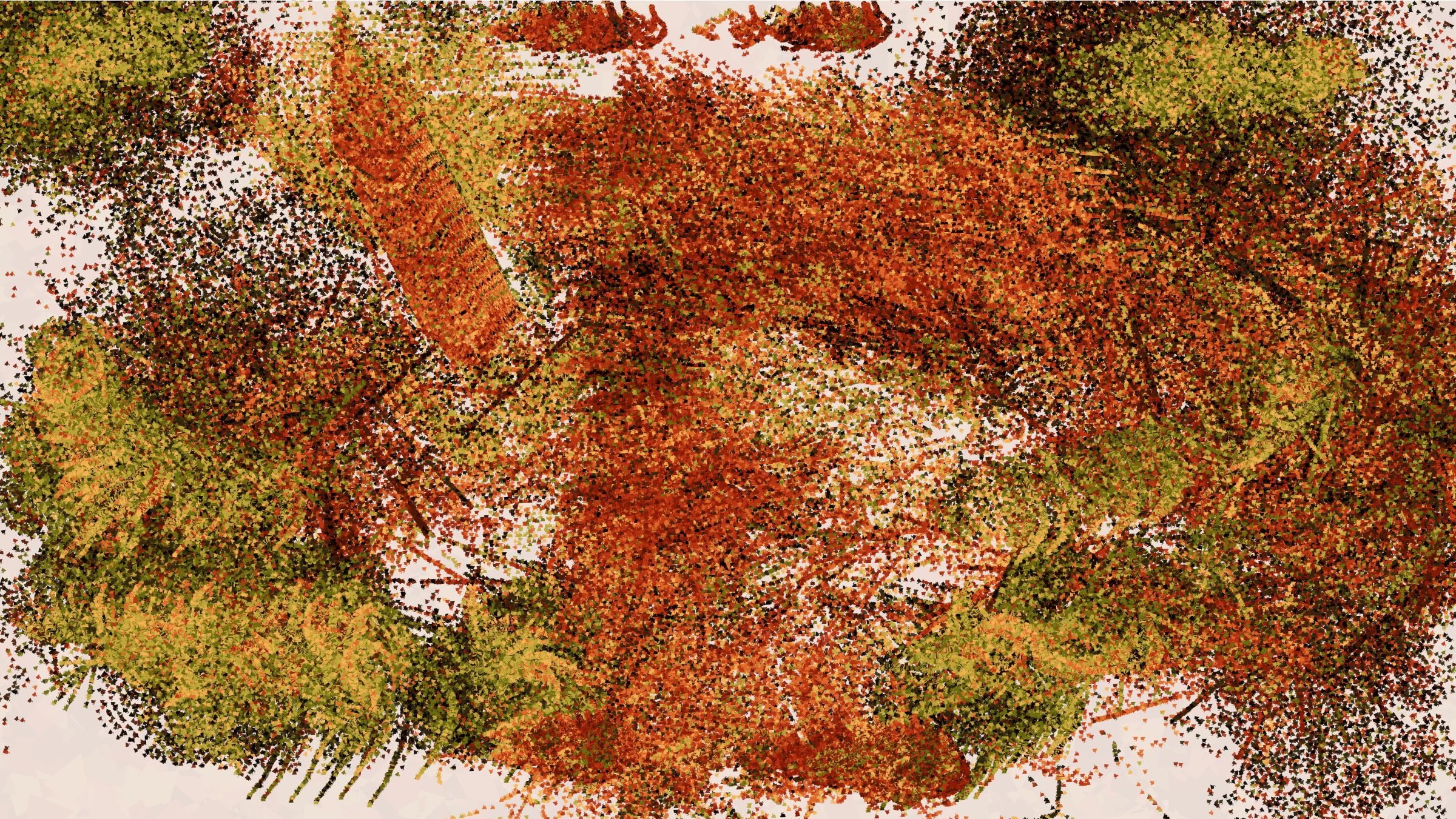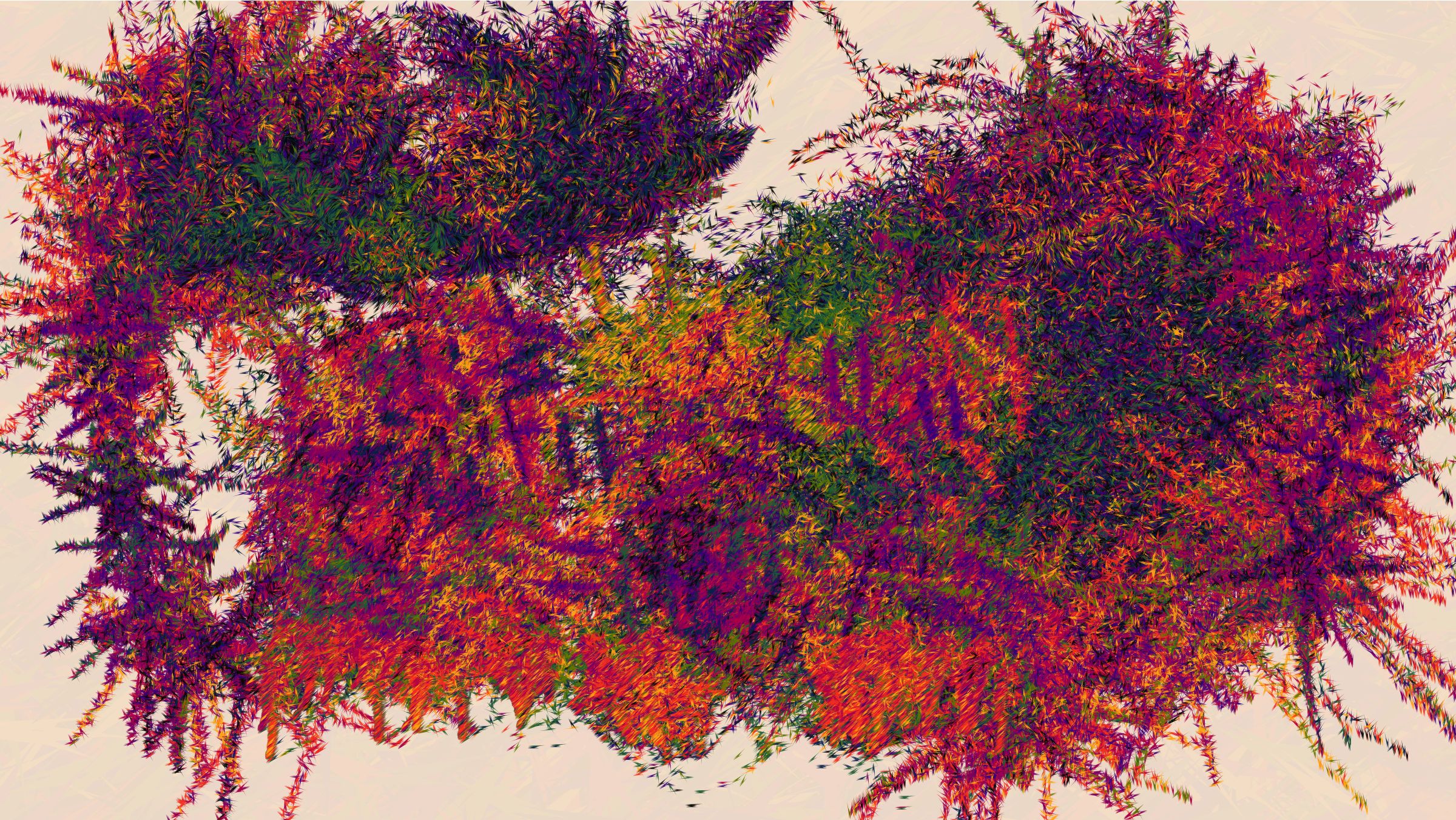Through Curved Air also takes inspiration from the paintings of Joan Mitchell. I was drawn to her expressive strokes, vibrant colors, and use of negative space, all of which come together to give a more intense feeling of looking at a landscape than just looking at a painting of a landscape. Her energetic marks clearly communicate that there is a human being behind the art. The marks of generative works are often similarly representative of the underlying process, but instead of drawing focus to the artist behind the piece, they draw attention to the algorithm. To convey human emotion in the way I intended, I had to use a subtler algorithm.