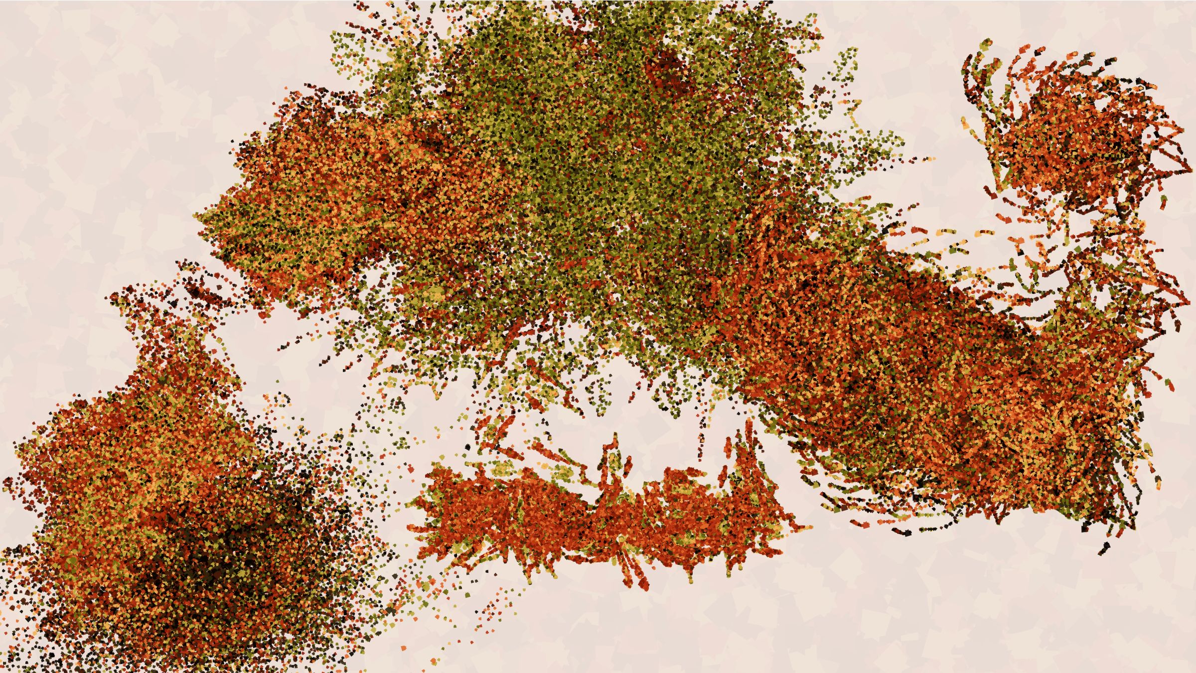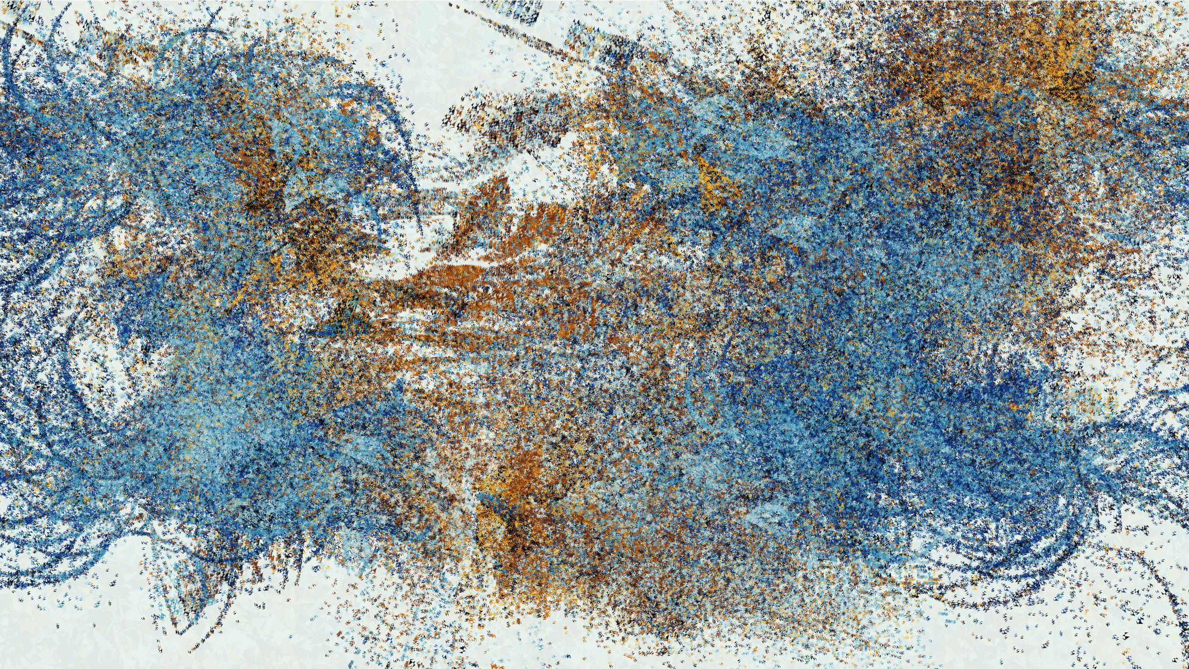 The technical tools to convey this emotion are tools I have been consistently developing in my practice. I love making generative art because I can design a system where I understand how all the components work, but they can still come together to produce a result that surprises me. The algorithm behind the compositional variation in my earlier works Coquina and Primordial is one I continued to evolve, and it rests at the heart of Through Curved Air. In fact, I pushed it further than ever, using it to create the individual shapes that form the building block of each output. This emergent variation permeates the work and results in surprising images that more closely resemble paintings than anything I made previously. I believe the potential for surprise is key to conveying emotion through code. When the possibility space of the algorithm grows too large to understand, the mind wanders to the person behind the algorithm. Perhaps the human element is the struggle to understand, or the struggle to be understood.
