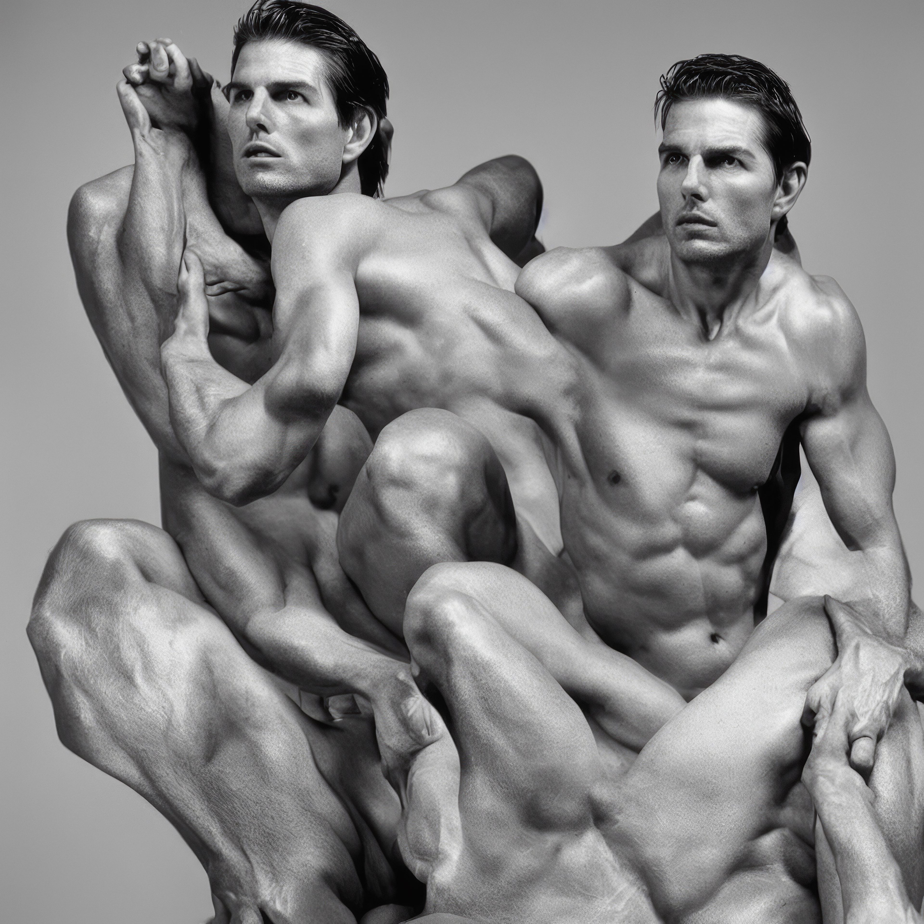 Instead of using an amalgamation of unknown synthetic people or a smattering of celebrities, Noya explores the extreme expression of the ultimate cultural icon and male sex symbol, Hollywood’s very own Übermensch: Tom Cruise. Tom’s face and the implicit edges of his varied public persona were ultimately the perfect conduit for the ultimate fashion-inspired-erotic-narcisistic-impossible-bodies post-photography series.