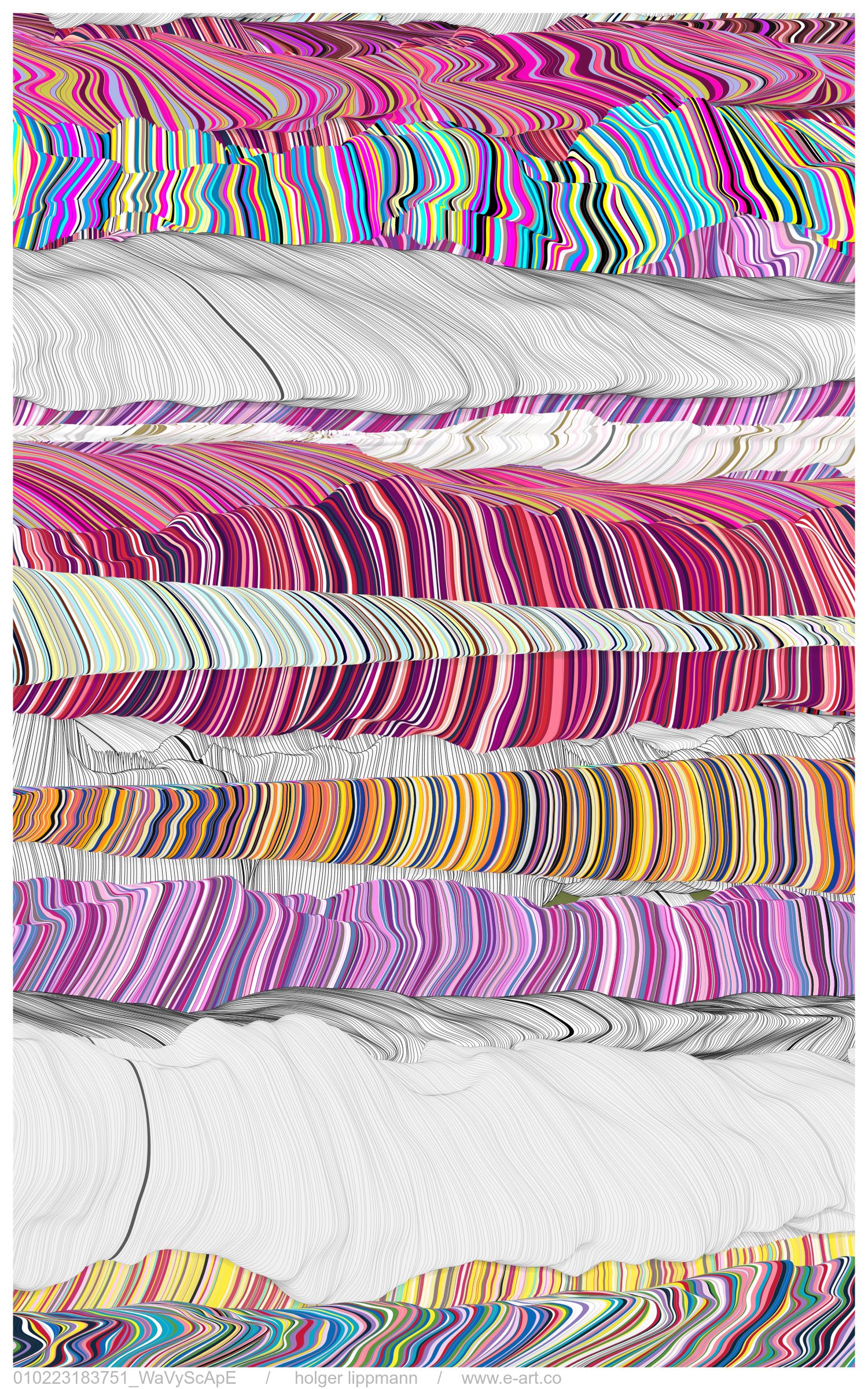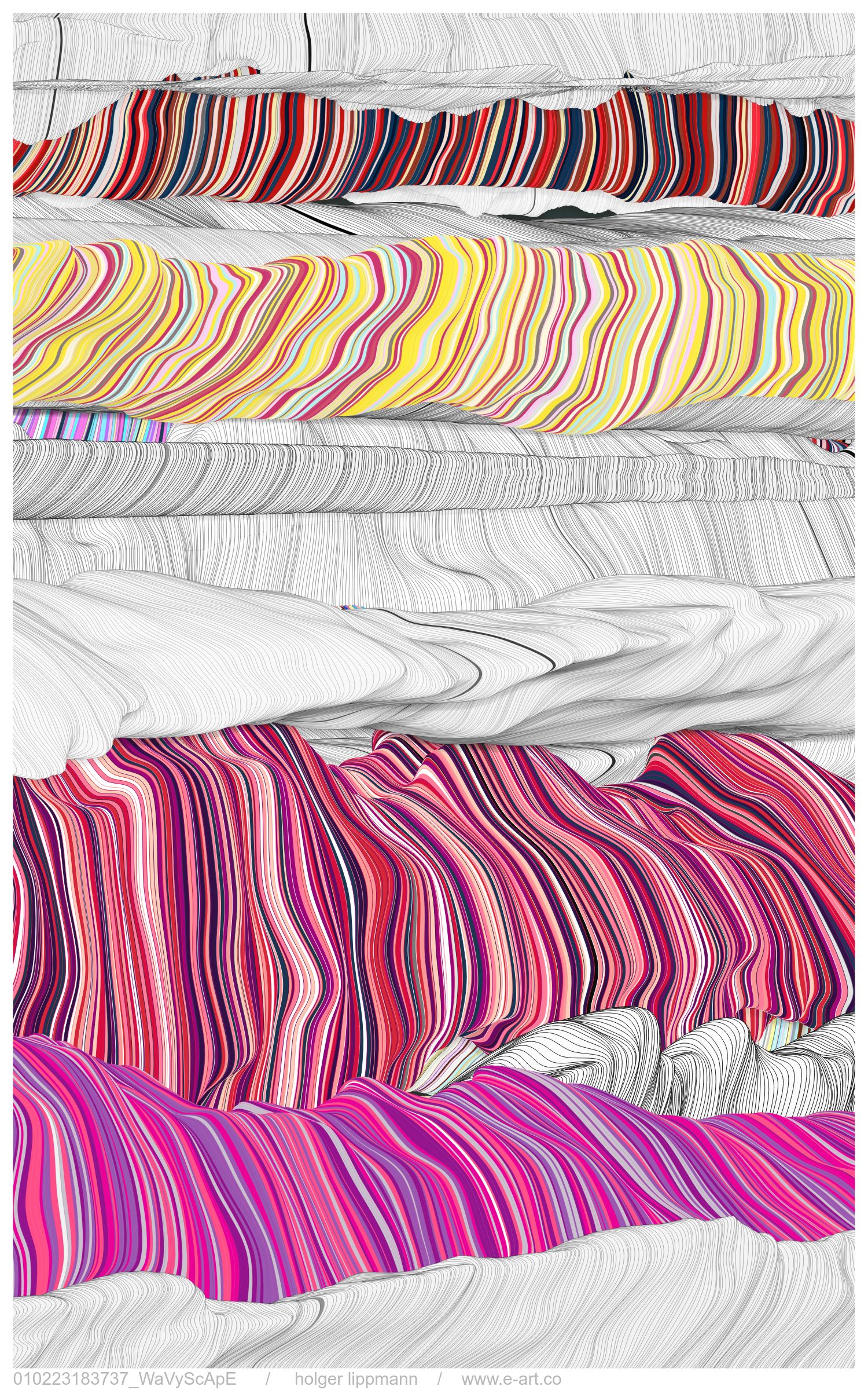 nevertheless, it's not my ambition to create landscape illustrations. rather, through the joy of playing with code, many different abstract structures led me to this sort of linear turbulence, which can sometimes leave a pleasant impression of “familiarity”. however, an openness that stimulates the imagination has always been important to me.