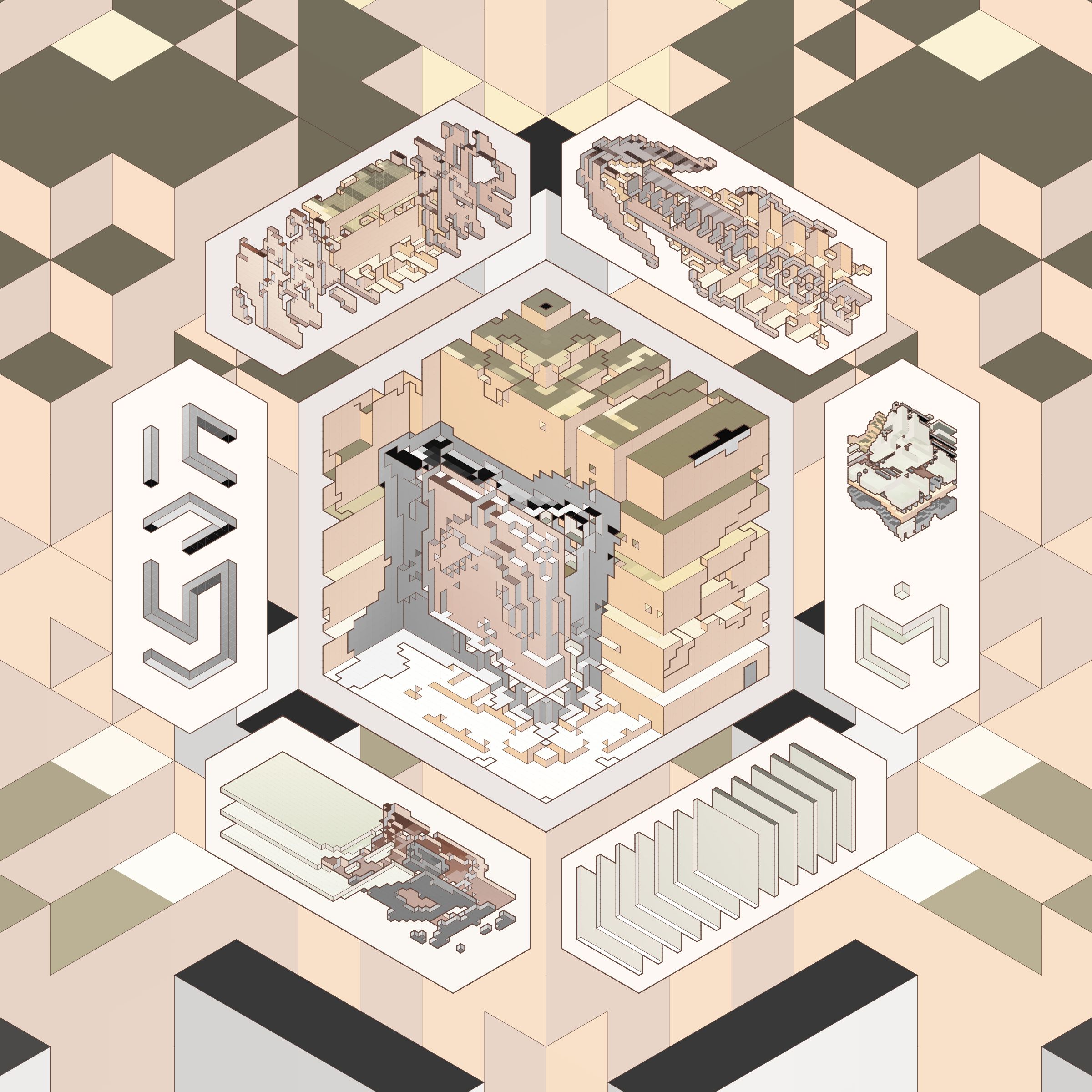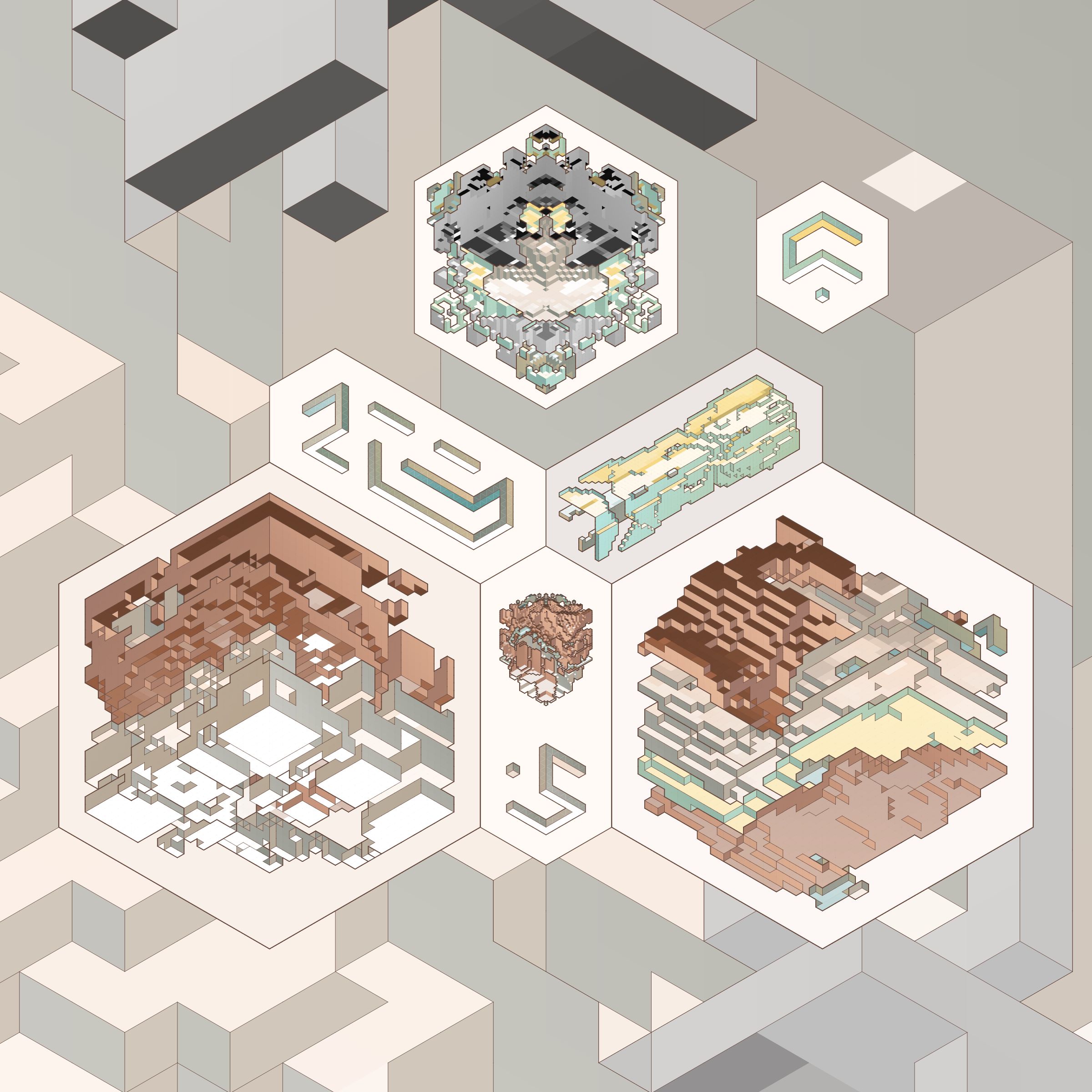 structures layered like sediment, anthropogenic traces intertwined with geological formations.